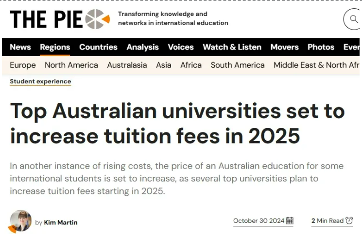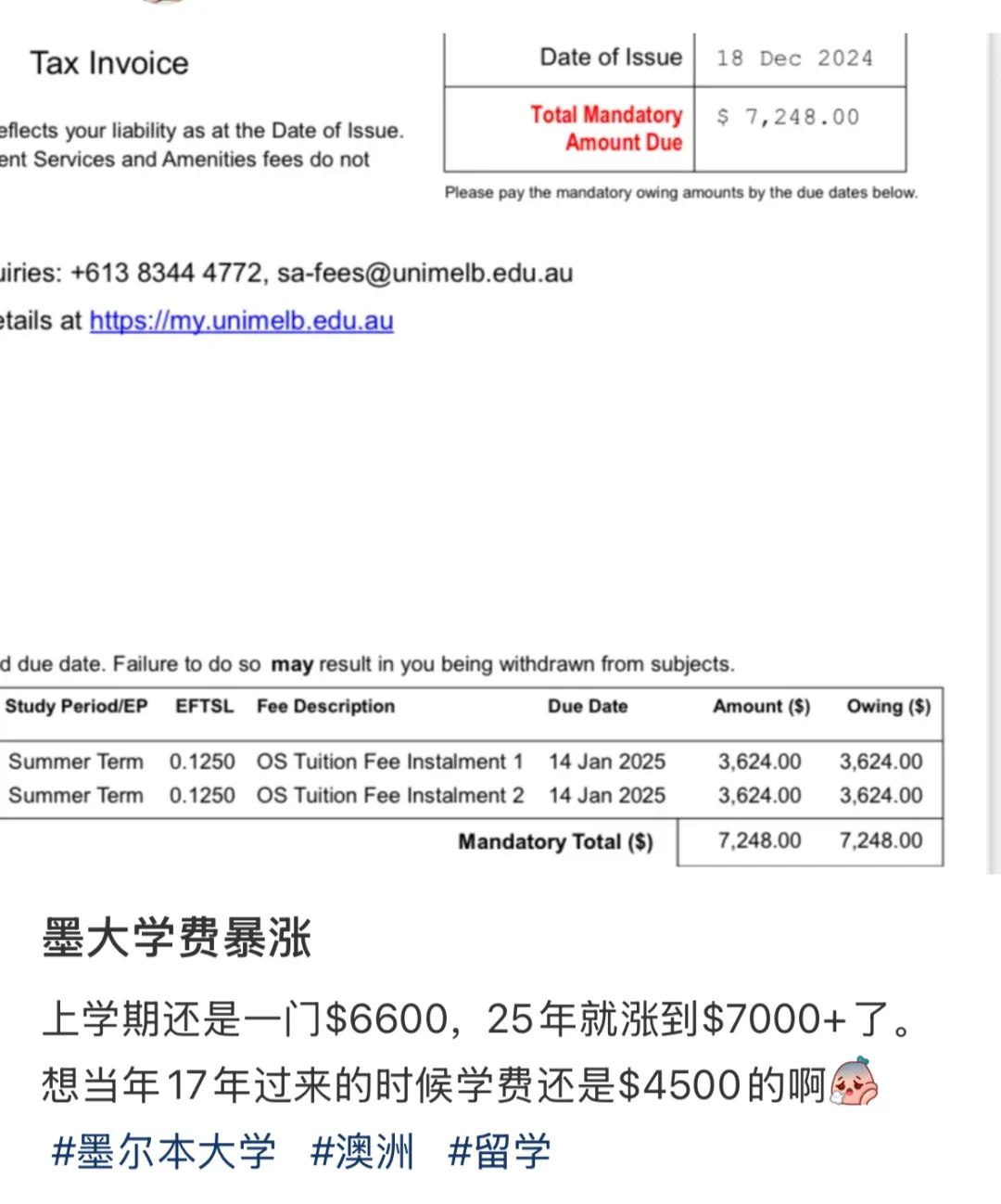 据《澳洲人报》报道,从2025年开始,澳洲的顶尖大学将继续大幅提高国际学生的学费!![]() 图源:《澳洲人报》 2025年澳洲各大学学费暴涨 墨尔本大学 以热门专业为例,商科和工程类专业的学费已突破每年50,000澳元,而医学类专业的学费更是高达每年70,000澳元。 对于国际学生而言,留学成本本就包括学费和生活成本两部分,学费飙升,再加上生活成本的增加,这使得他们在异国求学的压力变得更加巨大。 在社交媒体上,许多留学生纷纷表示,学费涨的太贵,要付不起学费了... ![]() 另外,墨尔本大学将只接受学生在其国籍所在地、最近学历课程所在地或者常驻地/工作所在地参加的英语语言考试,不再接受线上英语考试,不接受雅思拼分。 ![]() 墨尔本大学大幅提升了不少专业研究生的入学语言要求。 比如最受大家喜爱的商科研究生,原来的入读雅思语言要求是6.5(6),如今改为雅思总分7分,四个单项都要上6.5。 ![]() 新南威尔士大学 新南威尔士大学即将会把每学分从1140澳元提升到1220澳元,按照一年48个学分的标准,国际生明年普遍要支付58560澳元(约27.4万元),比今年要多出3840澳元(约1.8万元)。 对于一年之内涨了近2万元的学费,发言人称是成本太高,比如图书馆订阅、实验设备以及其他教育成本等花销巨大。 ![]() 悉尼大学 悉尼大学明年所有国际学生的学费将上调3%至4%,国际生需要为工程学位支付57700澳元,就读商科和法学的国际生则是53600澳元。 ![]() 澳大利亚国立大学 澳大利亚国立大学明年国际生的学费将上涨5.8%,最便宜的专业学费在44670澳元到59750澳元之间(约20.9万元到28万元),如果医学专业将高达95360澳元(约44.6万元)。 西悉尼大学 西悉尼大学明年文科学位学费将上涨到30952澳元(14.5万元),商科为34160澳元(16万元),信息技术专业则是36416澳元(17.1万元)。 该校坦言,学费上涨是出于行业基准和政府政策。 2025年澳洲留学成本一览 澳洲大学的学费基本上都要20多万元,如果是选择热门的商科、医学、理科学位,上限则可能达到八九十万,甚至上百万元。 学费上涨后,国际学生每年的留学成本预计会显著增加。接下来站站以在墨尔本学习生活为例,给大家介绍一下在澳洲留学的生活成本: 生活成本