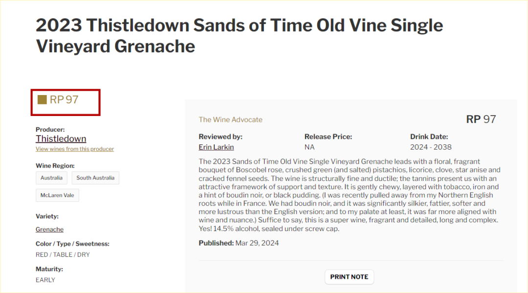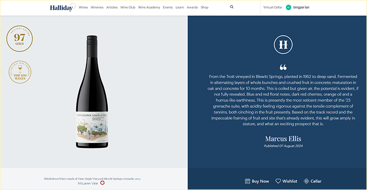 ![]() 酒哥荐酒 总第1795款 ![]() 澳洲有这么一家“妙趣横生”的小众膜拜Thistledown(译为“紫绒”),短短14年就从无名之辈一跃成为James Halliday澳洲酒庄分级中的蕞高红五星酒庄,并在蕞新2024年度百大酒庄榜单中位列第29名。 Thistledown的幕后大佬,则是当地赫赫有名的葡萄酒大师Giles Cooke MW和Fergal Tynan MW,公认的歌海娜狂热分子。二人踏遍澳洲收购酒园,在Barossa Valley和McLaren Valley两大古老歌海娜产区拥有多数优质老藤。 ![]() Giles Cooke偏爱使用MC法(二氧化碳浸渍法,Mace Ration)赋予歌海娜优雅框架、饱满多汁的果味、鲜活酸度和轻盈口感。酒庄全系列都并秉承小批量酿造,奉行极简主义酿酒,出品被誉为“液体丝绒”,多次入围James Halliday“百大酒款”、“蕞好歌海娜”之列..... ![]() Thistledown Sands of Time Grenache 2023 紫绒时间之沙歌海娜 ![]() Robert Parker&James Halliday双97高分年份,入选Halliday Wine Companion 2024年度百大酒款(Top 100 Wines)和“特别超值”(Special Value)。来自全澳大利亚蕞优秀歌海娜产区Blewitt Springs,富含沙质土壤之上的75年老藤,部分去梗、大多整串温柔压榨萃取,在混酿土罐中发酵,之后转入成熟橡木桶和混酿土罐中陈酿10个月,未过滤装瓶,散发着柔美檀香、干橘子、紫罗兰玫瑰、野生草莓和肉桂木质香料,美妙可口。 ![]() ![]() 97分,Robert Parker: “2023年份的老藤时间之沙歌海娜散发着芳香玫瑰花瓣、碾碎绿色海盐开心果、甘草、丁香、八角和碎蕨种子。结构精细、富有韧性的单宁赋予迷人的支撑和结构。温柔的咀嚼触感,分层的烟草、铁和一点布丁味,更丰腴圆润柔美、且富有光泽。这是一款很出色的歌海娜,芳香且悠长复杂。” ![]() 97分,James Halliday: “Blewitt Springs葡萄园深沙土、1952年种植的老藤歌海娜,在整串压碎果实和混凝土罐中发酵,橡木桶和混凝土罐中成熟10个月。潜力是显而易见的,蓝色和红色的花香、深红色樱桃、橙油和微微腐化的泥土,沉着稳重,被紧致的单宁和强烈酸度包裹,无懈可击的香气,将是令人兴奋的前景。” ![]() ![]() ![]() ![]() 关注「酒哥精选」 获取更多优惠和推荐 每周上新哦~ 近期推荐 ![]() ![]() ![]() ![]() ![]() ![]() ![]() |