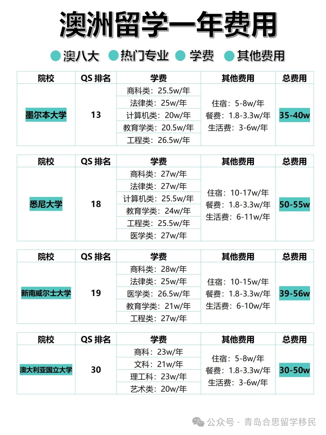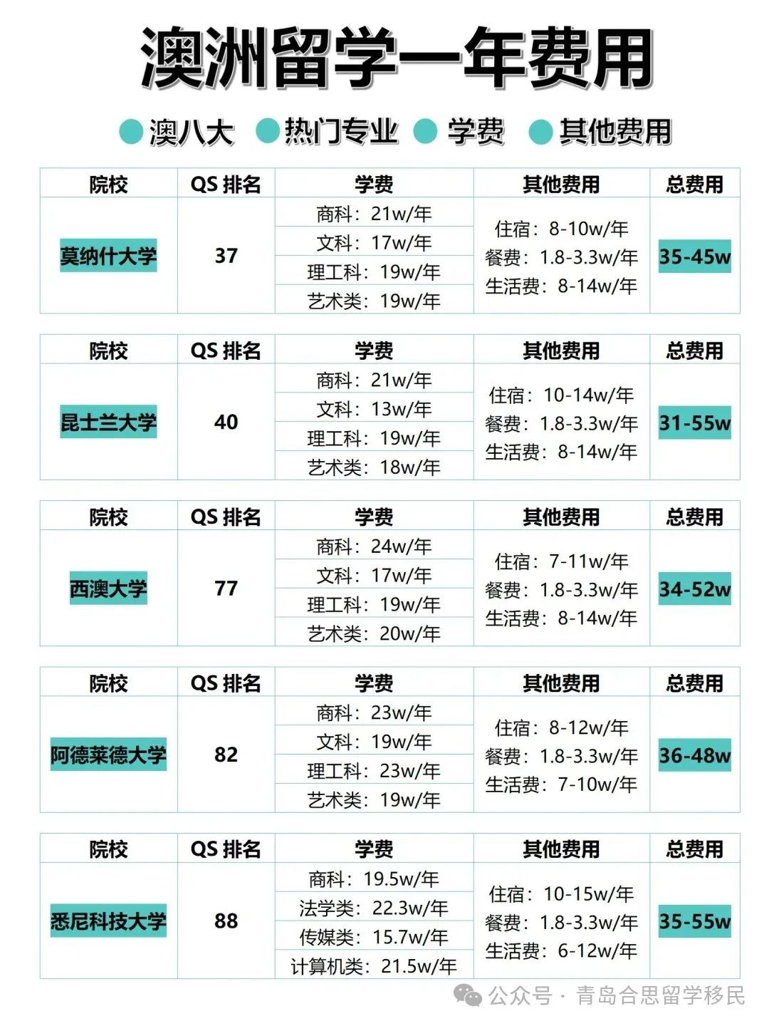 在2025年QS世界大学排名中,澳大利亚大学表现卓越,多所院校名列前茅,9所大学进入TOP100,3所大学进入TOP20。澳洲留学给人昂贵的印象,实际费用因学校和地区而异,以下是澳洲八大各热门专业的大概情况。![]() 以下是澳洲八大预估费用 ![]() ![]() ![]() ![]() 另外澳洲是对留学生兼职非常有好的国家~ 🔹工作时间:从2023年7月1日起,每两周工作时长不得超过48小时⏰。 🔹最低工资:从2024年7月1日起,最低薪资标准为24.10澳元/小时,或者915.90澳元/周💰。折合RMB大约为115元/小时,或者4370元/周。 🔹获得支持:留学生在兼职过程中可以获得多方面的支持。无论是政府部门、私人企业还是教育机构,都可以提供必要的帮助和指导🤝 学生可以根据自己的学业情况,合理安排打工时间,在兼职收入比较可观的情况下,可以cover掉一部分的生活费。 NEWS 如果想要咨询澳洲留学可以dd合思留学,随时解答各种疑问! ![]() |