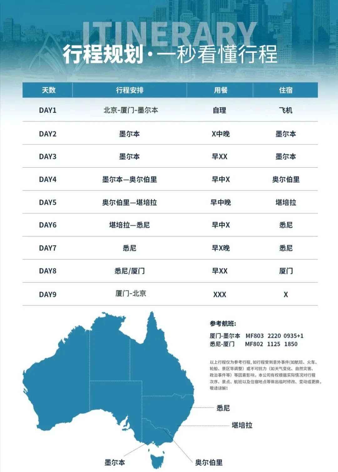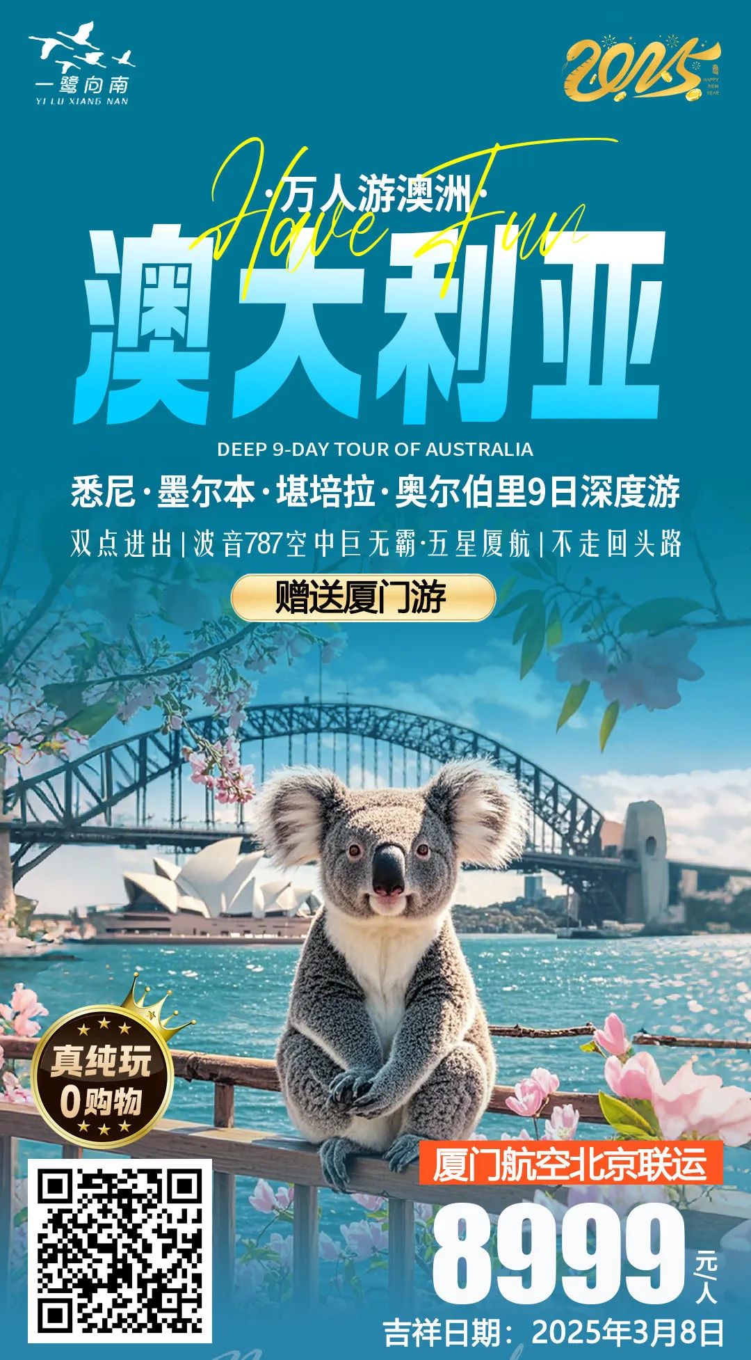 当北半球春意萌动时,南半球的澳大利亚正迎来最诗意的秋季。这个时候来澳大利亚,您看到是这样的:![]() 这样的: ![]() 秋季澳洲,褪去盛夏的炙热,阳光温柔地洒在金黄与深红的枝叶间,无论是城市的落日余晖,还是海岸线的壮丽景色,都更添一份深邃与静谧。《跟着BRTV去旅行》约您一起到澳大利亚感受秋日限定美景!3月8日与5月29日两个团期,时间随您选!9日纯享行程串联四大名城,零购物深度体验,让您收藏澳洲这一季的独特浪漫! ![]() 扫描海报内二维码查看线路详情👆 -澳大利亚9日深度游- 我要报名 悉尼、墨尔本、堪培拉、奥尔伯里 ![]() 点击放大查看 【行程团期及价格】3月8日、5月29日👉8999元/人 全程零购物全程入住3钻或4钻酒店悉尼、墨尔本分别连住2晚首都堪培拉住1晚赠送厦门游赠送人身意外险 ![]() 请携带国际信用卡或人民币现金可在机场或银行兑换澳元请自备护照,如签证在有效期内可免签证费900元/人 【咨询报名】旅行顾问:400-1919-808扫描海报内二维码查看澳大利亚线路及签证所需材料跟着BRTV去旅行-小V:(加小V请标注“澳大利亚”字样,工作时间给您回复) ![]() 打卡精华景点 ![]() 4大名城,必去之地一次联游! 傍晚的悉尼港,天空被染成琥珀色,歌剧院贝壳状屋顶与海港大桥的钢铁轮廓在夕阳下交织,宛如一幅暖色调油画,是拍照打卡的绝佳背景。 ![]() 悉尼皇家植物园,在秋天园区内枫树、橡树逐渐披上红黄外衣,麦考利夫人石椅旁的草坪铺满落叶,这可是秋日限定美景哦~ ![]() ![]() ![]() 秋天 ![]() 悉尼大学,作为英国经典电影《哈利・波特》系列的取景地之一,自带奇幻滤镜。踏入校园,仿若踏入了霍格沃茨的魔法世界,那些曾在大银幕上熠熠生辉的经典画面扑面而来,让人不禁沉醉其中,重温旧梦,开启一场与魔法不期而遇的梦幻之旅。 ![]() 堪培拉被誉为“大洋洲的花园城市”,在这里您可以看到全世界唯一向公众开放的国会大厦,这里每年3月都会举办热气球节,漫天的五彩热气球飘荡在这座花园首都的上空,伴着日光,每一秒都是享受。咱们的行程刚好是3月份,幸运的话或许能看到呢~ ![]() ![]() ![]() 秋季的墨尔本库克船长小屋,宛如一位静守岁月的时光老人,散发着浓郁醇厚的历史气息。这座石屋始建于 1755 年,其前身乃是伟大航海家库克船长住所。它静静地矗立于此,斜顶之上,瓦片层层叠叠,似在诉说往昔的风雨;石砌的墙面,镌刻着悠悠岁月的沧桑印记。 ![]() 如果您想看更极致的美景,建议您来墨尔本被誉为“全球最美公路”之一的大洋路,虽是自费但值得一去。这里有壮观的十二门徒岩,因其造型与《圣经》中的12门徒相似而得名,巨大的岩石柱从海中拔地而起,景色震撼人心。还有著名的“伦敦断桥”,这些大自然塑造的景观有一种人工无法比拟的神奇,让人不仅感叹大自然的鬼斧神工。 ![]() ![]() 秋日的奥尔伯里小镇如同一个世外田园,休姆湖水如镜,倒映着蓝天白云与连绵丘陵,仿佛一幅流动的油画。湖畔步道骑行、漫步,您都能感受到南半球阳光的温柔与湖畔生态的勃勃生机。 ![]() 矗立在奥尔伯里中心的战争纪念碑,宛如一位沉默的历史守护者,静静诉说着往昔那段纷乱动荡的岁月。当您悠然漫步于纪念碑广场,抬眼间,还能从高处将这座澳洲小镇的安逸宁静尽收眼底,感受岁月沉淀下的独特魅力。 ![]() 尽享澳洲风情 ![]() 民俗体验,了解多元文化与独特风情! 来到堪培拉的伯爵庄园,一场精彩绝伦的剪羊毛表演可千万别错过!经验老到的牧民稳稳地手持传统羊毛剪,伴随着 “咔嚓咔嚓” 清脆声响,锋利的剪刃紧贴着绵羊的皮肤,转瞬之间,那雪白的羊毛便层层剥落,整个过程极具观赏性,定能让您大开眼界。 ![]() 您记忆中的澳洲牛仔是什么样子的呢?在伯爵庄园您可以亲眼看到!头戴宽檐帽的牛仔骑着马,丈余长的皮鞭在手中宛若游龙,随着手腕灵巧的抖动,鞭梢在空中炸响清脆的爆破声,绝对是一场演绎着力量与技巧的视觉盛宴。 ![]() 在伯爵庄园,您还可以与袋鼠亲密互动,当您伸出手掌,这些澳洲国宝便会眨着温润的褐色眼眸,用毛茸茸的前掌轻触掌心;还能邂逅羊驼家族顶着标志性的蓬松刘海,优雅踱步,令人忍俊不禁,让您在欢乐中渡过悠闲时光。 ![]() ![]() 尊享特色美食 ![]() ![]() 澳洲特色美食,让您的味蕾感受到异国风情! 袋鼠,作为澳大利亚的标志性动物,印象中的它们爱打拳击、有着惊人的弹跳力!但在澳大利亚,袋鼠肉也是一道极具特色的菜肴,肉质紧实、富有嚼劲,有一种特殊的野味香气。这次来澳大利亚,不妨勇敢地尝试一下特色袋鼠肉,开启一场别样的美食之旅! ![]() ![]() 特色袋鼠肉 既然已经踏上了澳洲这片充满魅力的土地,又怎能错过品尝地道澳洲牛排的绝佳机会呢?想象一下,一块精心烹制的伯爵牛排散发出诱人至极的香气,再搭配上一杯醇香四溢的葡萄酒,当酒杯轻碰,光影摇曳,氛围感瞬间被拉满到极致。 ![]() 您到澳洲,一场与海鲜的邂逅绝对不容错过。大名鼎鼎的澳洲龙虾、肥美的生蚝,还有顶级的鲍鱼…… 这些令人垂涎欲滴的海味,在南半球最大的海鲜交易市场——悉尼鱼市场里都能找到,您可以挑选最新鲜的食材,现做现吃,一场舌尖上的奢华海鲜盛宴即刻开启,让您大快朵颐,尽享美味。 ![]() ![]() ![]() 咨询报名 3月8日、5月29日出发👉8999元/人 旅行顾问:400-1919-808 扫描海报内二维码 查看澳大利亚线路 及签证所需材料 跟着BRTV