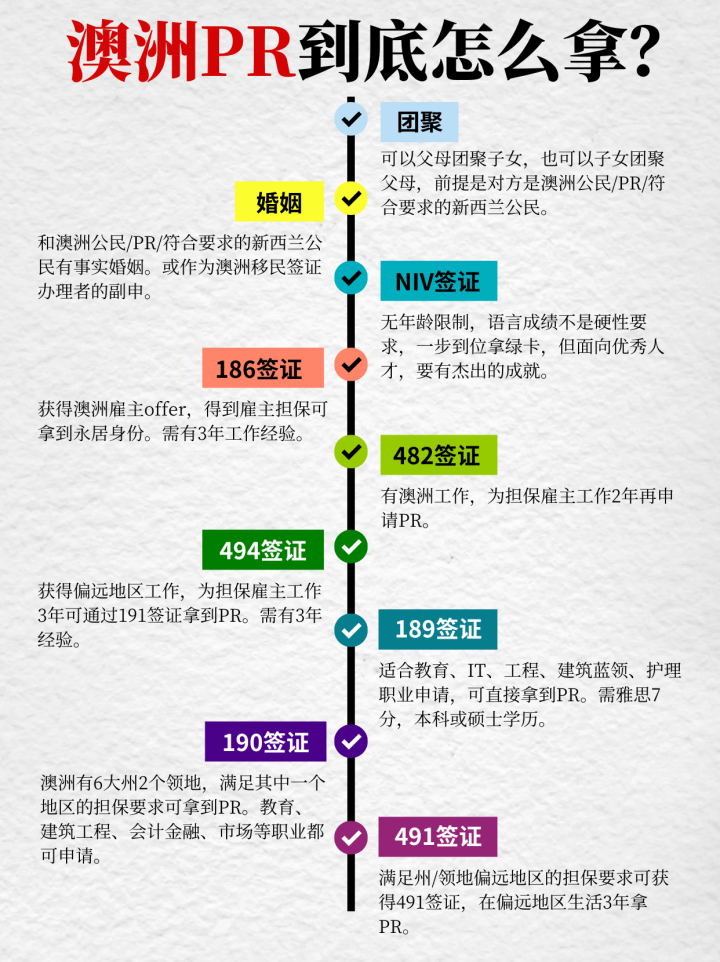 想要移民澳洲?这里有多种主要途径供你选择,每种途径都有不同的要求和步骤。无论你是想要技术移民还是雇主担保,这里都有适合你的方案。团聚移民可以父母团聚子女,也可以子女团聚父母,前提是对方是澳洲公民/PR/符合要求的新西兰公民。婚姻移民和澳洲公民/PR/符合要求的新西兰公民有事实婚姻。或作为澳洲移民签证办理者的副申。NIV签证移民无年龄限制,语言成绩不是硬性要求,一步到位拿绿卡,但面向优秀人才,要有杰出的成就。186签证获得澳洲雇主offer,得到雇主担保可拿到永居身份。需有3年工作经验。482签证获得澳洲工作,为担保雇主工作2年再申请PR。494签证获得偏远地区工作,为担保雇主工作3年可通过191签证拿到PR。需有3年经验。189签证适合教育、IT、工程、建筑蓝领、护理职业申请,可直接拿到PR。需雅思7分,本科或硕士学历。190签证澳洲有6大州2个领地,满足其中一个地区的担保要求可拿到PR。教育、建筑工程、会计金融、市场等职业都可申请。491签证满足州/领地偏远地区的担保要求可获得491签证,在偏远地区生活3年拿PR。![]() 长按二维码添加您的专属移民顾问 ![]() ![]() 安信达成立于2011年,拥有国内专业团队,包括国际教育顾问、升学规划专家、前任移民官、外籍大律师、资深文案、注册会计师及海外团队,致力于提供欧盟、加拿大、美国、澳洲、新西兰、英国、日本、韩国、马来西亚、泰国等国的外事服务、国际教育、海外移民等出国咨询服务,行业经验丰富。多次荣获“品牌影响力留学移民机构”、“诚信经营留学移民构”、“诚信经营出入境服务机构”等荣誉称号。 ![]() |