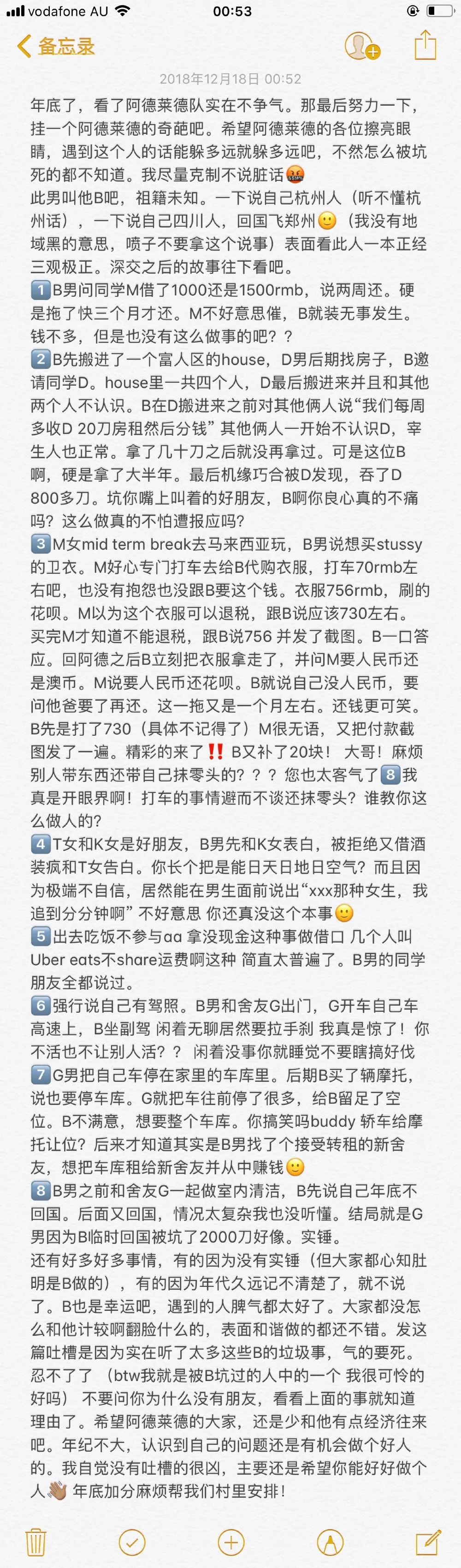 澳洲糟老头光天化日抢走捐给贫困儿童善款 | 学姐借钱借包不还转身回国就耍赖 | 悉尼男网红身高一米九的老赖实记 | 人善被人欺,城里套路深 | 渣男劝我出国,原来已经找好了下家 | 我失败的感情经历 | 悉尼渣男把我骗到澳洲后就出轨甩了我 | CW无良韩国烤肉店涉嫌偷窃客人财物 | 悉尼渣男队喜提新成员 | ins全靠前任撑场面的墨尔本极品渣男第二弹 | 悉尼美容院倒闭关门,消费者维权碰壁 | 墨尔本极品渣男整天拿前任东西放上网装逼 | 交友不慎遇到人品极差的马来西亚小情侣 | 这辈子遇到过最黑暗的奥克兰渣男| 无赖物流寄错快递解决不了态度吊炸天 | 99年花季少女不学好,到处欠钱不还 | Rhodes火车上的阿三色狼 | 玩游戏时能不能看出一个人性格人品 | UTS戏精女喝醉当自己大爷,闯祸后不愿负责 | 墨尔本渣女骗财骗色骗感情 | 和朋友的前任搞暧昧合适吗