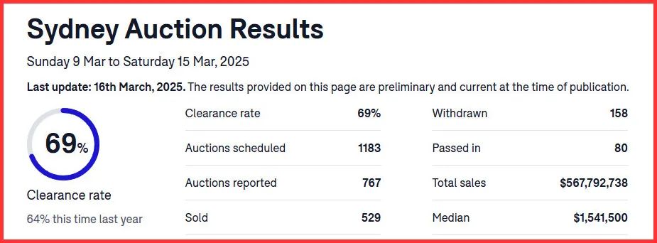 ♎ 悉尼:成交率逆势上涨,买家竞争升温第11周悉尼注册拍卖量微增至1183套,但实际统计拍卖数从913套降至767套。成交房源从611套减少至529套,但流拍数从159套锐减至80套,成交率从67%升至69%。市场呈现“量缩价稳”特征,买家对优质房源争夺加剧,流拍减少反映定价更趋合理。