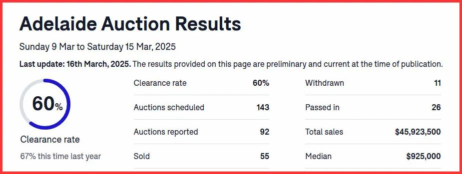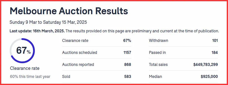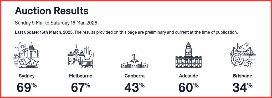 ⊙ 成交率:43%; ⊙ 中位价:$1,210,000(持平);⊙ 注册拍卖套数:111;⊙ 统计拍卖套数:87;⊙ 成交套数:37;⊙ 撤回拍卖套数:12;⊙ 流拍套数:38;⊙ 成交总额:$25,000,000(估算)。 ♋ 总结:| 澳洲房产市场在第11周呈现“核心城市回暖,小城市承压”的分化格局。墨尔本假期后需求反弹强劲,悉尼通过减少流拍提升效率,而布里斯班和堪培拉则因供需错配面临调整压力。整体来看,买家对合理定价的房源仍保持热度,但市场已从“狂热抢购”转向“精挑细选”,未来几周或延续温和震荡趋势。 | 来源:Domain