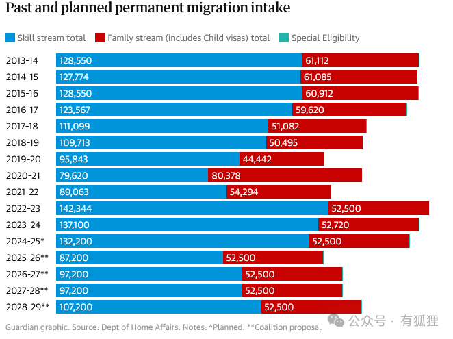 02自由-国家党联盟表示:如果当选,将重刀技术移民| 详细信息 | | 据卫报报道,联盟党表示,若重掌政权,计划将削减永久移民25%的配额,即减少4.5万人。其影子移民部长Dan Tehan证实了这一消息,他表示:"我们不会动家庭类移民的配额,而是通过大幅削减技术移民的数量,将永久移民总额从2024–25年的18.5万人,降至2025–26年的14万人。"但他同时也补充:"此后两年永久移民配额将上调至15万人,之后再上调至16万人。" | | 目前签证情况 | 在永久移民计划中,"父母类"和"其他家庭类"签证设定了年度上限,今年分别为8,500人和500人;而配偶类和子女类签证的数量则没有设限(按实际需求发放)。因此根据联盟党的计划,在将家庭类移民数量维持在原定的52,500人的基础上,将技术移民配额在下一个财年从132,200人大幅削减至87,200人。