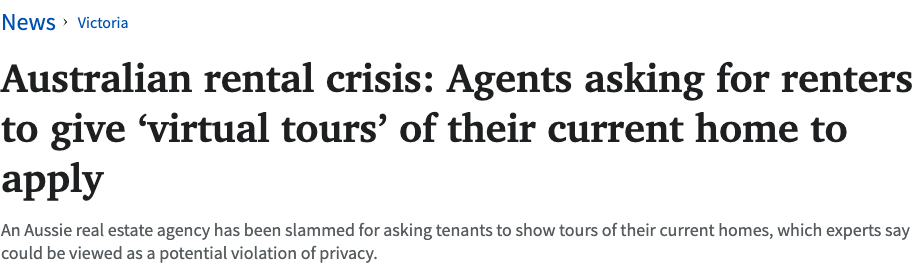 ![]() ![]() 澳洲租房市场实在是太卷了! 最近,墨尔本当地一家房地产中介竟然要求租客在申请租房时,提供VR参观他们现在住的地方! 这一要求让很多人震惊,甚至有专家指出:这可能已经侵犯了租客的隐私权。 ![]() ![]() 租房难,中介胆子越来越大? 租房市场本就竞争激烈,很多租客为了能租到合适的房子,不得不配合各种严格的审核要求。然而,这次的“线上看房”请求似乎有点过了头。 维州参议员候选人Jordan van den Lamb就对这一做法猛烈抨击。他认为, “中介之所以敢这么做 是因为他们知道自己即使越界了 还是能找到租客!” ![]() “租赁市场太紧张,很多人根本负担不起,导致一些中介越来越‘放飞自我’,很多中介其实每天都在踩法律的红线。” 不少网友看到这个新闻后,纷纷表示愤怒,并建议把这个中介举报到维州消费者事务部或民事和行政法庭。 ![]() 中介:只是想更好地管理租房 面对外界的批评,这家墨尔本租房中介的运营经理 解释说,他们之所以提出这个要求, 是因为有些租客提供的信息不够详细。 “我们只是想确保租客有能力管理好租赁房产,并尽可能让租客和房东双方都满意。” “如果申请人的材料不够充分,我们会考虑有哪些方式可以推进申请。” ![]() Perthlife珀斯生活资讯每天第一时间跟大家分享西澳最新的大事小事,记得关注珀斯生活资讯,接下来那些吃喝玩乐奇闻趣事跑不了的! 👇长按这个二维码👇 西澳新闻抢先知道! ![]() 这合法吗?专家怎么看? 虽然 《住宅租赁法》 并没有明确规定中介不能要求租客提供这种“线上看房”视频,但不少专家认为, 这已经踩到了侵犯隐私的红线! 维州房地产协会主席Jacob Caine表示:“大部分租客听到这样的要求,恐怕都会觉得不合适。” ![]() 而维州租户联盟(Tenants Victoria) 的 CEOJennifer Beveridge也强调: 房东无权要求租客 提供私人住所的参观视频! “我们建议所有租客不要提供这样的信息,”她说,“房东当然想找到好租客,但他们也应该尊重租客的隐私和基本权利。” 她还补充说,目前租赁市场供不应求,房东和中介 占据绝对强势地位,这导致很多租客不得不接受不公平的要求。但这并不意味着他们的隐私可以被随意侵犯。 ![]() 你觉得中介的要求合理吗?如果你是租客,你会提供自家“线上看房”的视频吗? 关于我们 Perfect Lover——作为澳洲新西兰最大的华人婚恋交友平台之一,不定期在各大城市举办各类主题的线上线下交友活动。 ![]() ![]() ![]() 澳洲上万人线上线下首选脱单平台——70后、80后、90后、00后优质单身男女聚集地。 ![]() ![]() ![]() ![]() Perfect Lover公众号 每周都会推荐 优质单身男/女 ![]() 如果你正好在 澳洲或新西兰 如果你 年龄在20-45岁 如果你是 单身 ![]() 脱单添加小红娘微信 ![]() 说出你的要求和条件 为你匹配Perfect Lover! (本文图片均来自网络) ![]() ![]() ![]() ![]() ![]() ![]() 西澳人都爱看的 珀斯生活资讯 ![]() 澳洲女士半夜遭重创,老鼠正在啃食她的眼球!婴儿被咬的血肉模糊,饥饿的老鼠已经把人当成了食物![]() 珀斯华人注意!今年最恐怖的风暴已经降临,狂风暴雨+海啸,洪水随时爆发,千万别出门!![]() 因为两只猫头鹰,澳洲1.53亿的大项目直接停摆,就在华人区!所有人都惊呆了!![]() 中国一场疫情,西澳小渔村哭了!一年的辛苦白费了…………![]() 重磅!莫里森宣布开国门4阶段计划,留学生马上返澳!第三阶段开始大规模返澳!打疫苗就能居家隔离!![]() 太可怕了!为了越狱,珀斯女囚放火烧了监狱,还有小镇最珍贵的遗产!![]() 文章好看就点这里 ![]() |