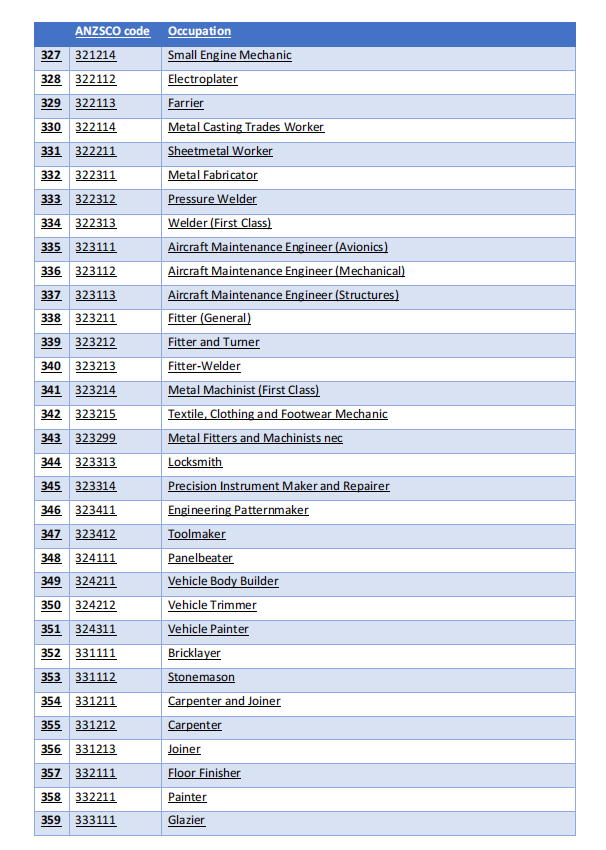 ![]() 2024年12月3日,澳大利亚政府正式推出核心技能职业清单(Core Skilled Occupation List, 简称CSOL)。该职业清单是由澳大利亚就业与技能局(Jobs and Skills Australia (JSA) )结合劳动力市场分析,行业的建议所指定的,为即将推出的SID 签证,提供更加灵活多样的职业选择。 该清单涵盖了456个职业,将适用于2024年12月7日推出的SID签证(替代原先482签证)及186 Direct Entry Stream。 之前有些可以申请482的职业,是不能直接申请186 Direct Entry Stream的,而是要在澳洲给雇主工作2年后,通过186 Temporary Residence Transition Stream, 转永居。以后,这两个通道再无职业清单区别了。 移除的职业:例如餐厅经理,平面设计师,物业经理,会议活动组织者等; 新增的职业:园艺师、销售代表,网络安全工程师等; 继续保留的热门职业:人力资源经理,财务经理,建筑项目经理,会计,审计,市场专员,厨师及大部分计算机和工程类职业。 具体职业列表 ![]() ![]() ![]() ![]() 点击查看大图 ![]() ![]() ![]() ![]() ![]() ![]() ![]() ![]() ![]() ![]() ![]() 也可点击以下链接查看: http://immi.homeaffairs.gov.au/Documents/core-sol.pdf 具体SID替代482,有何政策变化,要等12月7日,移民局将公布更多细节。但是这份新的职业清单,不仅简化了旧的、复杂的职业列表,还为更多的职业提供了通过雇主担保,拿到绿卡的渠道。 同时,858 NIV签证也将于12月7日提供更多更新消息!大家如果有移民澳洲的打算,一定要尽快做好规划。 如果您对澳洲移民感兴趣,可以联系澳星出国,全国统一咨询热线:400-997-7366,或长按识别底部二维码加客服微信,如您有需要可以随时联系我们。 Austar 澳星直播间 澳星出国,您的海外规划师 和您一起聊聊 投资、移民、留学、置业那些事 ![]() 相关声明: 1、本文图片来源:锐景创意, 已购版权! 2、风险提示:文中相关国家的移民政策,来源于已公开的资料,仅供参考,不构成邀约或承诺,详情以递交申请时的政策要求及正式法律文本为准。 - 热门推荐 - ![]() ![]() ![]() ![]() ![]() - END - ![]() 点击“阅读原文”,马上一对一咨询 |