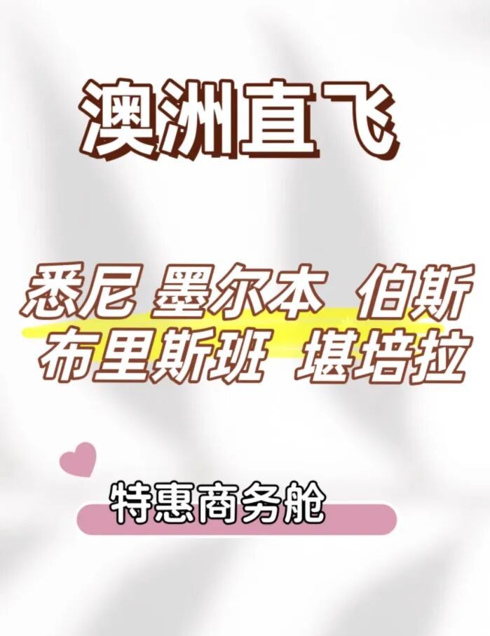 飞往澳洲:一张机票,半程人间,半程仙境 都市风情:在街巷遇见多元格调 「悉尼:赴一场地标之约」 机票是解锁海港盛景的密钥。落地即见歌剧院的白帆映着蓝天,可攀登海港大桥俯瞰碧波,也能乘轮渡赴邦迪海滩追浪,傍晚在达令港的灯火里尝一口新鲜生蚝。 「墨尔本:品一杯文艺时光」 从机舱走出,先钻进霍西尔巷与涂鸦合影,再去维多利亚女王市场淘手信。在街角咖啡馆点杯澳白配牛油果吐司,坐复古电车漫游,感受这座“咖啡之都”的悠闲 。 「布里斯班:晒一身阳光暖意」 机票带你闯入“阳光之城”。在南岸公园的人造沙滩躺平,去龙柏考拉保护区抱考拉合影,傍晚追着故事桥的日落,随手就能接住南半球的温柔。悉尼(按时长排序) ✈️CX138 悉尼-香港 ✈️CX100 悉尼-香港 ✈️CX110 悉尼-香港 ✈️CX162 悉尼-香港 ✈️QF127 悉尼-香港 ✈️MF802 悉尼-厦门 ✈️CZ602 悉尼-广州 ✈️CZ326 悉尼-广州 ✈️CZ8092 悉尼-广州 ✈️CZ302 悉尼-广州 ✈️MU562 悉尼-上海 ✈️MU736 悉尼-上海 ✈️3U3892 悉尼-成都 ✈️MU792 悉尼-南京 ✈️MU750 悉尼-武汉 ✈️MU712 悉尼-杭州 ✈️GS7940 悉尼-郑州 ✈️CA174 悉尼-北京 墨尔本 ✈️CX178 墨尔本-香港 ✈️CX134 墨尔本-香港 ✈️CX104 墨尔本-香港 ✈️HX014 墨尔本-香港 ✈️QF029 墨尔本-香港 ✈️CZ344 墨尔本-广州 ✈️MF804 墨尔本-厦门 ✈️CZ644 墨尔本-广州 ✈️CZ322 墨尔本-广州 ✈️ZH812 墨尔本-深圳 ✈️MU738 墨尔本-上海 ✈️MU740 墨尔本-上海 ✈️MU852 墨尔本-南京 ✈️JD386 墨尔本-杭州 ✈️CA166 墨尔本-北京 布里斯班 ✈️CX156 布里斯班-香港 ✈️CX150 布里斯班-香港 ✈️CZ382 布里斯班-广州 ✈️MU716 布里斯班-上海 👉关于我们: ✅对公转账 ✅官网验票 ✅资质齐全 ✅官方可查 ✅全程专属客户服务 ![]() |