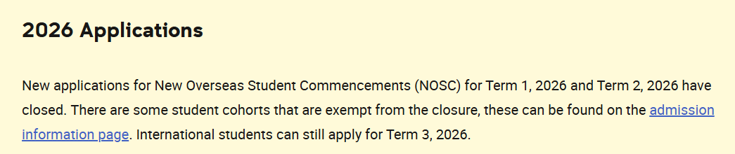 点击蓝字,关注我们![]() ![]() 新南威尔士大学2026年前两学期申请结束 ![]() 就这两天,不少准备申请澳洲留学的同学发现,新南威尔士大学(UNSW)突然按下暂停键——不再接收2026年第一学期(2月入学)和第二学期(5月入学)的国际新生申请了。 作为澳洲八大名校之一,QS全球排名前20的UNSW一直是中国学生青睐的热门院校,这一变动让很多人的留学计划不得不重新调整。 申请通道关闭 ![]() 根据新南威尔士大学官方通知,这一决定立即生效,线上申请系统也已同步关闭。 此次政策调整意味着学校2026年T1和T2两个入学季的名额将进一步紧缩。 原本计划申请这两个学期的学生,可能需要及时调整策略,将目光转向2026年第三学期(T3,9月入学)。 为什么突然关闭申请? 学校官方给出的理由很明确:一方面是申请人数实在太多,另一方面是配合澳洲政府对国际学生招生数量的调控政策。 说白了,就是UNSW作为热门名校,申请者年年增加,但学校资源有限,只能通过控制人数来保证教学质量。 有业内人士分析,这种情况其实早有征兆。近年来,澳洲顶尖大学的申请竞争越来越激烈,特别是对于国际学生而言,“僧多粥少”的局面越来越明显。 哪些人不受影响? 虽然申请通道关闭了,但并不是所有人都受影响。以下几类学生仍然可以申请2026年T1或T2入学: 目前在读UNSW College(预科)并准备升读的学生; 政府或机构资助的学生; UNSW官方对接的升学通道项目学生; 正在澳洲读高中的学生; 已经在UNSW就读的在校国际学生。 已经递交了申请怎么办? 申请材料已齐全:如果你的申请已经完整提交,而且专业还有名额,学校会按顺序审核并发放录取通知。 材料还没补全:一定要在截止日期前尽快补齐材料,否则你的申请会自动顺延到2026年T3学期处理。 工程、艺术、设计及建筑学院的部分专业,2026年T1和T2的名额已经快满了,情况比较紧张。 已经拿到录取通知:如果你已经收到了2026年T1或T2的Offer(无论是有条件还是无条件),一定要尽快在系统中确认接受。 给留学生的特别建议 重新规划申请时间:原来计划2月入学的小伙伴们,现在得把目标调整为9月入学了。这意味着整个时间线都要重新安排。 提前准备申请材料:T3学期的申请肯定会更加拥挤,建议提前把成绩单、语言成绩这些材料准备好,做到有备无患。 UNSW对本科申请者的高考成绩要求在525-675分之间(满分750的情况下),硕士申请则需要被认可的学士学位,平均分最好在72%以上。 语言要求方面,大部分课程要求雅思总分6.5,单项不低于6.0。 考虑多元化申请:别把所有希望都放在一所学校上。可以同时考虑悉尼大学、墨尔本大学等其他澳洲名校,分散风险。 扑哧优学香港申请服务依托资深香港留学顾问团队,为您提供: ✅ 精准选校定位:基于GPA/语言/背景匹配成功率模型; ✅ 文书深度优化:双非院校软背景优化; ✅ 香港名校绿色通道:安全内推制申请,双非背景也可申请名校。 更多语言、留学相关资讯请关注扑哧优学公众号 ![]() ![]() ![]() |
