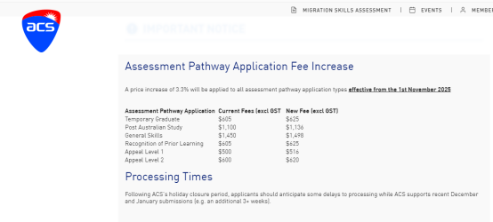 ![]() 点击箭头处“蓝色字”,关注我们哦!! 近期,澳大利亚计算机学会(ACS)宣布:自2025年11月1日起,所有评估通道的申请费用将上涨3.3%! 此次涨价旨在支持ACS继续推动信息技术和计算机科学领域的研究与发展,同时加强其为会员提供的服务和资源。 ![]() 新的费用结构将适用于所有类别的会员,包括学生、标准会员和企业会员。具体涨幅将根据不同通道类别有所不同,但总体涨幅预计在5%-15%之间。