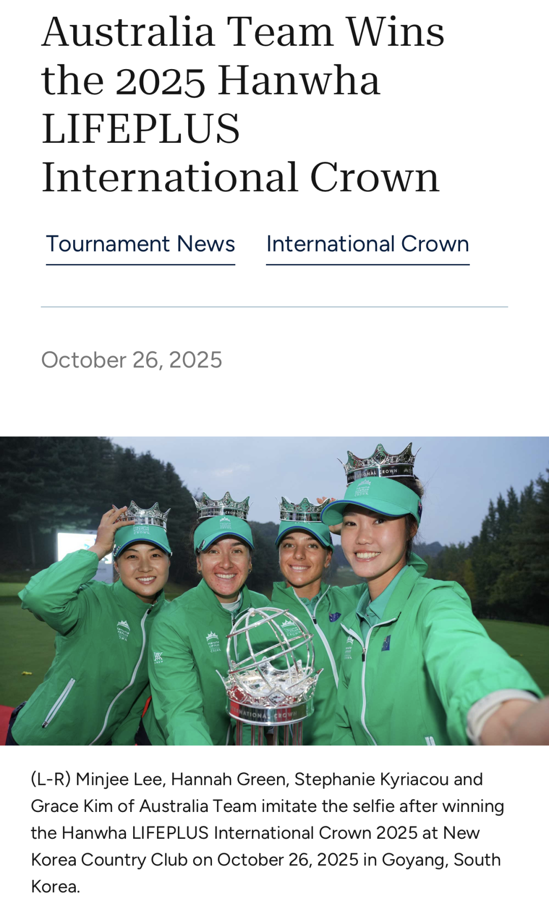 文/The Links Lady Bay![]() 团结拼搏奋斗昂扬 澳大利亚女子高尔夫代表队又一次在世界舞台上闪耀! 在刚刚结束的 2025 Hanwha LIFEPLUS International Crown(韩华国际皇冠赛)中,澳洲队以强势表现夺得冠军。 ![]() 这支梦幻阵容由 Minjee Lee、Hannah Green、Stephanie Kyriacou 以及 Grace Kim 四位选手组成,她们凭借稳定的推杆和极高的团队默契,为澳洲赢下这场荣誉之战。赛后,队员们在领奖台上自拍庆祝,笑容里写满了骄傲。 这场比赛不仅是一场竞技较量,更是一场“团队精神”的展示。不同于个人赛,International Crown 强调的是 国家荣誉与团队协作。澳大利亚队的胜利,也象征着该国在女子高尔夫领域的持续崛起。 赛事亮点: Minjee Lee 的精准铁杆依旧无可挑剔 ![]() Hannah Green 的果岭判断几乎完美 ![]() 年轻选手 Grace Kim 的冷静表现令人惊艳 ![]() ![]() 推广 ![]() 对澳洲高尔夫而言,这场胜利不仅仅是一枚奖杯,更是对多年来系统化青训和职业体系建设的肯定。 这支队伍的成功,也让外界重新审视澳大利亚在女子高尔夫世界格局中的地位——一个兼具激情与理性的南半球力量。 ![]() 从个人巨星到团队荣耀,这两则新闻共同勾勒出当代高尔夫的两种魅力: 一边是老将的坚持与抉择,一边是新生力量的团结与突破。 而这,正是高尔夫之所以迷人的原因。 ![]() END |