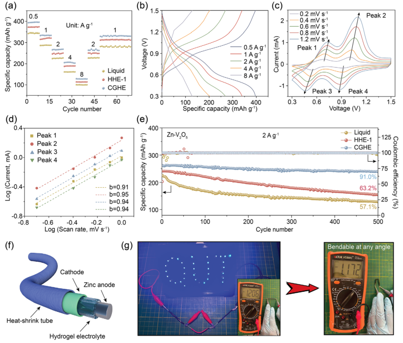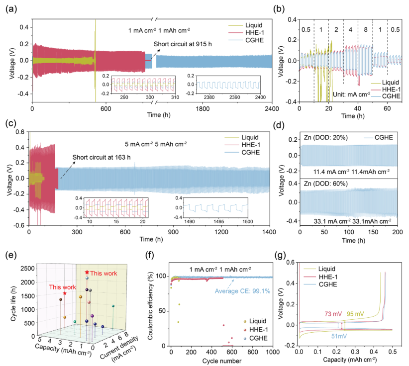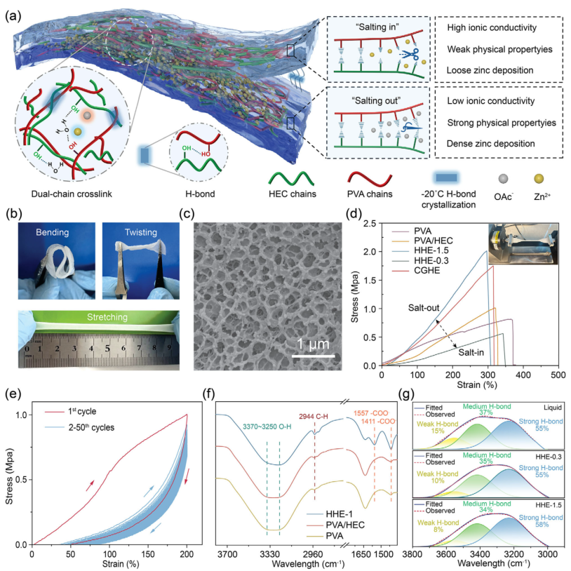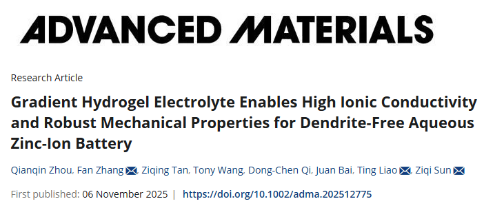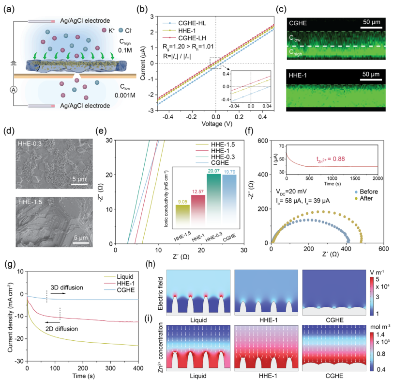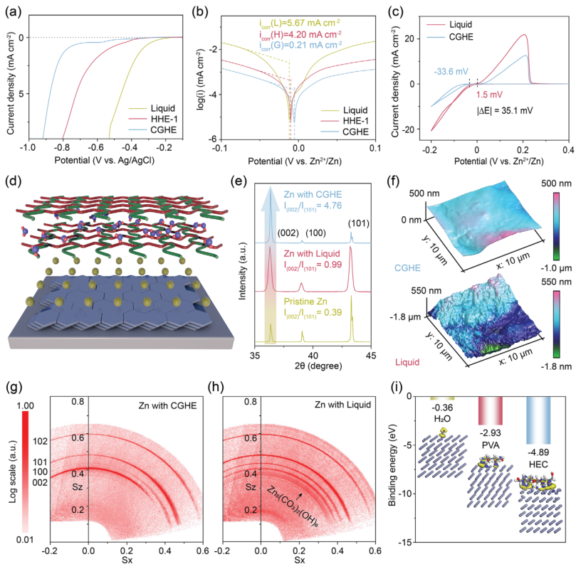 ![]() 随着全球对可持续能源存储需求的日益增长,水系锌离子电池因其高理论容量、低氧化还原电位、资源丰富及不易燃等优势,被视为下一代安全储能系统的重要候选者。然而,其实际应用仍面临严峻挑战:锌负极界面处易发生枝晶生长、析氢反应和腐蚀等问题,严重影响电池的循环寿命和安全性。传统水凝胶电解质虽能部分缓解这些问题,却难以同时实现高离子电导率和强机械性能,成为制约其发展的关键瓶颈。 为解决这一难题,昆士兰科技大学孙子其教授、廖婷教授、张凡博士研究团队受霍夫迈斯特效应启发,成功开发出一种浓度梯度水凝胶电解质。该电解质通过集成高浓度(1.5 M)与低浓度(0.3 M)醋酸锌的双层水凝胶结构,实现了高达0.88的锌离子迁移数和1.7 MPa的拉伸强度,有效抑制了枝晶生长与析氢反应。对称锌电池在1 mA cm⁻²下稳定循环超过2500小时,锌铜不对称电池库仑效率达99.1%,锌与五氧化二钒全电池在500次循环后仍保持91%的容量,展现出优异的电化学性能与界面稳定性。相关论文以“Gradient Hydrogel Electrolyte Enables High Ionic Conductivity and Robust Mechanical Properties for Dendrite-Free Aqueous Zinc-Ion Battery”为题,发表在Advanced Materials。 ![]() 研究团队通过图1展示了梯度水凝胶电解质的设计理念与机械性能。该电解质由聚乙烯醇和羟乙基纤维素构成的双网络结构,通过循环冻融法形成物理交联,具备良好的可弯曲、扭转和拉伸性能。拉伸测试显示,梯度水凝胶在保持310%延伸率的同时,强度高达1.7 MPa,远优于单一浓度水凝胶。傅里叶变换红外光谱进一步揭示了其内部氢键网络的梯度分布,高盐浓度侧因“盐析效应”增强了交联密度,而低浓度侧则维持了高离子迁移通道。 ![]() 图1:基于霍夫迈斯特效应的浓度梯度水凝胶电解质(CGHE)设计。 a) 浓度梯度水凝胶电解质结构示意图,结合了高、低浓度层的优势; b) 梯度水凝胶在弯曲、扭转和拉伸变形下的实物图像; c) 冻干后水凝胶的多孔结构; d) CGHE与不同离子浓度水凝胶的拉伸测试对比,包括纯PVA凝胶、双网络凝胶、含0.3 M与1.5 M Zn(OAc)₂的水凝胶; e) CGHE在200%应变下连续加载-卸载50次的应力-应变曲线; f) PVA、PVA/HEC及含1 M Zn(OAc)₂水凝胶的FT-IR光谱; g) PVA凝胶、PVA/HEC凝胶、HHE-1.5凝胶及1 M Zn(OAc)₂液体电解质的FT-IR拟合谱图。 图2聚焦于离子传输行为。电流-电压测试表明,梯度水凝胶具有明显的离子选择性与不对称传输特性,其在零电压下仍存在净电流,验证了梯度结构的有效性。共聚焦显微镜与能谱直观展示了聚合物网络与元素分布的梯度特征。此外,该电解质在保持高离子电导率(19.79 mS cm⁻¹)的同时,锌离子迁移数达到0.88,显著高于均质水凝胶与液态电解质。 ![]() 图2:CGHE的离子传输行为。 a) 离子传输与选择性测试的I-V装置示意图; b) HHE-1与CGHE在不同电压下的电流变化,插图为放大后的I-V曲线; c) CGHE与HHE-1的共聚焦激光扫描显微镜图像,显示聚合物网络分布; d) 不同浓度水凝胶电解质中锌负极循环50次后的SEM图像; e) 不同水凝胶的Nyquist图,插图为对应离子电导率; f) Zn对称电池在20 mV过电位下计时电流法测试前后的Nyquist图,插图为I-t曲线,显示Zn²⁺迁移数为0.88; g) 不同电解质中的计时电流法测试; h) COMSOL模拟显示不同电解质中锌电极表面的电场分布; i) 锌离子在不同电解质中的通量分布模拟。 图3深入揭示了锌沉积的晶体取向调控机制。线性扫描伏安与极化测试表明,梯度水凝胶能有效抑制析氢反应与自腐蚀,提升成核过电位至35.1 mV。X射线衍射与广角倒易空间映射分析显示,使用该电解质的锌沉积层具有显著的(002)晶面择优取向,其[000]/[001]比例高达4.76。原子力显微镜与扫描电镜进一步证实了锌沉积层平整致密,无枝晶生成。密度泛函理论计算表明,水凝胶组分与锌(002)表面具有更强的吸附能与电子亲和性,促进了锌离子的定向还原与均匀沉积。 ![]() 图3:CGHE电解质中锌(002)取向沉积行为。 a) 线性扫描伏安曲线; b) 线性极化曲线; c) 不同电解质中铜箔上锌成核过电位的循环伏安曲线; d) 凝胶电解质中锌平整沉积示意图; e) 不同电解质中锌箔循环50次后的XRD图谱; f) CGHE与液态电解质中锌负极循环50次后的原子力显微镜图像; g) 使用CGHE的锌(002)织构在样品法线方向的广角倒易空间映射; h) 液态电解质中锌晶体随机取向的映射图; i) H₂O、PVA与HEC在锌(002)晶面上的吸附能。 图4展示了对称与不对称电池的电化学性能。在1 mA cm⁻²和1 mAh cm⁻²条件下,锌对称电池使用梯度水凝胶可稳定运行2400小时以上,极化电压仅为60 mV。即使在5 mA cm⁻²的高电流密度下,电池仍能持续工作1500小时。锌铜电池在1000次循环中平均库仑效率达99.1%,电压间隙低至51 mV,表现出优异的电化学可逆性。 ![]() 图4:对称与不对称电池的电化学性能测试。 a) 液态电解质、HHE-1与CGHE在1 mA cm⁻²/1 mAh cm⁻²下的循环性能; b) 不同电解质中锌对称电池的倍率性能; c) 在5 mA cm⁻²/5 mAh cm⁻²下的循环性能; d) CGHE在20%与60%放电深度下的循环稳定性; e) 本工作与以往报道的水凝胶电解质电池寿命对比; f) 不同电解质中Zn||Cu电池在1 mA cm⁻²/1 mAh cm⁻²下的库仑效率曲线; g) 不同电解质中电池的首圈电压-容量曲线。 图5进一步验证了其在实际全电池中的应用潜力。锌与五氧化二钒全电池在0.5至8 A g⁻¹的电流范围内展现出优异的倍率性能,容量恢复率高,循环500次后容量保持