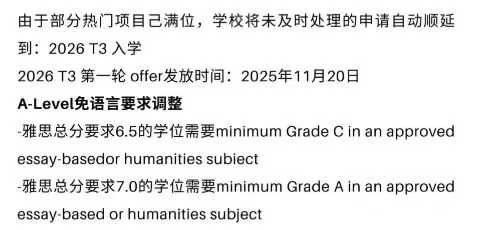 NEW 🇦🇺“新南威尔士大学 新南威尔士大学近期发布两项关键申请政策变动,直接影响申请进度与材料准备,计划申请的同学需重点关注以下要点: ![]() 热门专业 申请顺延 A-Level 语言调整 ![]() 热门专业申请顺延 特别 新南威尔士大学发布了关于2026年入学申请的重要通知,对于正在用A-level成绩直接申请UNSW的同学要注意,新南对豁免语言的条件进行了调整,需满足一定的条件才能豁免,具体内容如下: 提醒 01 热门专业申请顺延 UNSW目前已关闭26T1&26T2的入学申请,大多数课程均已满位,所有暂未审理的申请都将自动顺延至26T3(无论材料是否完整)。 ▪️26T3首轮offer发放:25年11月20日。 ▪️接受ddl:25年12月11日 。 ⚠️注意:对于材料提供不完整的同学,需在相应截止日期前补齐所有材料。 02 A-Level语言豁免要求微调 📝豁免语言条件调整“全英文授课证明”仅接受来自英语母语国家或WHED认证院校的学历才可以豁免语言。 A-Level 豁免语言条件: 👉雅思6.5课程:英语语言/文学或人文类essay-based科目至少达到C或C以上。 👉雅思7.0课程:同上述科目至少达到A或A以上 。 其他课程体系(如HKDSE、IB、CBSE、STPM等)仍被认可。 *此次调整适用于26T3及以后所有尚未审理或进入waitlist名单且未发放offer的申请。 关于院校 新南威尔士 ![]() 新南威尔士大学(The University of New South Wales),简称“UNSW Sydney”,主校区位于澳大利亚新南威尔士州悉尼市。新南威尔士大学是澳大利亚八校联盟的创始成员之一 ,同时位列环太平洋大学联盟(APRU)、国际科技大学联盟(GlobalTech)、全球研究型大学国际联盟 Universitas 21、三大洲高校联盟( PLuS)、英联邦大学协会( ACU )成员大学之一。 往期推荐: 2026招生简章 — 澳洲墨尔本大学 2026招生简章 — 新南威尔士大学 2026招生简章 — 悉尼科技大学 ![]() = END = 公司地址丨安徽育航纪文化传媒有限公司合柴1972 邻里中心2楼211室 Company Address | Company Address | Anhui Yuhangji Culture Media Co., Ltd., Hechai 1972 Neighborhood Center, 2nd Floor, Room 211 点击蓝字 关注我们 (素材源于网络,侵删) ![]() |