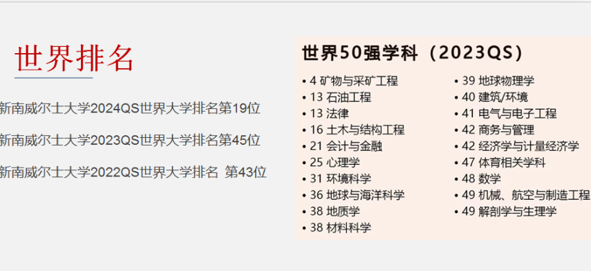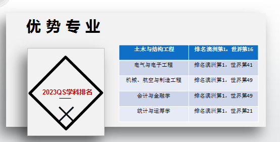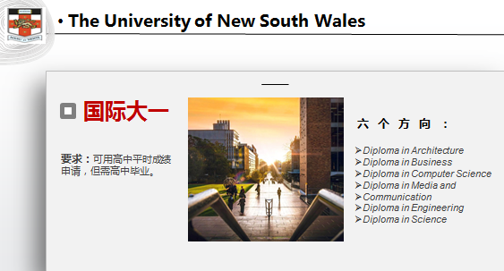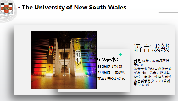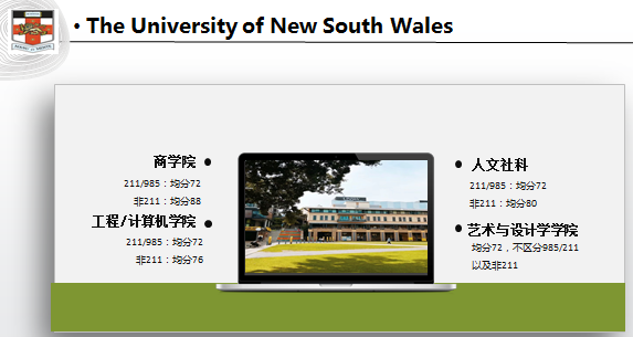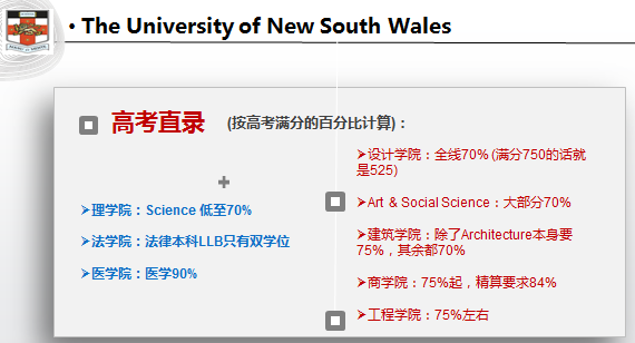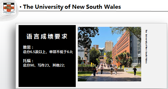 ![]() 新南威尔士大学 The University of New South Wales ![]() 新南威尔士大学(The University of New South Wales)创立于1949年,主校区位于澳大利亚新南威尔士州首府悉尼的世界顶尖公立研究型大学。主校区坐落于南半球金融、贸易与旅游中心--澳大利亚新南威尔士州首府悉尼,是一所公立研究型大学,为澳大利亚八校联盟、环太平洋大学联盟和英联邦大学协会成员。 01 『学校概况』 ![]() 新南威尔士大学历年QS排名+世界50强学科 2024QS世界大学排名第19位 2023QS世界大学排名第45位 2022QS世界大学排名 第43位 ![]() 新南威尔士大学的院系设置--7大学院: Business School 商学院;Engineering 工程学院;Art, Design & Architecture 人文、设计与建筑学院;Law & Justice 法学院;Medicine & Health 医学院;Science 理学院。 ![]() 优势专业(2023QS学科排名): 土木与结构工程 QS学科排名澳洲第1,世界第16 电气与电子工程 QS学科排名澳洲第1,世界第41 机械、航空与制造工程 QS学科排名澳洲第1,世界第49 会计与金融学 QS学科排名澳洲第1,世界第49 统计与运筹学QS学科排名澳洲第1,世界第21 ![]() 02 『申请指南』 ![]() 本科申请: 语言成绩要求如下: 雅思总分6.5及以上、单项不低于6.0; 或者托福总分90、写作23、其他22。 ![]() 高考直录 (按高考满分的百分比计算): 设计学院:全线70% (满分750的话就是525),Art & Social Science:大部分70% 建筑学院:除了Architecture本身要75%,其余都70% 商学院:75%起,精算要求84% 工程学院:75%左右 理学院:Science 低至70% 法学院:法律本科LLB只有双学位 医学院:医学90%。Physio只要70 ![]() 国际大一(Diploma):可以理解为试读一年大一,顺利通过的话转入普通大二,主要有有以下六个方向: 1)Diploma in Architecture 2)Diploma in Business 3)Diploma in Computer Science 4)Diploma in Media and Communication 5)Diploma in Engineering 6)Diploma in Science 要求:可用高中平时成绩申请,但需高中毕业。 ![]() 预科(Foundation): 相当于把高三搬来澳洲读,只需完成高二即可入读。UNSW是澳洲第一个预科项目,也是唯一一个八大全部官方认可的预科项目,新南预科的成绩可以申请澳洲所有大学。 ![]() 硕士申请: GPA要求:985院校:均分75;211院校:均分80;非211院校:均分90。 语言成绩:雅思总分6.5,单项不低于6.0部分专业的语言成绩要求更高。如:艺术、设计与建筑、商业、法律与司法雅思要求总分 7.0(单项至少 6.0)。 ![]() ![]() ![]() 不同专业分数录取分数不同: 商学院:Business,绝大多数专业:211/985:均分72,非211:均分88。 精算:需要额外看专业课成绩。 工程/计算机学院:Engineering and Computing,录取要求(所有专业): 211/985:均分72;非211:均分76。 人文社科:Arts and Social Science,录取要求(所有专业): 211/985:均分72;非211:均分80。 艺术与设计学学院:Art & Design,录取分数:一律72。 理学院:Faculty of Science录取分数(不区分211/985和双非): 心理学(Psychology):80;其他专业:一律72,部分专业额外看专业科目分数。 建筑和环境科学:Built Environment,录取要求(所有专业): 211/985:均分72;非211:均分80 法学院:Faculty of Law,录取分数(不区分211/985和双非) Master of Law (LLM):均分72 Juris Doctor (JD):均分76 医学院: Faculty of Medicine,均分要求不高,一律只要72。 ![]() 03 『校园生活』 ![]() 住宿:新南威尔士大学给学生提供不同的住宿选择,包括校内学生宿舍,学生公寓,寄宿家庭等选择。所有的住宿都拥有现代化的设施、地理位置优越、交通便利,可以为学生提供安全舒适、丰富多彩的大学社区生活体验。 申请条件:需要是新南威尔士大学的注册学生,并且需要完成官网申请表格,要有充分的理由和证据证明需要宿舍,并能按时支付房租。 申请流程: 1、在新南威尔士大学官网上浏览宿舍信息,确认预算,根据需要选择最合适的方案。 2、填写宿舍申请表,注明所选宿舍类型以及预计住宿时间、室友选择(最多四个住宿偏好)和联系方式等信息。 3、提交申请,支付申请费用和预付租金。 4、学校收到申请后,开始审核,只要符合条件并且有剩余宿舍可选择,会分配合适的房源。 ![]() ![]() ![]() 饮食:新南威尔士大学食堂美食种类丰富,且价格实惠。 ![]() ![]() 扫码关注我们更多学校信息推荐不负春光 不负自己 ![]() 您点的每个赞,我都认真当成了喜欢 |