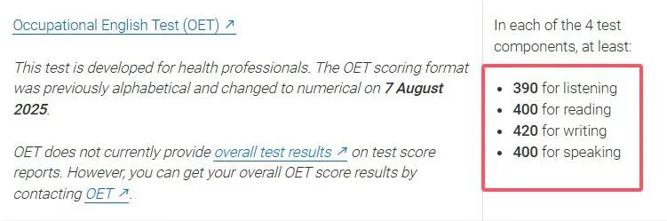 这些分数,对于准备过 OET、或正在使用医学英语工作的你来说,都是可实现的目标。 04 OET是更好、更稳、更适合医护的选择 ![]() ![]() ![]() 1. 考试内容更符合你的专业背景,不需要跨领域备考雅思、PTE 全是非医学题材; OET 100% 医疗场景。 你本来就在医院工作,你每天都在使用它。 2. 写作、口语的难度结构更公平、更专业OET 写作是“写病历交接信”, 不是雅思那种议论文和大作文。 这本来就是你日常工作的一部分。 3. 20 分现在更可达,不再是“只有天才能拿”的神级门槛从 450+ → 420 是跨时代的降低。 4. 未来全球医护短缺,专业类语言更受重视澳洲医疗体系缺人,移民局对医护 OET 的打分政策更精准,就是一种明确的信号: 对医护行业更友好、更愿意给通道。 05 如果你在考虑移民,什么时候开始准备 OET ? ![]() ![]() 马上。 因为政策 2025 年 8 月 7 日正式生效: