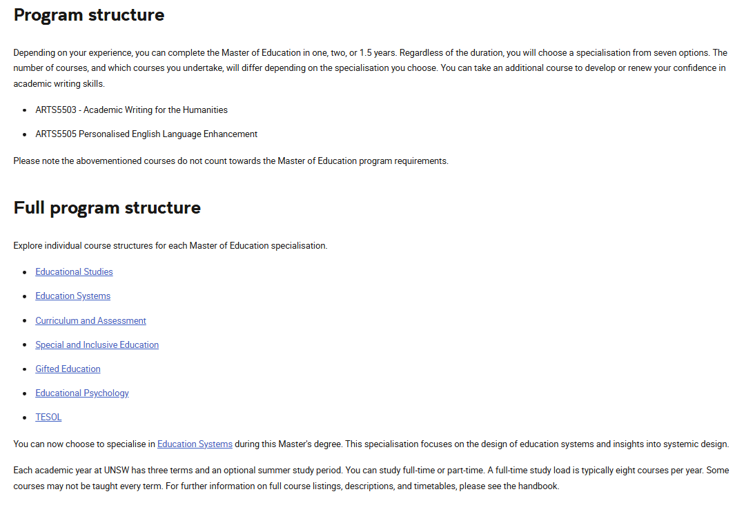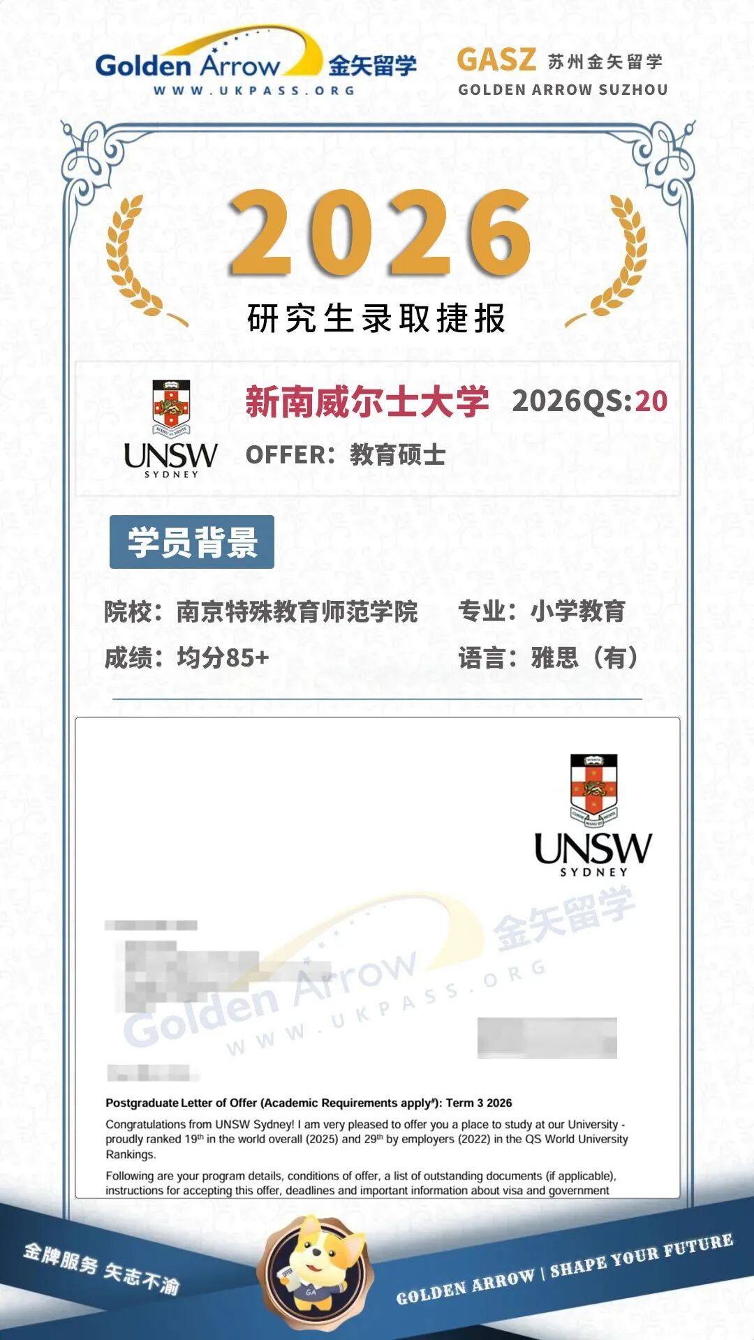![]() ![]() ![]() Offer 2026【2026 Offer 分享合集】—新南威尔士大学【教育】硕士 Master of EducationPART 01 ![]() Offer 展示 ![]() ![]() ![]() ![]() PART 02 ![]() 大学介绍 ![]() ![]() 新南威尔士大学 新南威尔士大学(University of New South Wales,简称UNSW),主校区位于澳大利亚新南威尔士州悉尼,是一所公立研究型大学。 该校是澳大利亚八校联盟的创始成员之一,还是环太平洋大学联盟(APRU)、全球科技大学联盟(GlobalTech)以及Universitas 21联盟组织的成员。 UNSW在多个领域享有极高的学术声誉,特别是在工程、商科、计算机科学、建筑和社科领域。 拥有5个学科居全澳之冠,分别是土木与结构工程、电气与电子工程、机械、航空与制造工程、会计与金融、统计与运筹学。 新南威尔士大学位居2026QS世界大学排名第20名,2025ARWU软科世界大学学术排名第80名,2026THE泰晤士高等教育世界大学排名第79名,2026U.S. News世界大学排名第34名。 ![]() PART 03 ![]() 专业介绍 ![]() ![]() 商学硕士 Master of Education