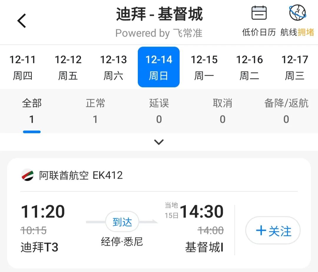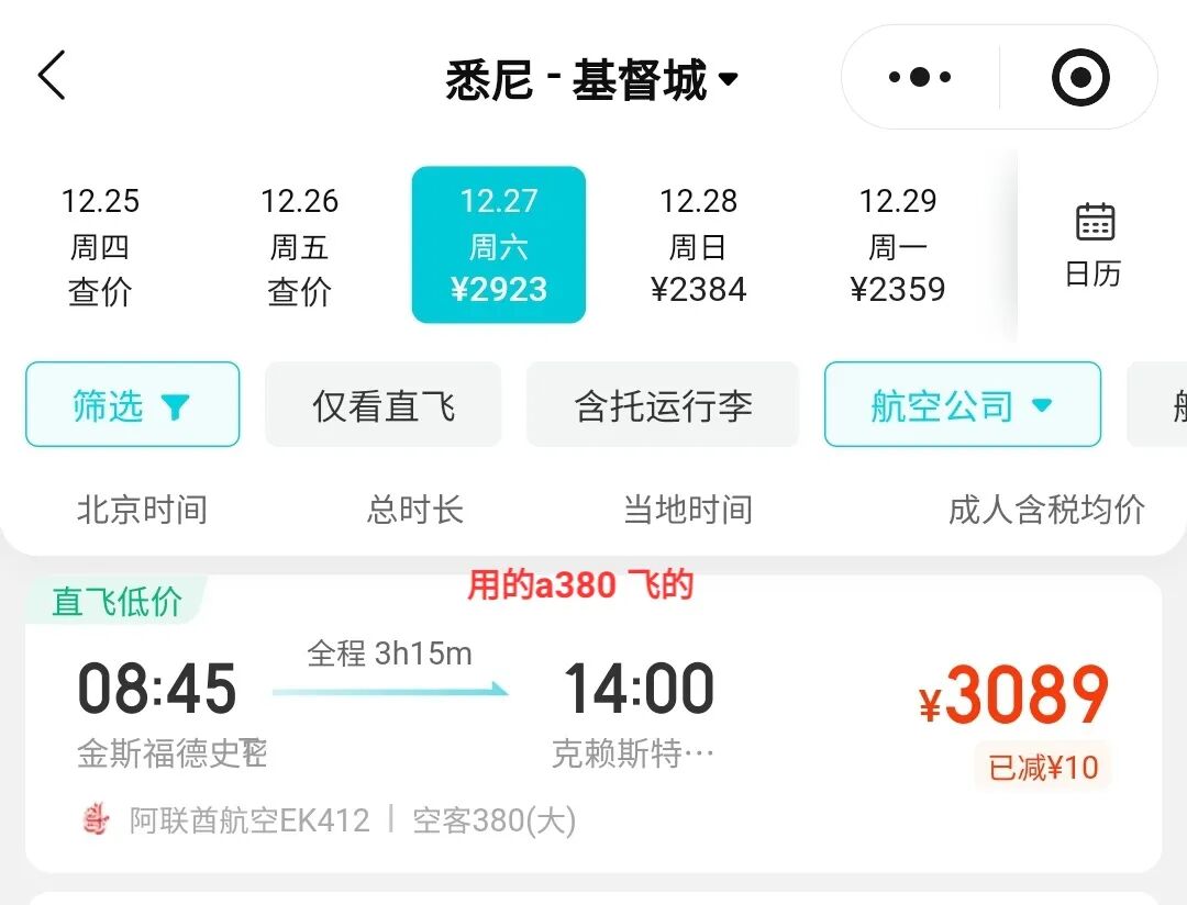 阿联酋航空迪拜飞新西兰基督城,经停悉尼。后段售票。此外,该航线全程用A380飞,阿联酋航空A380真是多~(下图)