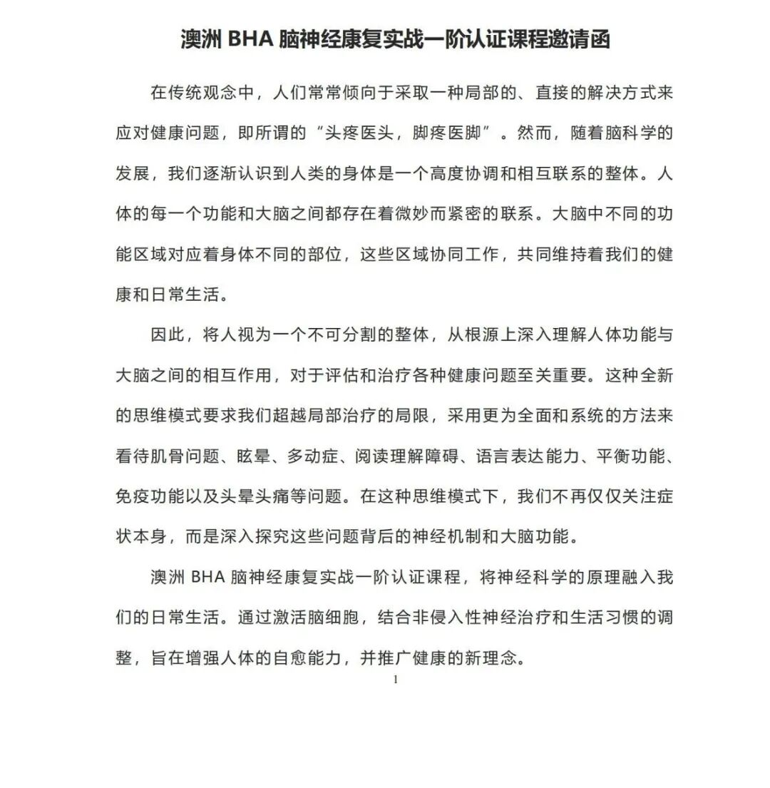 【深圳站】澳洲BHA脑神经康复一阶认证线下课程(2026年1月6-9日)