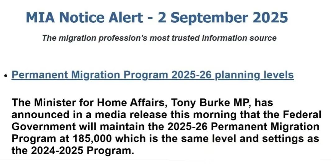注:具体数字可能根据实际需求微调,以上为大致配额。 ![]() 主要变化与趋势配额总量稳定:与2024-25财年相比,总配额保持稳定,但部分州根据经济发展需求略有调整。优先领域加强:各州将继续优先提名关键行业人才,如 ** healthcare(医疗)、教育、工程、IT、农业**等。偏远地区倾斜:部分州(如南澳、西澳、塔州)可能将更多配额用于支持偏远地区发展。商业移民调整:部分州减少了商业创新与投资计划(BIIP)配额,重心向技术移民倾斜。 ![]() 如果你正在规划移民澳洲,可以参考以下几类主流途径:一、技术移民适合学历高、专业能力强,且职业在澳洲紧缺清单上的申请人。常见签证类别包括189(独立技术移民)、190(州担保)和491(偏远地区担保)。热门行业涵盖IT、工程、护理、教育、会计、市场等。二、雇主担保移民如果你已获得澳洲认证雇主的工作offer,可通过186(永居类雇主担保)、482(临时技术短缺)或494(偏远地区雇主担保)等签证申请PR。三、家庭类担保移民主要通过配偶、父母或子女进行担保。其中配偶担保是较常见且成功率较高的方式。四、人才类签证原188签证已取消,与全球人才签证(GTV)合并为新的 “国家创新签证”(NIV),主要面向科研专家、行业领军人物等杰出人才。虽然本财年州担保配额有所减少,但澳洲对关键领域人才的引进政策并未改变。只要你职业对口、条件符合,依然有很大机会成功获邀。 ![]() |