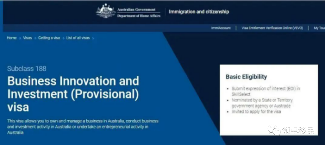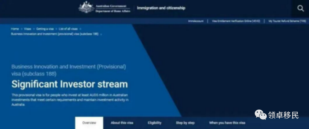 05 澳洲家庭团聚类移民 澳洲家庭团聚类移民,包含配偶移民、父母移民和子女移民。 澳洲的配偶签证包括300未婚夫妻签证、面对澳洲境外申请人的309配偶签证(临时)和100配偶签证(永居),以及面对澳洲境内申请人的820配偶签证(临居)和801配偶签证(永居)。 澳洲的父母类家庭团聚移民签证分为排队类和贡献类两种:103排队类父母移民签证,优点是花费低,但要排队等很长的时间。 贡献类父母移民签证包括:143贡献类父母签证(永居)、面向澳洲境内申请人的864贡献类年迈父母签证(永居)、173付费类父母签证(临居)、面向澳洲境内申请人的884高龄付费父母签证(临居)。 如果父母是澳洲公民或澳洲永久居民的孩子,还可以通过申请101境外子女签证和802境内子女签证拿到澳洲的永居签证。 06 澳洲商业投资移民 澳洲商业投资移民对申请人有一定经商投资经验、家庭净资产的要求。从188A的125万澳币(商业和个人净资产)到188C的500万澳币个人资产,另外还分别有经营生意或指定澳洲投资的要求。 1188A商业创新签证 ![]() 188A是澳大利亚政府用来吸引海外中小企业家,从而促进澳洲经济发展的一个签证。此签证一直以来都是中小企业家移民澳洲的首选途径,占据了188这个大类别约一半的配额。 188A/888A商业创新类签证更注重申请人的经商背景,对资金的投入要求相对较低,生意方式选择多样,非常适合国内中小企业的企业主。不管申请188A签证还是888A签证,在获得邀请申请签证之前,都需要先向意向州或领地申请州提名,而比较受欢迎的州或领地会在移民局要求的基础之上设置额外的要求,比如新州对申请人设置了最低投资额要求,维州对申请人所要经营生意的创新性设置了要求。 2188B投资者签证 ![]() 188B类投资者签证(Investor stream)是澳洲188类商业创新和投资临居签证(Business Innovation and Investment Visa)三种签证类别中的一种。此类签证类别是专门为想在澳洲从事投资活动或管理生意的投资者而设立的一种四年期的临居签证。申请人是否拥有企业或公司不是必要条款,但对申请人的投资能力比较看重,要求申请人具有突出的投资经历和经验。比较适合专业投资成功人士。满足条件时可以转888B类永居签证。 3188C重大投资者签证 ![]() 澳洲现行的商业投资签证中,188C重大投资者签证(Significant Investor,SIV)是为期5年的临居签证,申请人需要支付500万澳币给澳洲政府认可的基金组合,并真正在签证有效期内持有该投资,满足3年投资和居住要求后,可以申请永居签证。对申请人没有年龄上限的要求,无英文和学历要求,不需要进行EOI评分,居住要求非常宽松。 申请澳洲500万显赫投资者签证的重点也是难点在于证明资金来源。如果你是明星,证明资金来源证明倒也简单,也许拍几部电影、开一场演唱会就可以证明自己赚了500万澳币。但是,对于大部分申请人来说,还须证明如何合法获得500万澳币。 不过根据澳洲联邦的最新消息,政府将对澳洲移民系统进行全面审查,针对海外富人的188C重大投资者签证,或者取消,或者将重新制定(remake),因此留给188C申请人的时间非常有限。 ![]() 后疫情时代,劳动力短缺问题严重影响到澳洲经济恢复的进度。澳洲政府急需吸引大量移民前往澳洲,以解决各个行业的用人荒,推动经济的发展。 有澳洲移民计划的朋友们,不妨抓住机会,找准方向,定制合理的移民方案,早日实现移民心愿! 欢迎联系我们 澳洲移民顾问将1v1为您答疑解惑 定制方案 ![]() ![]() < PAST · 往期回顾 > 留学干货 # 一篇说清澳大利亚教育体系 # 萌新必知:澳洲行李这样打包 # 如何拿澳洲学历规划移民? 项目介绍 # 高考升学新途径—澳洲预科 # 就业新捷径—澳洲TAFE职业教育 # 澳洲硕士:授课型VS研究型 专业详解 # 供应链管理专业日趋火爆! # 高竞争力的建筑专业 # 网络安全宝藏课程 免责声明:本公众号为传播信息或转载其他媒体信息,部分素材和图片来源于网络,且文字和图片之间亦无必然联系,仅供读者参考。如涉及侵权,请联系我们删除,本公众号不承担此类稿件侵权行为的连带责任。未尽事宜请搜索“领卓出国集团”关注微信公众号,留言即可。 ![]() ![]() ![]() 点分享 ![]() 点收藏 ![]() 点点赞 ![]() 点在看 |