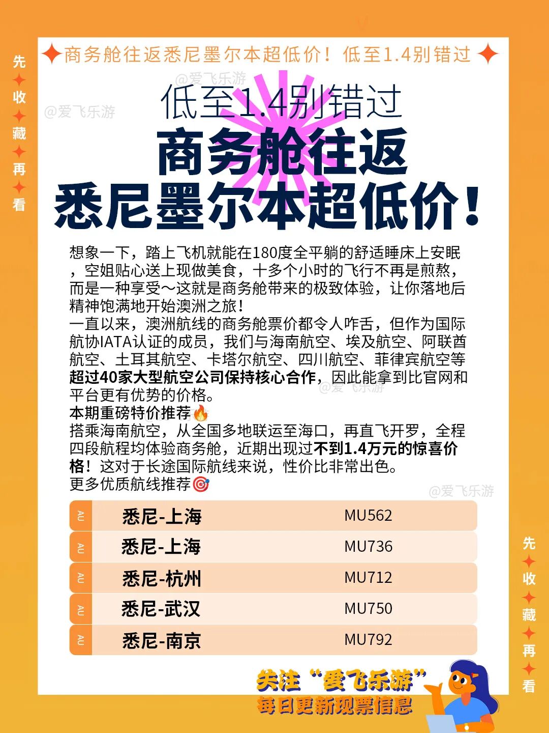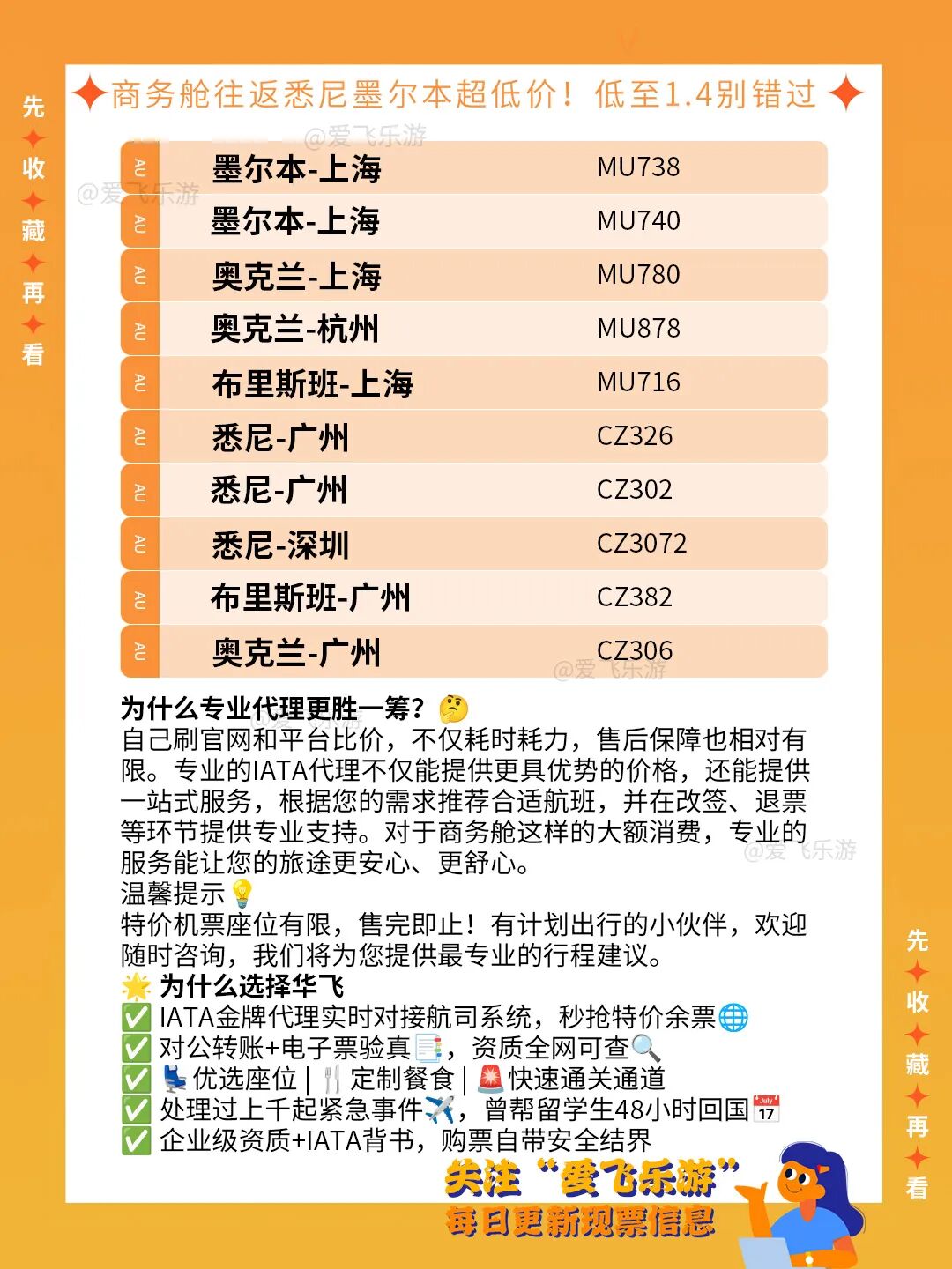 01.23![]() 想象一下,踏上飞机就能在180度全平躺的舒适睡床上安眠,空姐贴心送上现做美食,十多个小时的飞行不再是煎熬,而是一种享受~这就是商务舱带来的极致体验,让你落地后精神饱满地开始澳洲之旅! 一直以来,澳洲航线的商务舱票价都令人咋舌,但作为国际航协IATA认证的成员,我们与海南航空、埃及航空、阿联酋航空、土耳其航空、卡塔尔航空、四川航空、菲律宾航空等超过40家大型航空公司保持核心合作,因此能拿到比官网和平台更有优势的价格。 本期重磅特价推荐🔥 搭乘海南航空,从全国多地联运至海口,再直飞开罗,全程四段航程均体验商务舱,近期出现过不到1.4万元的惊喜价格!这对于长途国际航线来说,性价比非常出色。 ![]() 更多优质航线推荐🎯 东航航班: MU562 悉尼-上海 MU736 悉尼-上海 MU712 悉尼-杭州 MU750 悉尼-武汉 MU792 悉尼-南京 MU738 墨尔本-上海 MU740 墨尔本-上海 MU780 奥克兰-上海 MU878 奥克兰-杭州 MU716 布里斯班-上海 南航航班: CZ326 悉尼-广州 CZ302 悉尼-广州 CZ3072 悉尼-深圳 CZ382 布里斯班-广州 CZ306 奥克兰-广州 ![]() 为什么专业代理更胜一筹?🤔 自己刷官网和平台比价,不仅耗时耗力,售后保障也相对有限。专业的IATA代理不仅能提供更具优势的价格,还能提供一站式服务,根据您的需求推荐合适航班,并在改签、退票等环节提供专业支持。对于商务舱这样的大额消费,专业的服务能让您的旅途更安心、更舒心。 温馨提示💡 特价机票座位有限,售完即止!有计划出行的朋友,欢迎随时咨询,我们将为您提供最专业的行程建议。 ![]() 🌟 为什么选择华飞 ✅ IATA金牌代理实时对接航司系统,秒抢特价余票🌐 ✅ 对公转账+电子票验真📑,资质全网可查🔍 ✅ 💺优选座位 | 🍴定制餐食 | 🚨快速通关通道 ✅ 处理过上千起紧急事件✈️,曾帮留学生48小时回国📅 ✅ 企业级资质+IATA背书,购票自带安全结界 #澳洲机票 #国际商务舱特价机票 #澳洲回国机票 #留学澳洲 #中国赴澳洲机票 #澳洲回国特价机票 #澳洲商务舱 #澳洲商务舱特价机票 #悉尼机票 #墨尔本回国机票 【欢迎🕐随时☎️咨询❤️】 在线1对1 VIP咨询:小乐微信:afw832 在线1对1 VIP咨询 ![]() 长按识别添加小乐企业微信 关于我们 ![]() 国际商务舱专家! 让奢华飞行回归理性价值! 我们是连续经营22年的IATA一级代理,终结商务舱购买乱象!以22年航司深度合作网络,为您重构商务舱价值逻辑! 22年深耕 您专注云端体验,复杂交给我们解决! 我们是价格破局者: 卡航、阿航等40+航司核心代理资质,直享内部最高折扣 欧美/澳新/非洲/南美热门航线, 官网价6-8折锁定真商务舱 拒绝隐形消费,餐食/行李/休息室权益100%透明 我们是服务护航者: 7×24小时专属管家全程把控:从查价、签证匹配到紧急支援 航变/火山/疫情等突发危机快速响应 行前权益清单确认,杜绝伪商务舱陷阱 我们是资源掌控者: 航司黑屏系统直连,实时调取协议舱位 国际航线特价票智能捕捉 复杂行程多航司拼接优化 ![]() 点击这里添加小乐微信 微信公众号 爱飞乐游 小红书 爱飞网 抖音 爱飞乐游 联系及投诉电话:020-87535033 (工作时间:9:00~19:00) 联系及投诉邮箱:contact@aifei.com |