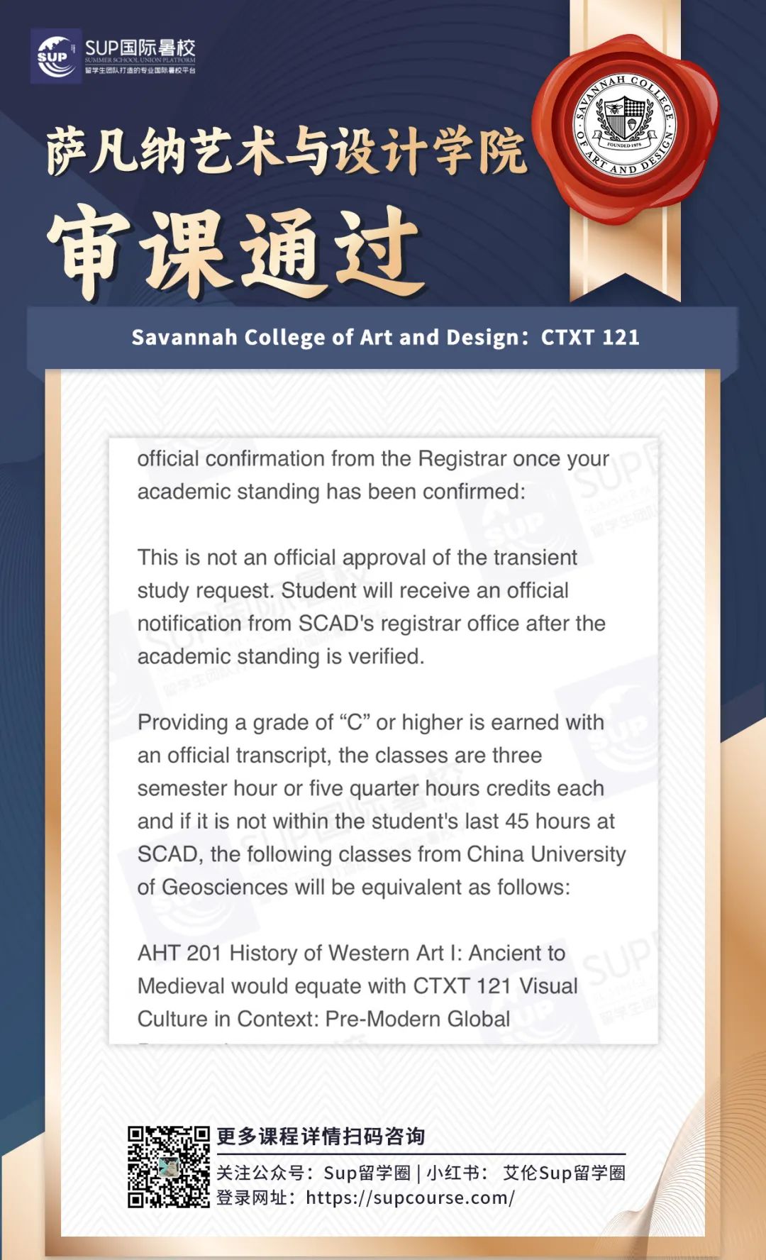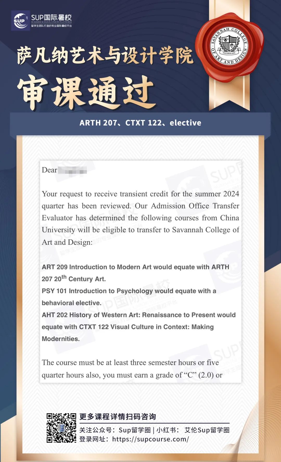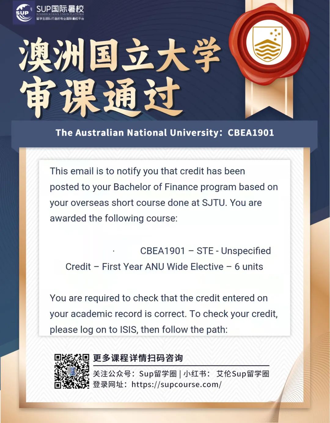 ![]() 宝子们,在北美上大学,学分制可是“必修课”,除了在校按部就班上课,假期其实还有隐藏副本可以刷—比如通过SUP国际暑校这样的正规渠道,在假期修读受认可的课程,然后把学分顺利转回本校! 这波操作最香的是啥?这些转回来的学分,不计入GPA!就像给绩点穿上了“金钟罩”,遇到那些难度爆表的“杀手课”,或者不确定自己能不能驾驭的硬核内容,完全可以考虑校外修课,既凑满了毕业所需学分,又完美避开了GPA被拉低的风险~ 这波操作简直是学业规划的“安全开关”,关键时候真的能救命!感兴趣的话,不妨了解一下SUP国际暑校的课程安排,给自己的学业加个“外挂”吧! ![]() -学校介绍- ![]() 悉尼科技大学(简称UTS)成立于1843年,前身为悉尼机械学院,是一所位于澳大利亚悉尼市的公立研究型大学,澳大利亚科技大学联盟(ATN)、中澳工科大学联盟(SAEUC)、世界大学联盟(WUN)、经AACSB认证的世界著名高校。 悉尼科技大学拥有多元文化的校园和充满活力的国际交流与研究计划,帮助毕业生为现在和未来的工作做好准备。学校有超过43,000名学生,其中国际留学生超过10,000名 ,是澳大利亚规模最大的高校之一。 ![]() ![]() -转学分政策- 为什么转学分如此重要?转学分不仅能帮你解决繁杂的文化课,还能让你更快适应留学生活的节奏,节省时间和精力。 选择专业并适合自己的转学分机构,可以让你在UTS的学习效率翻倍、更加从容。 ![]() 1⃣️ 转出学校和专业必须获得UTS认可。 2⃣️ 申请人必须提供详细的课程描述和学习成绩单。 3⃣️ 申请人需要与UTS的相关课程进行对比,找出相似的课程。 4⃣️ 转学分课程的学分必须与UTS对应课程的学分相当。 5⃣️ 转入的学分必须符合UTS的学术标准。 ![]() 审课截止时间:*至少在主办大学开课前四周递交申请 ![]() -转学分流程- 转学分注意事项 确定选课 与SUP暑校顾问老师沟通计划报读课程,以及当下优惠政策。 提交审课 1.在官网页面搜索Concurrent study UTS,打开网页后下载Application for Concurrent Study,Application中已经写明了审核所需要的所有文件的checklist,准备好所需的资料后通过email交给学校审核。 2.在Ask UTS的网页中提交第一步的Application Form,将要上课程的Syllabus作为附件提交。 等待上课 审课通过后,再根据学服老师的安排开始上课。 转学分 结课后,主办大学发送官方成绩单至UTS,收到成绩单后,转学分成功。 注意事项: 1. 审课过程中,收到邮件答复后请及时将信息同步给学服老师; 2. 如需补交材料,请第一时间和暑校学服老师联系,我们会妥善安排,及时提供。 -扫码了解更多审课政策及优惠- ![]() ![]() -悉尼科技大学对课表- SUP国际暑校开设了许多满足UTS同学需求的各科课程,以下是UTS热门课程推荐。 ![]() ▲可以上下滚动的图片 ![]() -选择SUP国际暑校的优势- ![]() 节省留学费用 SUP暑校致力于为留学生提供绝佳课程质量、高性价比的国际学分课程,费用仅为本校50%甚至更低,在提高学生不同学术体验的同时,还能省钱、放心。 缩短毕业时间 SUP暑校提供灵活,丰富的授课形式和课程选择,线上+线下的上课方式,可以让每一个学生合理利用假期时间,提前完成学位要求,留出更多时间去规划未来。 3V1全方位服务 资深顾问、学服老师与售后老师联合打造3V1式个性化服务,确保每一个学生顺利完成转学分流程,给留学生提供优质的国际学分项目。 ![]() -加入SUP留学路上不孤单- ![]() SUP暑校会组织参加各种线上及线下活动,有机会认识各大高校不同领域的留学生,可以互相交流经验,丰富课余生活,拓宽人际社交圈。 SUP国际暑校部分学员案例 ![]() ![]() ![]() ![]() ![]() ![]() ![]() **向下滑动查看内容 -扫码了解更多审课政策及优惠- ![]() 岁序更迭,新程启幕新年特别活动已上线把专属福利打包送给奔赴新岁的你! 活动期间立享¥2026新年专属优惠福利力度拉满! ![]() ![]() ![]() ![]() ![]() ![]() ![]() ![]() ![]() ![]() |