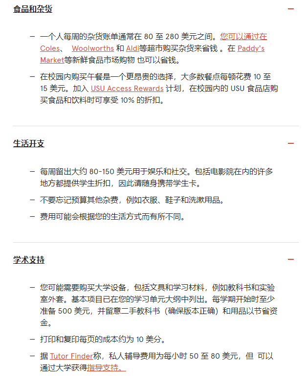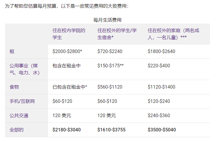 ![]() 0 2 住宿费 ![]() 除了学费,住宿费也占留学开支的大头。尤其是从去年开始,一些热门城市,比如悉尼墨尔本,房源紧张,房费也随之水涨船高,目前住宿费用可能要比前几年高一些。 1.校内宿舍 绝大多数学校都提供校内住宿,但一般数量有限,申请要趁早。 校内住宿价格其实不会比校外租房便宜很多(可能更贵?),像悉尼大学,房费用177澳币-371澳币/周不等,价格取决于房型不同会有浮动,一般单人间价格会更高一些。 2.校外租房 校外租房可选择的房型会更多,哥在real estate上查询了悉尼地区的租房情况,有一定可选空间,有400澳币左右一周的公寓,也可以选择合租三人1000澳币一周的公寓,合租当然更划算些。 不过校外租房还会产生水电煤气等账单,还需要置办一些电器家具,这些都是额外的花销。 ![]() 03 生活费 ![]() 关于生活费,澳洲内政部对此的建议是:“作为单身学生,您必须能够证明您有经济能力支付每年至少 21,041 澳元的生活费用”。 不过具体花多少,我们可以参考不同澳洲大学的"官方建议"。 悉尼大学 据悉尼大学的建议,学生每周花费在生活、饮食、娱乐上的费用大约在160-430澳币之间,如果是外出吃饭费用会更高一些。 虽然多数学习材料都是电子版,但学校仍建议学生准备出500澳币/学期的书本费。 官网链接:https://www.sydney.edu.au/study/fees-and-loans/other-costs/living-costs.html ![]() 昆士兰大学 昆士兰大学则给出了更加详细的费用指导。 包括1升牛奶价格为$1.6,普通一杯咖啡价格为$4.5,如果你需要乘公交,费用在$1.73至$10.43之间。 官网链接:https://study.uq.edu.au/university-life/living-in-brisbane/cost-living ![]() 感兴趣的同学先在大学官网搜索下当地的生活费用大概是多少。 如果你是比较喜欢旅游购物,或你有打工的计划,留学成本也会有上下浮动。最后我们以昆士兰大学为例,计算一下澳洲留学一年的费用大概会是多少。 学费方面,如果你选择的商科、计算机等专业,费用大概在23w人民币左右一年;人文社科类专业费用会在19w人民币左右一年。 选择学校住宿,一年的生活费大概在13-17w人民币,校外住宿一年生活费大概在9-21w人民币。 所以整体来看,如果你选择了昆士兰大学,一年的费用大概会在30-40w人民币之间,不同地区院校会有上下浮动,大家要根据自己的情况进行评估。 ![]() END 为了让同学留学路上不孤单, 更好地准备留学申请,哥已成立了: 英国、澳洲、加拿大、 美国、新西兰、爱尔兰 等申请交流群 快扫码进群拥抱组织吧! ![]() ![]() ↶戳阅读原文可免费预约1v1咨询 |
