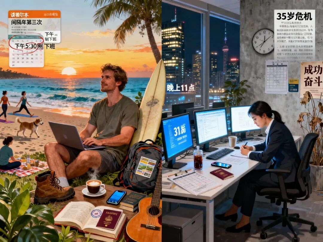 一个人30岁还在咖啡馆打工,你有没有想过,这算成功还是不成功 在中国, 好像答案挺清楚的,30岁还没有稳定工作、没买房、也没有明确的职业规划,这样的人就会被贴上loser的标签。 可是在墨尔本的街头,我碰到了Tom Tom,今年30岁,在一家咖啡馆做服务员, 他有墨尔本大学的工程学位,毕业后在一家矿业公司干了两年,然后就辞职。 ![]() 辞职之后,他去新西兰做了一年农场工人, 在泰国教了半年英语,在印尼学了三个月冲浪,之后回到墨尔本,就在这家咖啡馆打工。 他说这是他的第三个gapyear 我就问他,“你不担心职业发展吗,不担心以后找不到好工作吗, 他瞅着我,眼神里带着点儿疑惑,「为什么要担心,我现在过得可挺开心的」 那时候,我忽然就感觉到,我们根本就不在一个路子上 在中国的职场文化中, gapyear差不多就是个忌讳词,它代表着简历上有空白,代表着不够积极上进,代表着被同龄人落下了。 ![]() 领英2023年的一项调查表明,78%的中国HR表示会对简历中超过半年的职业空白期有疑虑, 而在澳大利亚,那个比例只有23%。 更让人吃惊的是,澳大利亚统计局的数据显示, 18到30岁的澳洲年轻人里,超60%的人至少有过一回gapyear经历。 这不是个别现象,这就是一种文化 Tom跟我讲,他很多朋友都有差不多的经历, 有的大学毕业之后去欧洲背包旅行了一年,有的工作几年之后辞职去南美洲当志愿者,有的30多岁还在不同国家之间流浪着。 「我们并不觉得这有什么不对,人生那么长,为什么非得匆匆忙忙把自己固定在一个轨道上」 他的这话让我开始琢磨事情, 我想到自己大学同学 毕业那阵儿,所有人都在疯狂投简历, 面试,拿offer,没人敢停下来,没人敢说我想歇一年, 仅仅因为我们都清楚,一旦停下,就会被落下, 我们的人生,从出生就开始一场竞赛,不能输在起跑线上,不能比同龄人差,不能浪费什么时间, 幼儿园得去最好滴, 小学要进重点滴,中学要考上名校,大学要找份好工作,工作要赶快升职, 每一步都不能慢,每一步都不能错 澳洲的朋友Sarah听完我的话之后,笑了,说道, 「你们中国人活着好辛苦」 她说得没错,我们确实挺累的 ![]() 智联招聘2024年的数据显示,中国职场人平均每周工作时长是46.8小时,这比澳大利亚的38小时要高不少,在一线城市, 这个数字更是达到了54小时。 我们没太多时间去旅游, 没太多时间去探索,没太多时间去思考自己真正想要的是什么, 我们就只有时间工作,工作,工作 因为我们心里有恐惧,恐惧被淘汰,恐惧被超越,恐惧35岁失业, 恐惧40岁中年危机, 但澳洲人好像不害怕这些 Tom说,他的父母从来没督促他找一份正规工作,他们仅仅问他,你开心吗 在中国的家庭里,这个问题很少被问到 别把父母更在意的是,你工作是不是稳定, 你收入高不高,你什么时候买房子,你什么时候结婚 开心这个词,在人生规划当中,仿佛是最不重要的 当然,这里面有挺深的社会方面的原因 澳大利亚有挺完备的社会保障体系,失业了有救济金,生病了有医疗保险,养老有退休金, 就算暂时没工作,也不会陷入生存方面的危机。 可在中国,社会保障体系还不怎么完备,失业就意味着没了收入来源,意味着可能付不起房租, 意味着可能看不起病之类的。 别不敢停下来,因为停下来代价太大 澳洲的最低工资是每小时23.23澳元(约合人民币110元),就算去当服务员, 也能够保持基本生活, 在中国, 一线城市的最低小时工资标准是每小时24到26元,这样的收入,连房租都很难支付, 所以,Tom能自在地在咖啡馆打工, 去探索人生的各类可能性,而我们却只能使劲工作,为了一个不确定的未来。 但这样的生活,真的是我们想要的吗 ![]() 我认识一位在上海工作的朋友,她在一家互联网大公司当高管, 年薪50万,她每天早上8点到公司,晚上11点才离开,周末还要处理工作邮件,她已经连续3年没有休过假期了。 她说道, 「我不敢休假,一旦休假,项目就会被别人接手,我害怕回去后,就没有我的岗位了」 她今年35岁,还没结婚,也没时间谈恋爱,她的父母十分担心,但她说,“等我再升一级,等我再多挣些钱,我就能轻松了, " 但那一天,真的会到来吗 Tom在咖啡馆工作的时候,会和顾客聊天,天气好的时候会去海边冲浪, 周末会跟朋友去野外露营, 他的生活挺简单的,可他看起来挺高兴 而我那个年薪五十万的朋友,好像很成功,可是她眼睛里,没什么光彩 我不是说澳洲的模式就一定更好, 每个国家有不一样的国情,每个人有不一样的选择, 但我想要说的是,或许我们可以停下来想想,我们这么拼命,到底是为了什么 是为了在朋友圈晒出更好的职位,是为了在同学聚会上有更多谈资, 还是为了证明自己没被时代落下 要是这些都不是,那么我们真正想要的,是什么 墨尔本的傍晚,我和Tom坐在咖啡馆外面的长椅上 ![]() 夕阳把整个城市都染成了金色,街上的人们慢慢地走着,没人在赶时间, 也没人在玩手机, Tom说, 「你知道不,我以前也特别焦虑,我觉得自己得有一份体面的工作,得买房,得按照社会的期望去生活」 「可后来我发现,那不是我想要的生活,我想看看这个世界,想试试不一样的事情,想弄清楚自己到底喜欢什么」 「所以我就选了这样的生活,也许在别人眼里,我特别没用,可我觉得自己特别幸运」 他的这番话让我默默地沉默了好长时间 我想起了那个年薪50万的朋友, 想起了那些在写字楼里加班到深夜的人,想起了那些为了房贷车贷使劲工作的人~ 我们都在追
