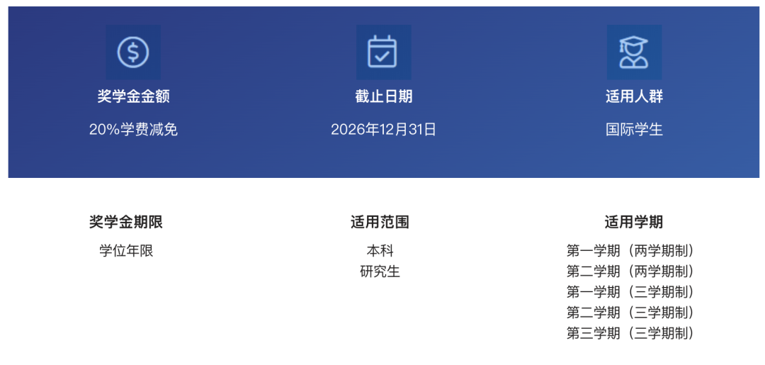 申请课程要求 这一奖学金适用于所有的授课类课程(包括所有的本科、研究生证书、研究生文凭及授课类研究生课程),但不适用于就读兽医学(Bachelor ofScience (BSc) in Veterinary Biology),(Doctor of Veterinary Medicine (DVM))以及临床心理学(Masterof Clinical Psychology)。 如何申请 该奖学金无需单独申请,当你符合奖学金的申请条件时,将自动获得。 授予方式 本奖学金相当于20%的学费减免,入读并注册课程时,将自动从学费中减免。 ![]() 22026国际未来奖学金 适用课程 本科课程