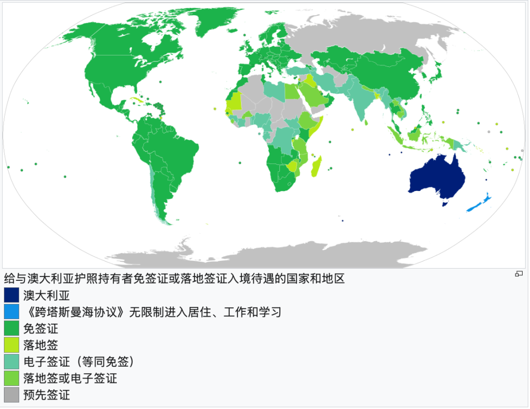 作者:Troy陈💚国际旅行/经济/出入境政策分享✈️用数据尊重社会,了解世界 🇦🇺澳大利亚护照(Australia passport)是澳大利亚公民的出国旅行证件,根据亨利护照指数显示,截至2026年2月,澳大利亚护照可免签和落地签前往全球大约182个国家或地区,通行度全球第7(不同机构统计数据有差异),排名和欧盟国家护照相当。澳大利亚人口约2780万(2026年1月),人均GDP大约6.5万美元,在全球属于高度发达国家,也是热门的移民留学目的地。 ![]() 澳大利亚公民前往各国/地区的签证要求 澳大利亚护照(Australian Passport) 是全球认可度和含金量较高的护照之一,由澳大利亚外交贸易部(DFAT)签发。 一、基本信息 护照封面:深蓝色,印有澳大利亚国徽 语言:英语(部分页面含法语说明) 生物识别:电子护照(含芯片) 有效期:16岁以上10年,16岁以下5年 ![]() 澳大利亚护照当前版本(2022年9月发行) 二、免签与通行能力(含金量) 截至近年国际排名,澳大利亚护照通常位于全球前5–10名。大致通行能力免签或落地签国家约185–190个。 主要免签地区:欧盟申根区,英国,日本,韩国,新加坡,加拿大(需eTA),美国(需ESTA电子授权),🇨🇳中国(大陆30天,香港,澳门,台湾),新西兰(无限制),巴西,阿根廷,墨西哥,南非等。前往主要大国仅俄罗斯需要签证,印度为电子签 总体评价澳大利亚护照是全球通行力极强,属于顶级护照梯队。 三、护照优势 国际信誉度极高:澳洲政治稳定、信用评级高,签证拒签率低。 双重国籍允许:澳大利亚允许公民持有双重或多重国籍。 英联邦身份优势:作为英联邦国家成员,公民在英国等国家有较便利待遇。 全球居住便利性:澳大利亚公民在新西兰拥有较宽松的居留和工作权(特殊类别签证)。 四、全球含金量大致梯队 第一梯队:日本、新加坡、法国、德国等 第二梯队:澳大利亚、加拿大、英国、韩国等 第三梯队:部分东欧和拉美国家护照 五、获取方式 出生即为澳大利亚公民 技术移民→永居(PR)→入籍 与澳洲公民结婚后入籍 特殊贡献入籍 六、整体评价: 澳大利亚护照被认为是“世界上最昂贵的旅行证件”,自2026年1月1日起,澳大利亚成人护照办理价格涨到422澳元(约2000人民币),办理价格非常昂贵!截至2023年底,约有1420万澳大利亚公民(占总人口的50%以上)持有有效的澳大利亚护照,虽然澳大利亚距离遥远,但由于收入较高,护照通行度高,也是全球出境游主力军之一。 根据资料显示,2024年澳大利亚居民约进行了约1160万次海外旅行(全年),2025年预计达到约1260万次出境旅行,创历史新高。这意味着每年出境人次接近全国人口的一半(同一人可能多次出境),明显高于很多人口大国,属于全球出境旅游率较高的国家之一,在发达国家中处于较活跃水平。以上内容仅供参考! ![]() 澳大利亚护照信息页 查看更多🌏全球各国/地区护照免签范围,出入境政策,入境游客数据,邀请您加入“Troy陈去旅行”知识星球查看更多(世界护照)内容! ![]() 作者:Troy陈💚国际旅行/经济/出入境资讯分享✈️用数据尊重社会,了解世界 |