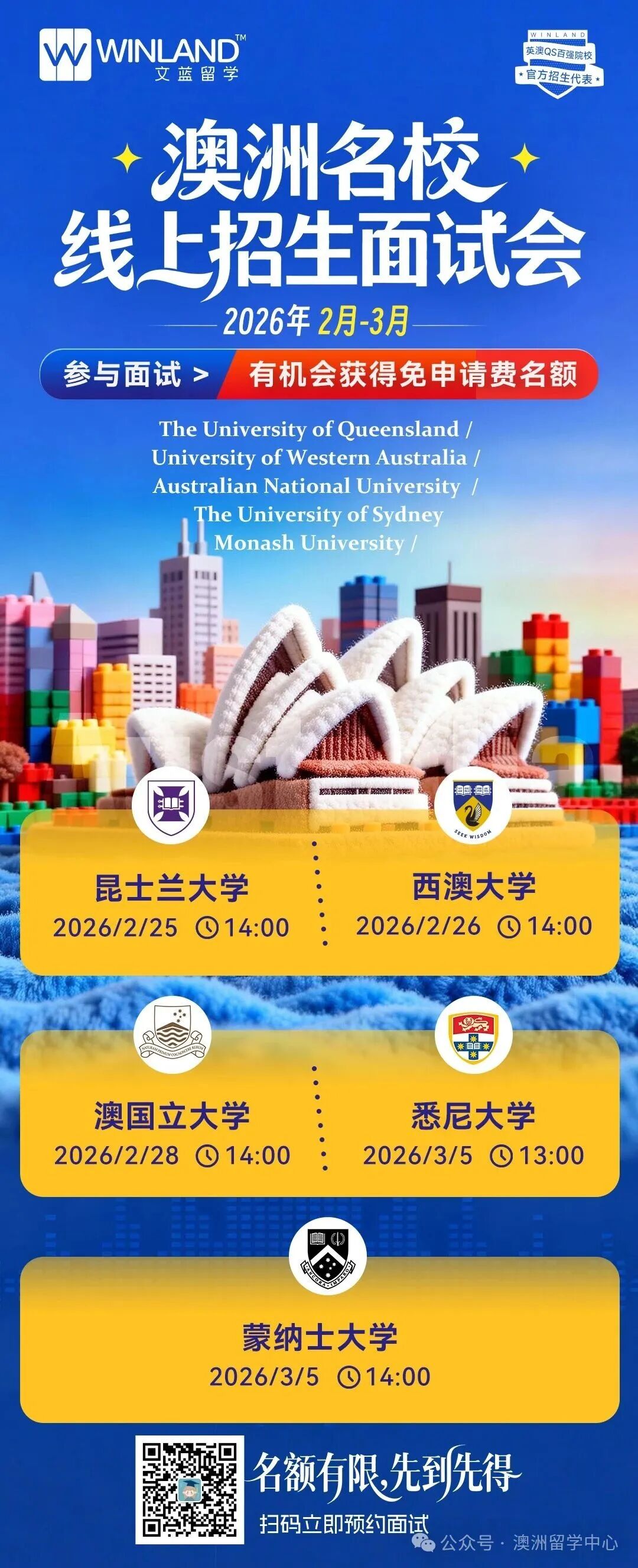 烟酒及现金均有明确限额,切勿心存侥幸,以免影响入境记录。 三、充分准备,才能从容赴澳2026 年的澳洲留学之路,在政策调整之下,挑战与机遇并存。 真正的关键,不在于“配额增减”,而在于—— 是否提前规划、是否理解规则、是否做好准备。 只要准确把握政策变化,合理选择路径,认真完成行前与落地准备,澳洲依然是一个值得投入、值得期待的留学目的地。 ✨ 你的澳洲名校梦,从这场面试会开始! 文蓝留学携手澳洲 TOP 院校,打造线上招生面试会 昆士兰 / 西澳 / 澳国立 / 悉尼 / 蒙纳士… 名校齐聚 参与面试即有机会免申请费,一站式对接招生官,扫清申请疑问 2026 年 2-3 月,为你的留学之路助力!扫码预约→奔赴更好的未来🌏 ![]() 想要申请澳洲留学的宝子,赶快准备起来吧!如果你在准备申请的过程中,遇到困难,我们可以提供包含规划与申请、背景提升、PS文书指导、标化语言考试辅导、笔面试辅导…等帮助,为目标名校的你,精准把控各个申请节点,有效提升个人综合实力! 添加微信,即可定制专属于你的本/硕/博留学方案!👇 ![]() 更多英国、美国、澳洲、加拿大、新加坡、中国香港 本硕博留学规划、考研、求职、雅思托福Alevel/IB/AP/国际竞赛相关问题,添加微信:liuxuezixunzhongxin详细咨询 ![]() 欢迎把这篇文章分享给有需要的人~ 版权声明:图片及内容大部分源于网络,版权归作者所有,如有侵犯权益,请私信处理。 点击“阅读原文”预约留学咨询 ![]() |