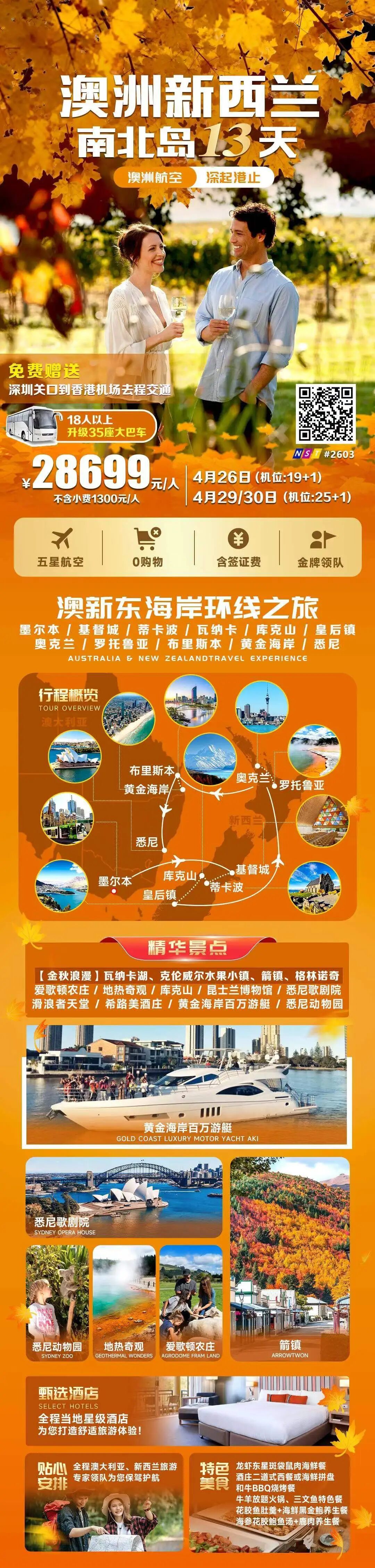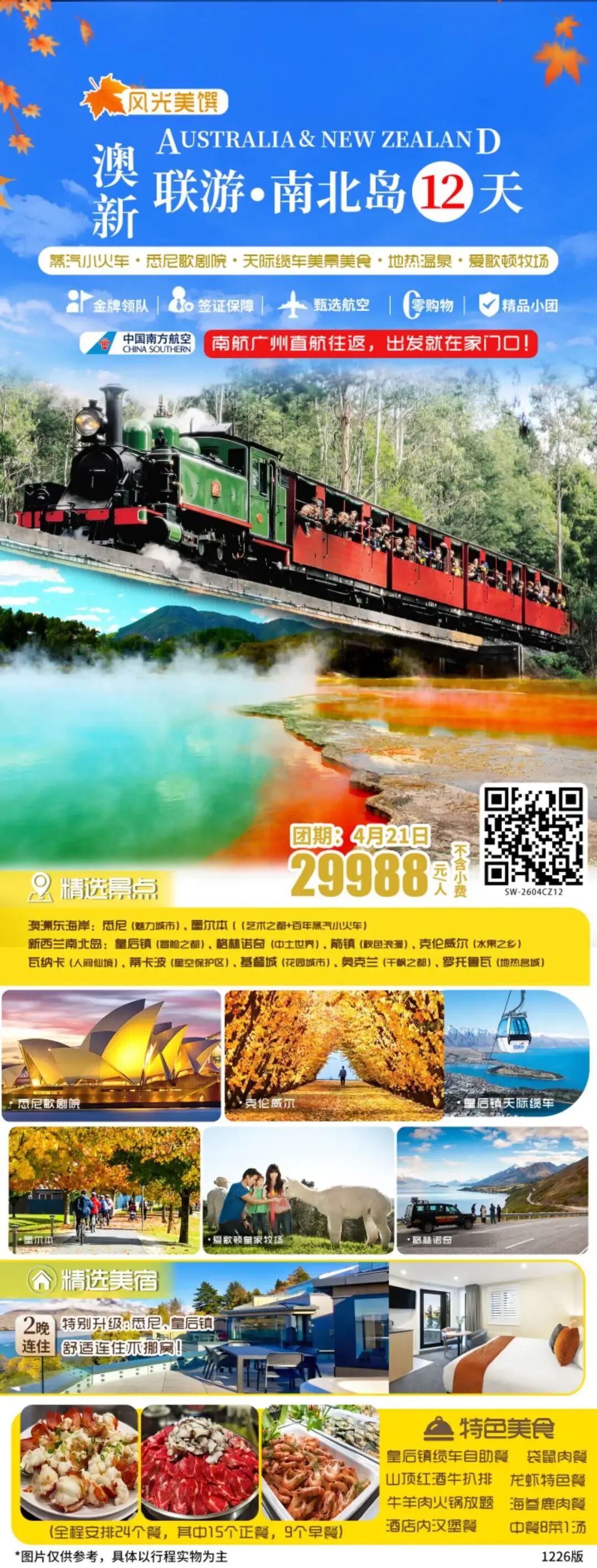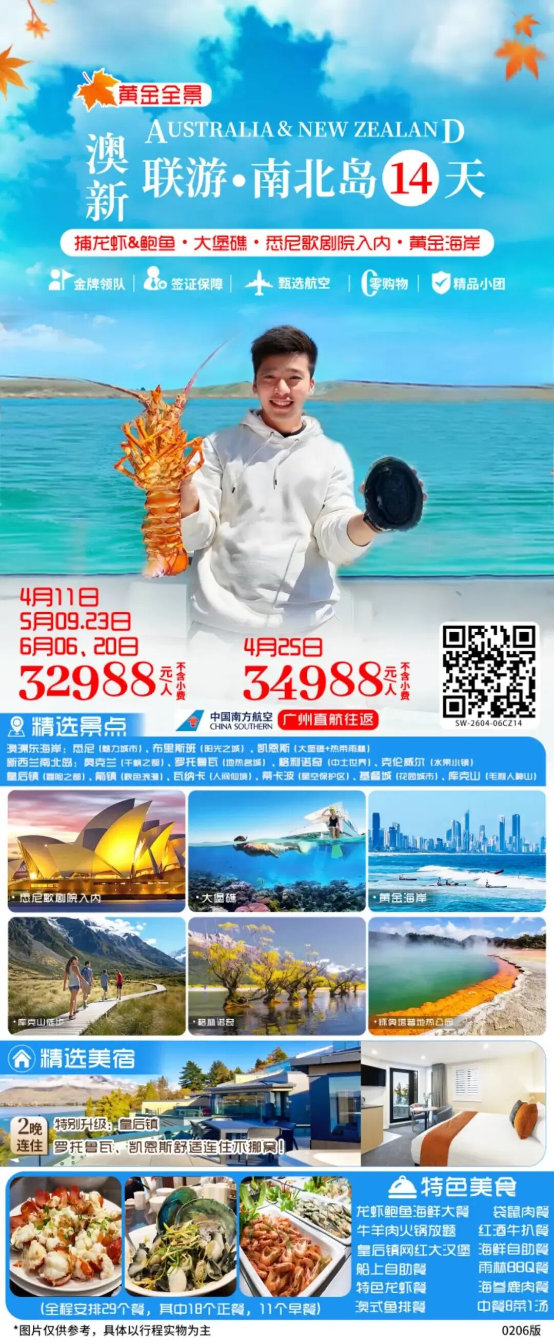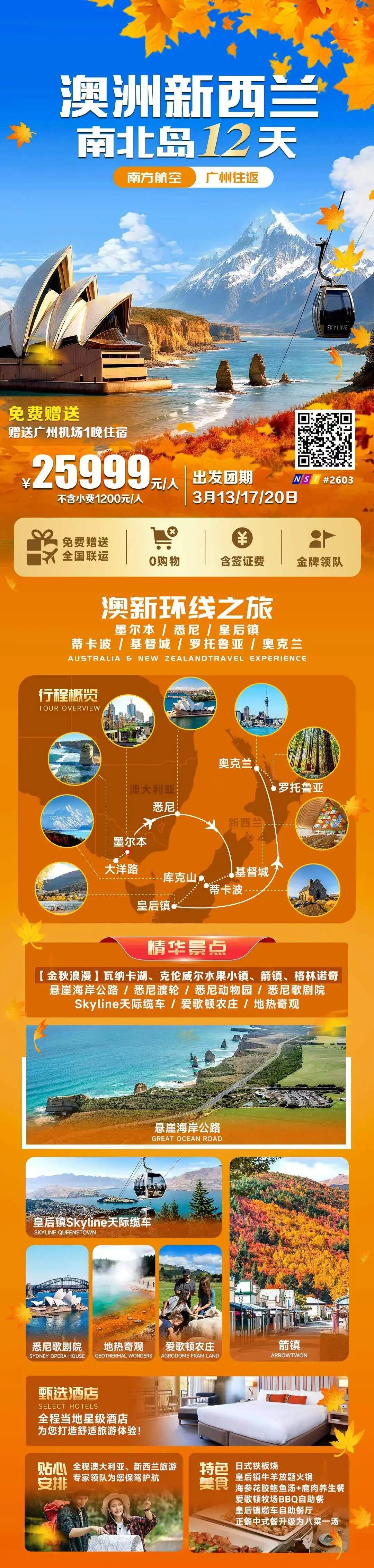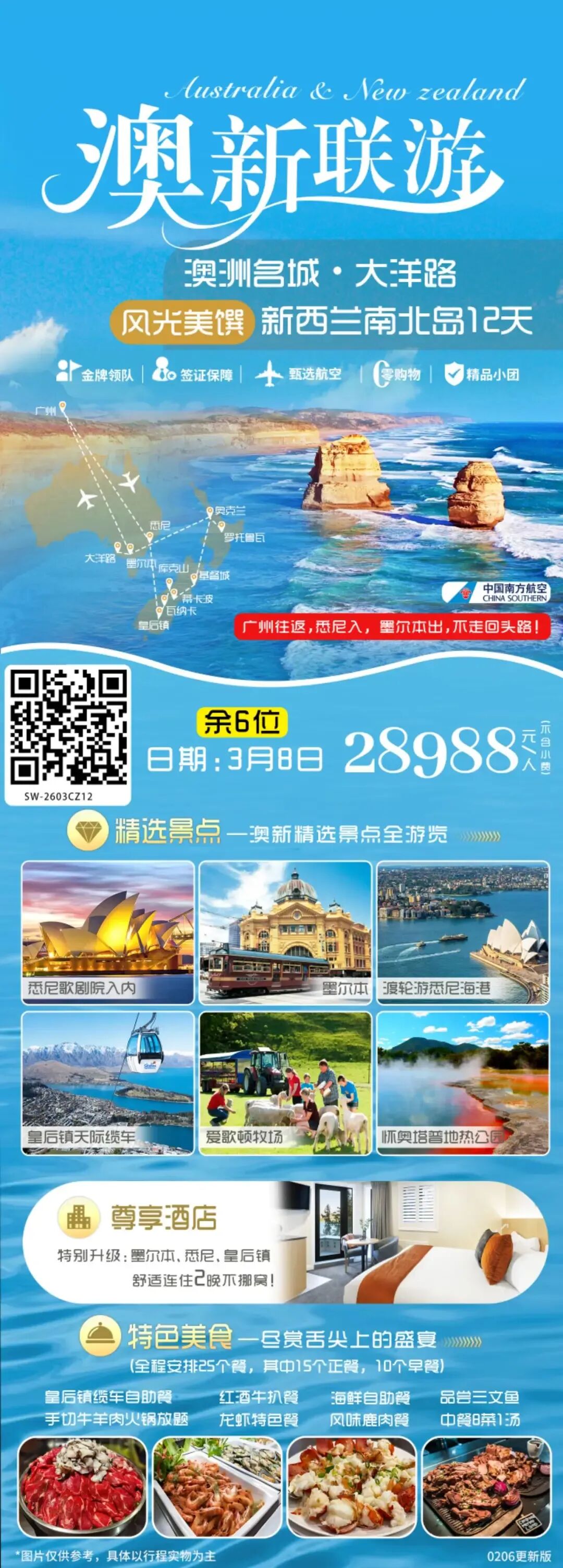 旅行社经营许可证:L-GD-CJ100114,广东省内跟团旅游、国内跟团旅游、出国跟团旅游服务,更多旅游咨询,请添加客服微信:li42608727 🔥 4-6月金秋美景澳新联游14天(澳洲东海岸名城大堡礁+新西兰南北岛) ❤ 澳新全线完美行程一网打尽 ✈ 南航广州直飞澳新不走回头路 🎶 悉尼地标歌剧院入内参观 🌴 世界最古老热带雨林水路两用车 🌊 世界七大奇观之一绿岛大堡礁 🍒 金秋澳新美景游童话小镇 🚢 出海捕龙虾鲍鱼好吃又好玩 📸 打卡南岛四大湖泊美翻圈 ⛲ 地热名城奇观爱歌顿农场游 🏰 多地连住豪华酒店享舒适旅途 🍴 9大当地特色餐引爆味蕾 ![]() 🔥 【赏花品樱 • 玩转澳新】12天 澳大利亚大洋路深度 • 新西兰南北岛 ——南航 • 广州直飞 • 不走回头路—— 🌊 打卡大洋路|深度至美海岸线 🍒 樱桃园|当季樱桃任摘任吃 🎭 悉尼歌剧院——入内参观 🐨 萌宠双馆深度体验——赠考拉合照 🚡 高空缆车登顶|享山顶自助餐 🦙 地热名城奇观|爱歌顿农场特色游 🌿 红木森林天然氧吧|壮观难忘 🦌 豪吃龙虾鹿肉牛扒牛羊火锅美食季 🏨 皇后镇连住2晚|深度漫游 多地连住|享舒适旅途 ![]() 🔥26年0421【风光美馔 玩转澳新】澳洲大洋路深度新西兰南北岛鲁冰花12天 ✈ 南航豪华客机直飞不转机 🚞 普芬比利百年蒸汽火车 🎶 悉尼歌剧院入内参观 🏰 皇后镇连住两晚舒适安排 🚡 高空缆车自助美食美景 ⛰️ 库克山轻奢徒步体验 🍁 秋色浪漫箭镇格林诺奇 🦙 地热名城奇观爱歌顿农场特色游 🌿 红木森林天然氧吧壮观难忘 🍴豪吃龙虾鹿肉牛扒牛羊火锅美食季 🦀 餐标升级中式8菜一汤,满足中国胃 ![]() 🇦🇺澳大利亚🇳🇿新西兰南北岛12天 星级航空🔴南方航空 广州往返🛫3月17/20日 超值实惠价💹¥25999元/人 ㊙大洋路十二门徒岩 港湾渡轮㊙与细说悉尼璀璨繁华 悉尼动物园㊙打卡澳洲考拉袋鼠 皇家牧场爱歌顿㊙和羊驼们互动 怀欧塔普地热公园㊙独特的地貌 皇后镇天空缆车㊙赏美景品美味 美食升级㊙特色海参花胶鹿肉餐 10年以上金牌领队🥇贴心服务 ![]() 🇦🇺澳大利亚🇳🇿新西兰纯南岛11天 星级航空🔴南方航空 广州往返🛫4月9日 超值实惠价💹¥24699元/人 希路美葡萄酒庄㊙景致品酒之旅 悉尼动物园㊙打卡澳洲考拉袋鼠 昆士兰博物馆㊙探寻历史与自然 阿卡罗阿㊙出海捕捞龙虾黑金鲍 探寻魔戒㊙的中土世界格林诺奇 皇后镇天空缆车㊙赏美景品美味 美食升级㊙东星斑生蚝海鲜野味 10年以上金牌领队🥇贴心服务 ![]() 🇦🇺澳大利亚🇳🇿新西兰全景15天 星级服务🛫南方航空 广州往返:4月12日 超值实惠价💹¥34999元/人 升级四晚住㊙五星酒店完美体验 探索绚丽海底花园㊙绿岛大堡礁 ㊙大洋路十二门徒岩 世界的自然遗产㊙蓝山国家公园 罗托鲁瓦㊙体验波里尼西亚温泉 皇家牧场爱歌顿㊙和羊驼们互动 皇后镇天空缆车㊙赏美景品美味 美食升级㊙特色海参花胶鹿肉餐 10年以上金牌领队🥇贴心服务 ![]() 🇦🇺澳大利亚🇳🇿新西兰全景15天 星级服务🛫南方航空 广州往返:5月19日 超值实惠价💹¥31999元/人 升级两晚住㊙五星酒店完美体验 ㊙大洋路十二门徒岩 私人游艇㊙叹澳式富豪日常生活 罗托鲁瓦㊙体验波里尼西亚温泉 皇家牧场爱歌顿㊙和羊驼们互动 探寻魔戒㊙的中土世界格林诺奇 美食升级㊙特色海参花胶鹿肉餐 10年以上金牌领队🥇贴心服务 ![]() 🇦🇺澳大利亚🇳🇿新西兰南北岛12天 星级航空🔴澳洲航空 深起港止🛫4月26日 超值实惠价💹¥28699元/人 希路美葡萄酒庄㊙景致品酒之旅 私人游艇㊙叹澳式富豪日常生活 徒步丈量㊙库克山冰川国家公园 皇家牧场爱歌顿㊙和羊驼们互动 怀欧塔普地热公园㊙独特的地貌 探寻魔戒㊙的中土世界格林诺奇 美食升级㊙特色海参花胶鹿肉餐 10年以上金牌领队🥇贴心服务 ![]() ![]() |