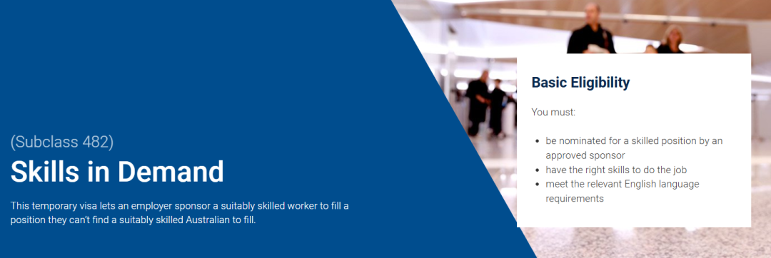 这条路径的核心不在分数,而在于你的实际工作能力和市场匹配度。雇主通常会重点评估这个岗位是否真实紧缺,以及你是否具备足够的经验(一般要求3年以上),同时英语能力也需要能够满足工作环境。不过,随着担保成本和合规要求的提高,企业在选择担保对象时变得更加谨慎,往往更倾向于已经在澳洲、有本地经验的人。因此,对于完全在海外的申请人来说,如果没有特别突出的背景,难度正在逐渐上升。 这条路径更适合已经在澳洲工作或留学的人,或者在某一领域具备明显优势、能够快速匹配岗位需求的人。同时,在当前环境下,越来越多申请人选择:先走482临时工签,再转186永居。 ![]() 482签证(临时技能短缺签证) 482签证(临时技能短缺签证)让你可以在澳洲合法工作,而186签证(雇主担保永居签证)则是最终目标——获得永久居留权(PR)。当你在持有482签证期间为担保雇主工作满规定年限,并满足年龄、英语等要求后,就可以通过186签证的临时居民过渡通道(TRT)申请PR。 从482签证转到186永居签证,需要满足的关键硬性条件有四个: