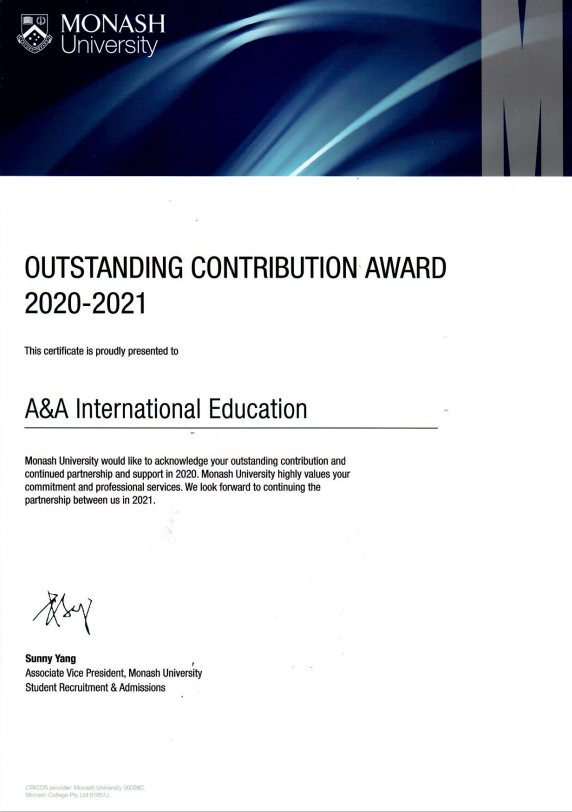 2020-2021年,AA留学收获了澳大利亚昆士兰大学、蒙纳士大学、查尔斯达尔文大学所颁发的多项留学机构大奖! 01 荣 誉 时 刻 ![]() 昆士兰大学 最具价值合作伙伴大奖 A A 喜 报 AA留学荣获2020昆士兰大学最具价值合作伙伴大奖! ![]() 昆士兰大学 University of Queensland 昆士兰大学(UQ)位于澳大利亚布里斯班,始终位于世界顶尖大学之列——2024年QS世界大学排名第43位,2023年U.S.世界大学排名第36位。 昆士兰大学位于昆士兰州东南部,三大美丽的校区分别坐落在圣卢西亚、赫斯顿和加顿。 02 荣 誉 时 刻 ![]() 蒙纳士大学 杰出贡献合作伙伴大奖 A A 喜 报 AA留学喜获蒙纳士大学杰出贡献合作伙伴大奖! ![]() 蒙纳士大学 Monash University 澳洲蒙纳士大学是澳大利亚最大的大学,位列世界大学顶尖前100,澳大利亚八校联盟成员之一。 2024年QS世界大学排名最新发布,蒙纳士大学位列世界第42名 荣 誉 时 刻 03 ![]() 查尔斯达尔文大学 冉升之星大奖 A A 喜 报 AA留学荣获查尔斯达尔文大学所颁发的冉升之星奖,成为CDU全球合作伙伴最佳表现之一,AA留学再上新台阶! ![]() 查尔斯达尔文大学 Charles Darwin University 查尔斯达尔文大学是位于澳大利亚北领地的唯一一所公立大学, 提供从职业教育到高等教育(本科、研究生、博士)等综合学历课程。 校区主要分布在达尔文、帕默斯顿、爱丽丝泉、悉尼。毕业生起薪和就业率分别在全澳大学排名第一与第二。 ![]() 联系我们 实现留学梦想 |
