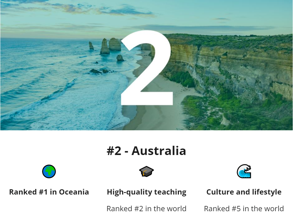 第1则 最佳留学国家-澳洲全球第二 近期,2023年全球十大最佳留学国家排行榜重磅出炉! 该榜单根据全球195+个国家、20,000多名学生的调查采访评选出了全球最佳留学国Top10。 澳大利亚,在该榜单中超越了99%的国家斩获全球第二名?,成为南半球最佳留学目的国Top1!澳大利亚登榜“全球最佳留学国家”根据官方数据,该排名针对数以万计的留学生进行了调研,最终根据以下7个排名指标评选出全球十大最佳留学国家。 ![]() 其中澳大利亚: