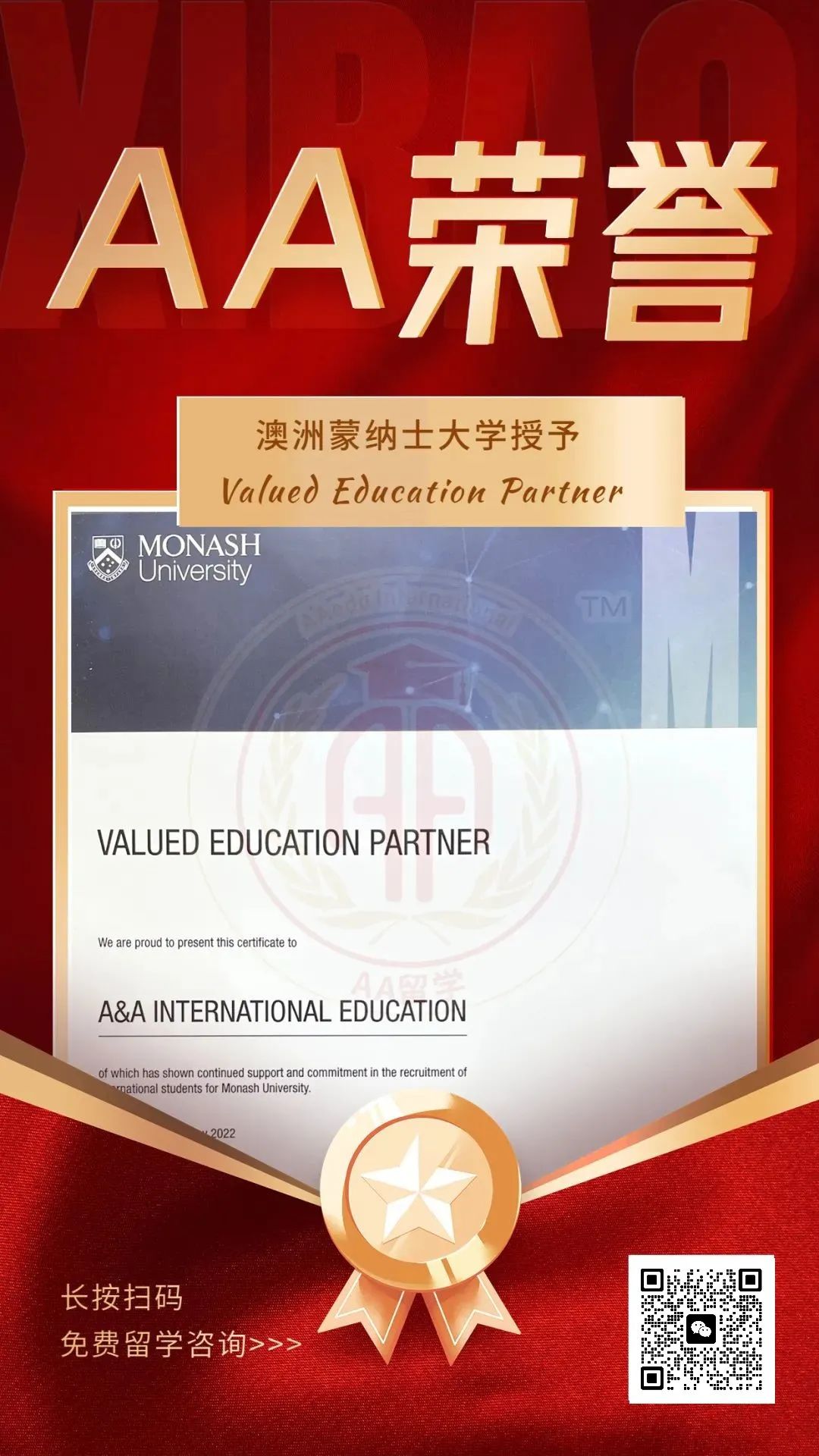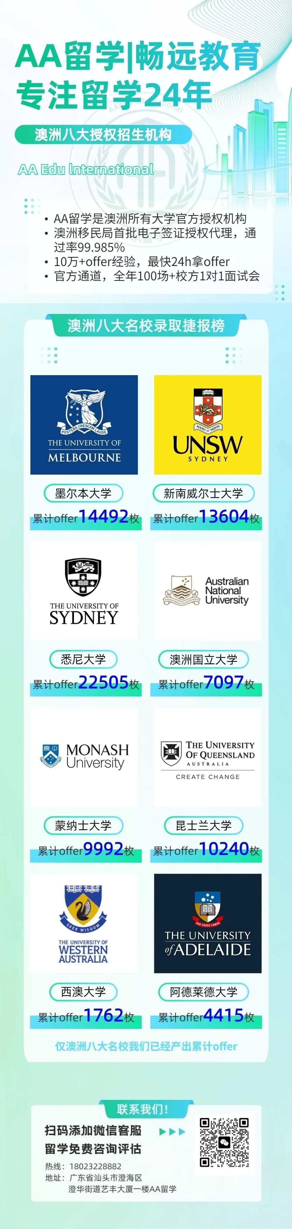 喜讯!2022年,澳洲八大名校蒙纳士大学向AA留学授予“最具价值合作伙伴奖 ”(Valued Education Partner),以此表达对AA留学过去一年杰出表现的感谢! 2022年11月,AA留学成功申请108枚蒙纳士大学offer,为上百名学子拿到心仪名校录取。 AA留学是澳洲所有大学官方授权机构,专注澳洲留学23年,10万+offer经验,欢迎同学们咨询出国留学方案! ![]() 9月20日,将举行蒙纳士大学专场活动 欢迎感兴趣的同学们报名参与! ![]() 蒙纳士大学世界排名 Monash University 蒙纳士大学再创佳绩,位列 US News 世界大学排名第33名、泰晤士世界大学排名第44名。 在全澳排名第二,无论从任何维度进行排名,蒙纳士大学都是一所位居世界前50的顶尖级综合大学。 热门专业 Monash University ![]() 药学 蒙纳士大学在药学与药理学领域位列世界第一。药学与药物科学学院以培养学生和教师的学习热情及尊重多元文化的理念而闻名。 学院接纳世界各地的学生,其中有大约35%的本科生是国际学生。 商科 蒙纳士商学院是世界领先的商学院之一,荣获全球三大商学院认证机构 AACSB ( 国际精英商学院联合会) 、EQUIS(欧洲质量发展认证体系)和 AMBA(英国工商管理硕士协会)三重认证,获得精英“三皇冠”认证。 IT 在澳大利亚八校联盟中,蒙纳士大学是唯一一所专门开设IT信息技术学院的高等院校。 蒙纳士 IT 信息技术学院的专业课程在每个类别中都被评为 “领先于世界标准”。本科课程都得到了澳大利亚计算机协会(ACS)权威认证。 三皇冠商学院认证,蒙纳士大学商科本科专业推荐! AI、游戏开发、网络安全...能想到的IT专业蒙纳士大学都应有尽有! 蒙纳士大学药学世界第一,本硕热门课程推介!名校面试会火热抢位中! 欢迎申请蒙纳士大学中国学生国际助学金,学费减免8千澳币! ![]() |