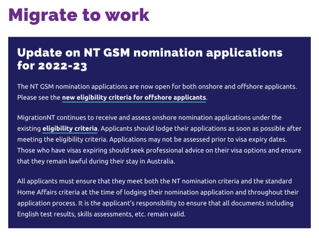 ![]() ![]() //前言// 就在昨天,北领地官宣开放海外申请人通道!给国内疫情中的小伙伴们又开了一扇门!目前该政策针对海外申请人,基本只提名491哦~ ![]() ![]() ![]() 下面小编就给大家详细介绍下该政策对海外申请人的要求细节有哪些~ 一、基本要求 1. 被邀请时,年龄需要在45岁以下 2. 申请人的职业需要在提名的职业清单上,并且需要做一份全面的职业评估 3. 雅思最低要求四个6,同时北领地也接受其他语言考试类型,比如PTE和托福 4. EOI最低65分入池 二、其他要求 1. 在毕业后的10年工作中,至少有3年和提名职业相关的工作经验 2. 承诺在会长期在北领地居住和工作,比如获签后需要在北领地居住和工作至少3年 3. 需要提供在北领地生活的财产证明,比如银行流水、股权证书、财产或珠宝首饰估值等都可以,而且根据申请人和副申请人的人数不同,要求也有差异,下图的金额可作为参考~ ![]() 三、北领地海外申请人三个类别 职位优先类别 此类别主要优先考虑NTOMOL职业清单上70多个指定职业的海外申请人,并且申请人需要做全面的职业评估,这些职位包含了技工类,工程类、社工类、医学类、厨师类、服务类、教师类和护理类等岗位,比如空调维修工、计算机或软件工程师、社区工作者、牙医或精神病学家、烘焙师、理发师、小学教师、注册护士等职位都可以申请,不过值得注意的是有些岗位需要提供相关的执照或能力证明哦,同学们可以参考下图~ ![]() ![]() 北领地亲属关系类别 此类别主要优先考虑在北领地有亲属关系的海外申请人,主要有以下几点要求: 1)申请人至少有1名亲属在北领地居住,且该亲属需要满足以下所有条件: