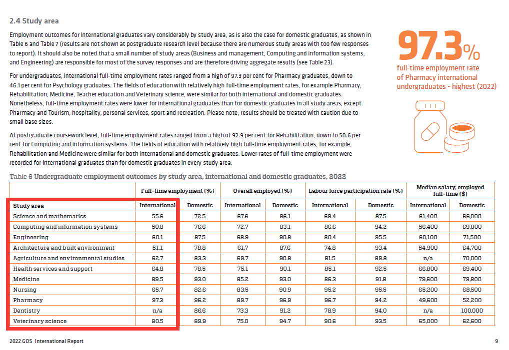 ![]() 众所周知,澳洲留学有两大优势,一是高质量的教育体系和扎堆的世界名校;二是澳大利亚特有的PSW485毕业后工签政策,可以为留学生提供毕业后在当地就业工作的机会! 即使没有移民澳大利亚的打算,毕业后如果能在当地持有效工作签证工作一段时间,积累一些海外工作经验,之后再回国就业发展也会更加有竞争优势。 ![]() 那么如果想在留学后获得好的就业机会,应该参考哪些数据?选择哪些大学和专业呢?新姐今天就为大家来详细解读! ![]() 澳洲PSW485工签 澳洲的留学后PSW485工作签证机会,为中国留学生完成2年以上的学业之后继续留在澳洲工作,积累海外工作经验,提供了可能性。 尤其在2023年2月,澳洲政府在经历全球疫情之后,更是出台了一系列的利好政策,吸引留学生在当地就业工作,以应对疫情后的劳动力短缺问题,尤其是对于在技能紧缺领域的一些留学毕业生。 ![]() 根据最新政策信息,符合条件的学生将获得临时毕业生工作签证(485类)时长更新如下: *符合要求的学士学位毕业生:4年(此前为2年) *符合要求的硕士学位毕业生:5年(此前为3年) *所有博士学位毕业生:6年(此前为4年) 根据澳大利亚就业与技能部和教育部制定的要求,申请人需要同时满足: 1. 提名的职业需要在2022年技能优先职业列表中 2. 申请人所读的课程要在认证的课程列表中 对于所有符合资格的留学生,在2023年7月1日持有效工签,或者在2023年7月1日之后申请工签都可被考虑延长两年。如再结合此前非大都市地区的留学生延长工签,还可再获得1-2年的工签延长。 ![]() 那么哪些专业的毕业生可以获得更长的485呢? 目前官方公布了一份可获得更长485的职业学历指示性列表,目前短缺职业主要集中在了医疗、教育、工程、IT、农业等几大领域。 ![]() ▲485职业学历指示性列表(部分)▲ *完整榜单可后台回复关键词“485”领取~ ![]() 澳洲高就业率专业TOP10 除了485职业学历指示性列表,还有哪些数据可以反馈不同专业的就业情况呢?QILT就是一个比较权威的参考。 QILT全称为:The Quality Indicators For Learning and Teaching,即为“学习与教学质量指数”。该指数为澳洲联邦政府发布,专为正在或即将在澳大利亚接受高等教育的学生提供可靠的参考指数。 ![]() 图源:QILT《2022年国际毕业生成果调查》 根据今年2月出炉的2022澳洲毕业生成果调查报告,2022年国际毕业生本科就业率较高的几个专业主要还是集中在医疗相关行业,就业率最高的前十位依次为: *本科国际毕业生全职就业率&专业领域方向: 97.3%:Pharmacy药剂 89.5%:Medicine医学 89.5%:Rehabilitation康复专业 83.3%:Teacher Education 教师教育 80.5%:Veterinary science兽医 71.0%:Tourism, hospitality, personal services, sport and recreation旅游酒管类 65.7%:Nursing护理 64.8%:Health services and support健康服务和支持 62.7%:Agriculture and environmental studies 农业和环境研究 62.2%:Social work 社会工作 ![]() 图源:QILT《2022年国际毕业生成果调查》 在硕士学历的国际毕业生中,医疗相关专业的就业率仍是排在前几位的,其中,康复专业达到92.9%,医学、护理、教师、法律相关等专业也非常受欢迎。 *硕士国际毕业生全职就业率&专业领域方向: 92.9%:Rehabilitation康复专业 91.9%:Medicine医学 72.4%:Nursing护理 68.1%:Psychology心理学 67.3%:Teacher Education 教师教育 65.5%:Law and paralegal studies法律相关学科 63.1%:Social work社会工作 62.5%:Communications传媒 61.9%:Architecture and built environment 建筑与环境 61.8%:Agriculture and environmental studies农业和环境研究 ![]() 图源:QILT《2022年国际毕业生成果调查》 据近三年数据来看,全职就业率最高的大学前5位大学中,依次为雅芳黛尔大学Avondale University 66.7%、詹姆斯库克大学James Cook University 58.6%、昆士兰大学University of Queensland 56.1%、新英格兰大学University of New England 55.6%和新南威尔士大学55.3%。 ![]() 图源:QILT《2022年国际毕业生成果调查》 其中,在毕业生薪资收入方面,也并不是根据排名越高薪资也越高,实际情况是:詹姆斯库克大学的国际本科生全职平均工资最高,为75,300澳元,其次是纽卡斯尔大学University of Newcastle为68,000澳元和艾迪斯科文大学Edith Cowan University 62,800澳元。 ![]() 图源:QILT《2022年国际毕业生成果调查》 ![]() 澳洲高就业率大学&专业推荐 最后,新姐给大家推荐几个澳洲留学就业率高的大学和专业: 护理 ![]() 图源:veer 护理专业一直是澳洲申请的热门方向,教学质量享誉全球。在2023QS全球大学学科排名中, 共有10所澳洲大学进入全球护理专业前50强。在澳洲学习护理专业,在校期间学生有大量实践机会,毕业后可以在不同的医护领域内服务,包括医疗护理、老人护理、产妇及婴儿护理等。 根据Job Outlook数据显示,在澳大利亚,注册护士平均年薪中位数可达$99,268澳币,从事护理行业的工作人员平均年薪中位数可达$65,780澳币,薪资水平还是非常可观的。 推荐院校 西悉尼大学 >>>> 推荐理由: 护理本科课程全澳排名第一,紧缺职业,超高就业率96% 西悉尼大学坐拥南半球最大的护理学院之一,独一无二的医院实习和就业机会 800小时医院临床实习,与课程同步进行。金牌注册护理双认证——澳大利亚护士与助产士协会认证(ANMAC)和澳大利亚健康行业从业人员注册机构认证(AHPRA) 全悉尼三分之二的医疗卫生专区集中在大西悉尼地区,就业机会繁多。 药剂 ![]() 图源:veer 全球范围的老龄化加大了市场对药品和药剂师的需求。澳洲的