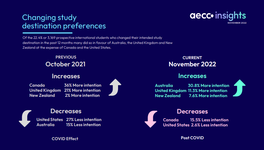 报告更是显示,截至22年11月底,澳洲犹如逆袭黑马,在21年留学意向下降15%之后,一跃成为第一,增加30.8%。