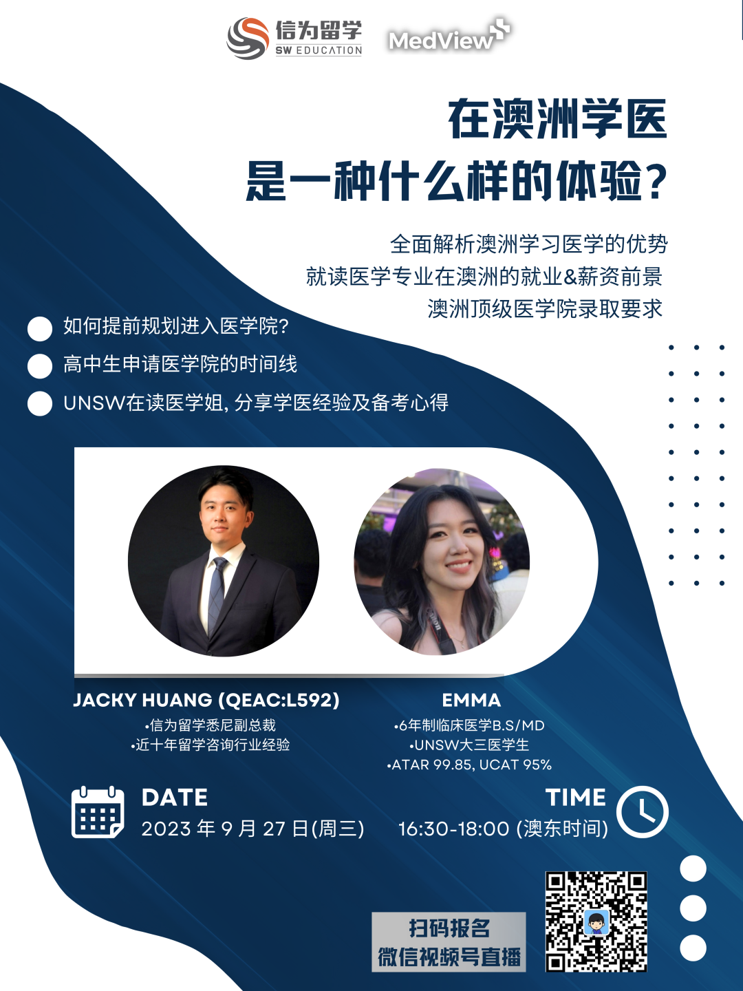 ![]() ![]() ![]() ?敲重点啦❗❗❗ 亲爱的同学们! 你是否一直梦想成为一名医生或从事医学领域的工作? 无论您是已经在医学之路上迈出了第一步 还是正在考虑未来的医学学习之路,我们都邀请您参加我们 信为留学&MedView 澳洲医学专业专场讲座 即将在本周三在微信视频号直播 ✔开播时间: 2023年9月27日 16:30(澳东时间) 在这次直播中,您将有机会: 听取成功的医学生分享他们的经验和建议。 了解澳大利亚医学专业的入学要求和申请流程。 获得专业顾问的指导,解答您的问题。 参与在线互动,提出您关心的问题。 ![]() 直播内容