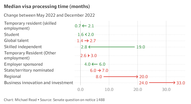 ![]() 图片来源:网络 政府已经在本财政年度削减了这两个签证的配额数量,据悉工党会接受格拉坦研究所和生产力委员会全面改革的建议。 其中,BIIP旨在针对在当地进行大量投资或经营企业的高净值个人。 而这个签证也是中国申请者移民澳洲的重要通道。 根据澳洲内政部的数据,自2012年11月该项目启动以来,已有超过2300个SIV获得批准。其中有85%的签证发放给了中国内地的申请者,5%发放给了来自香港的个人申请者。 也就是说有超过90%的签证都发给了中国申请者,数量大约在7000份,并且在SIV签证实施的十年间,没有1名申请者因品格测试不过关而被拒签。 但报告称,该项目不成比例地吸引了低收入、年龄较大的移民,与其他技术移民相比,这些移民很难转化为劳动力。 ![]() 图片来源:网络 O’Neil去年9月就已经指出,BIIP备受争议的重大投资者签证可能会被取消。 格拉坦研究所估计,获得BIIP的人在澳大利亚一生平均要花费纳税人12万澳元,相比之下,雇主担保的永久签证持有者能产生56万澳元的正财政红利。 该智库估计,取消BIIP并将配额重新分配给技术签证将在未来30年为联邦和州政府节省多达340亿澳元。 数据显示,劳工部在本财政年度将BIIP的名额从13500个减少到5000个,并重新分配给技术工人签证名额,以帮助解决工人短缺问题。 #02: 全球人才签证将取消 相关报告将被公开 除此之外,澳洲前总理莫里森价值数百万澳元的全球人才签证也处于风口浪尖。 莫里森在任期间,联邦政府于2018年7月启动了全球人才签证计划的有限试点,承诺吸引最优秀和最聪明的人才,以提高澳大利亚在高科技新兴产业的能力。 全球人才候选人必须证明自己有出色的专业成就记录,并证明自己在澳大利亚的年薪将超过16.2万澳元。 在莫里森政府执政期间,该项目迅速扩大规模,但通过该项目发放的签证中,近60%发放给了已经在澳大利亚的人。这个签证项目旨在吸引海外商业领袖来澳大利亚。 ![]() 图片来源:AFR 在2022年5月的联邦大选后,工党对境内申请人关闭了这项计划,并将申请人的名额从1.5万个削减至5000个。 此前,内政部为该项目投入了大量资源,其中包括一个由38人组成的“全球人才官员”团队,在华盛顿特区、旧金山、新加坡、台北和伦敦寻找高技能的专业人士。 O’Neil周证实,她已经收到了这份报告,并准备在5月9日预算案公布之前,将报告的部分或全部内容公之于众。 据悉,Parkinson博士领导了这次评估,同行的还有阿德莱德大学法学教授、临时劳工移民专家Joanna Howe,以及德勤前合伙人John Azarias。 #03: 移民职业清单被取消? 技术移民签证加速审理 关于移民体系改革,此前还有一些消息,也是很多申请人非常关注的。 例如关于如何才能在国际人才市场中吸引到更多劳动力进入澳洲,生产力委员会的观点是:政府不仅需要简化移民流程,更需要降低移民难度。 因此,生产力委员会希望澳洲政府能够废除技术移民职业清单。 同时将移民限制条件提高,只要年薪超过8.5万澳元,就应该允许雇主引入技术移民。 ![]() 图片来源:AFR 根据这个建议,雇主只需要证明他们为潜在技术移民提供的薪酬高于一定水平,移民的签证就会获得批准。 生产力委员会的这个提议也得到了不少澳洲机构的支持,比如说Grattan Institute就认为这个提案非常有意义。 不仅能加速签证处理时间,也能更快速且精准的解决澳洲各行业劳动力短缺的问题。 而现在澳洲高新技术人才短缺,但移民职业技术清单更新缓慢,以至于很多高科技公司无法招聘到适合的员工。 同时各机构也认为,以8.5万澳元年薪为界限,不仅能够吸引到更多成熟工种,同时也能够为政府贡献更多税收。 生产力委员会估计,每个雇主担保技术签证对财政的净影响为55.7万澳元,而一个独立技术移民在一生中会给澳洲的财政带来38.6万澳元的收入。 工党对移民体系进行审查之际,联邦政府正准备应对移民潮。 ![]() 图片来源:The Conversation 财政部预计,从当前财年到下一财年,澳大利亚将有65万移民净流入。 根据澳大利亚统计局(Australian Bureau of Statistics,ABS)周四发布的入境和出境数据,移民潮正在持续。 根据AFR Weekend的分析,截至今年3月,澳大利亚国际学生净流入达到创纪录的28.3万人,临时技术移民达到创纪录的37250人。 尽管移民澳大利亚的兴趣激增,但未处理签证的积压数量已从工党上台时的近100万减少到约57万。 增拨600名工作人员后,部分技术移民签证的处理时间大大缩短。 ![]() 图片来源:AFR 内政部在自由党参议员James Paterson提供的处理时间数据显示,在5月至12月期间,处理临时技能短缺签证所需的时间中位数从62天降至仅20天。 处理基于积分的独立技术签证所需的中位数月数已从19个月降至84天,而雇主担保签证的处理时间中位数已从6个月降至4个月。 值得注意的是,偏远地区签证的平均处理时间从8个月增加到20个月,但这是因为内政部专注于处理等待时间最长的偏远地区申请人。 内政部表示,他们正在加快处理技术签证的新申请,特别是在医疗保健等关键行业。 内政部将资源重新分配给签证处理之后,收到的投诉数量减少了一半以上。 数据显示,今年2月,878名申请人向内政部投诉处理问题,而去年5月工党上台时,这一数字为2043人。 最后 澳洲的移民体系改革越来越明朗,全球人才签证以及商业创新与投资计划的废除,目前看来几乎是板上钉钉的事情了。 而
