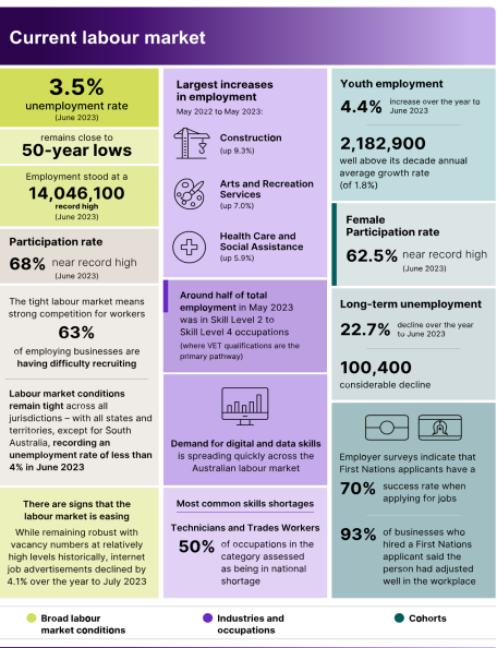 澳洲政府就在近期公布了2023年新一期的《年度职业与技能报告》。 根据这份报告可以分析获取澳洲紧缺职业的现状和发展趋势,从整体报告和清单列表中可以清晰看到哪个州的就业率最高,哪个职业的需求最大。此次整理出 10个目前澳大利亚的高需求工作 ,计划留澳工作的同学们可根据自身需求参考:这对于很多即将选择留学专业的同学来说也非常有参考意义。 澳洲劳动力市场现状根据报告,截止2023年6月,澳洲目前就业市场一些引人注意的数据如下: 目前失业率是3.5%,保持50年来最低; 就业人数达到14,046,100; 澳洲最普遍的技能短缺:技术人员和蓝领工人; 就业前景比较好的领域,分别是建筑、艺术、健康等; 数字化及数据技能的人才需求直线上升; 2022年5月至2023年5月就业增长最快的领域:建筑 9.3%;艺术与休闲服务 7%;医疗保健与社会援助 5.9%。 澳洲就业紧缺职业根据这份报告,2023年916个职业中,有332个职业被列为紧缺职业。Longer training gap 的需求量较大。在性别严重失衡的职业,短缺更为严重,例如金属装配工和机械师(女性劳动力的 2%)、汽车机械师(女性劳动力的 3%)和电工(女性劳动力的 2%),全澳以女性为主的劳动力短缺包括幼儿教师(男性劳动力的 3%)、儿童保育员(男性劳动力的 3%)和注册护士(男性劳动力的 13%)。 报告里也把澳洲的紧缺职业先分成了4个部分: