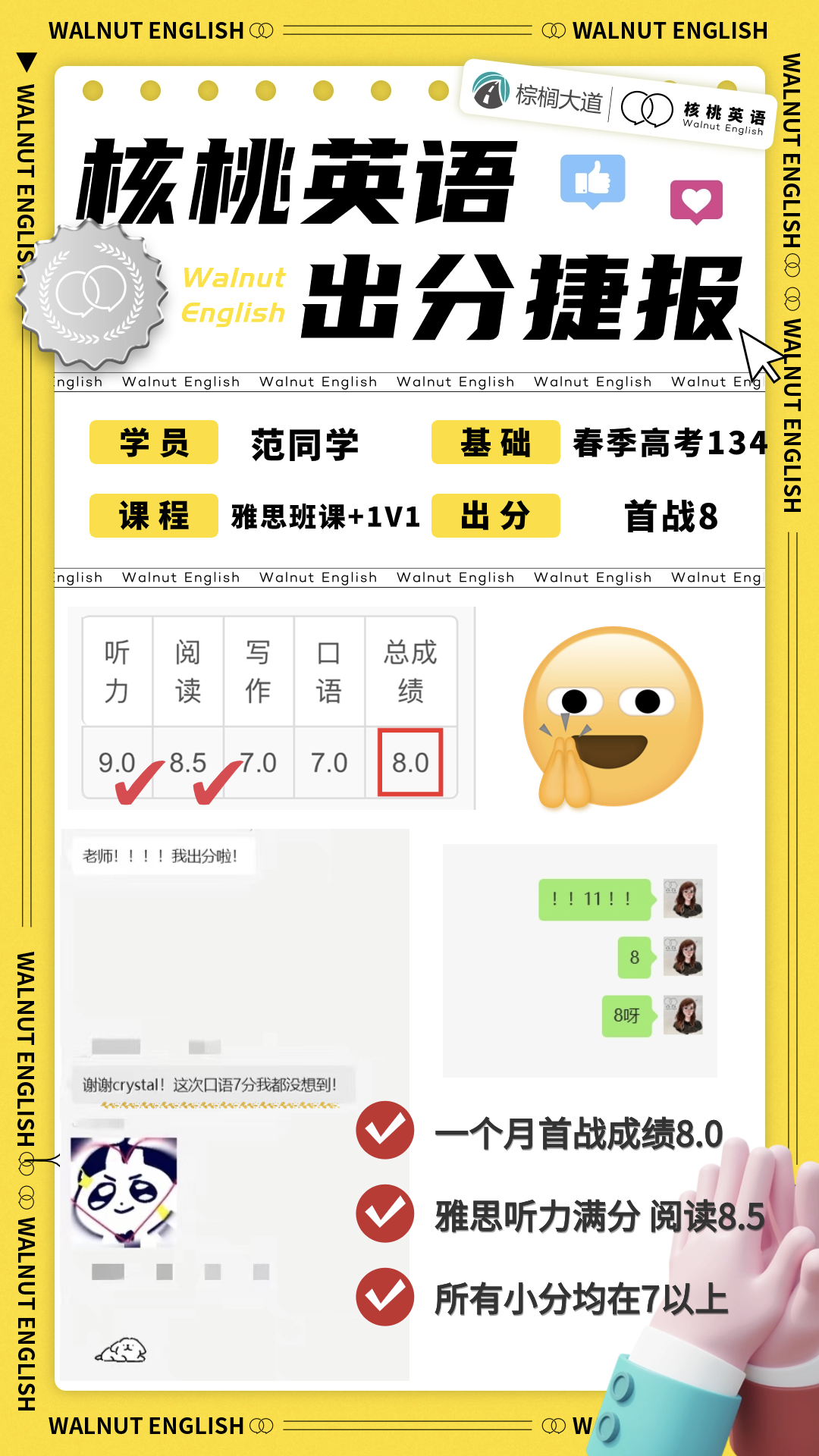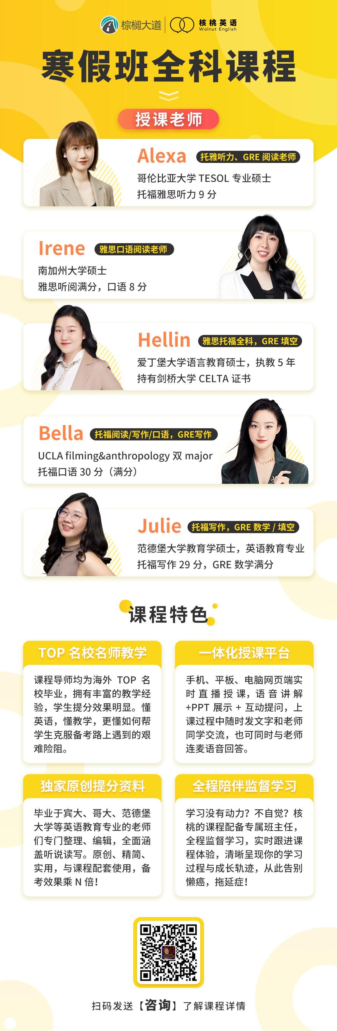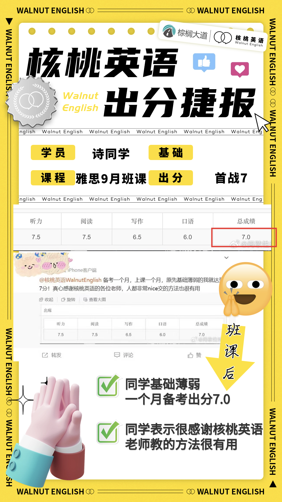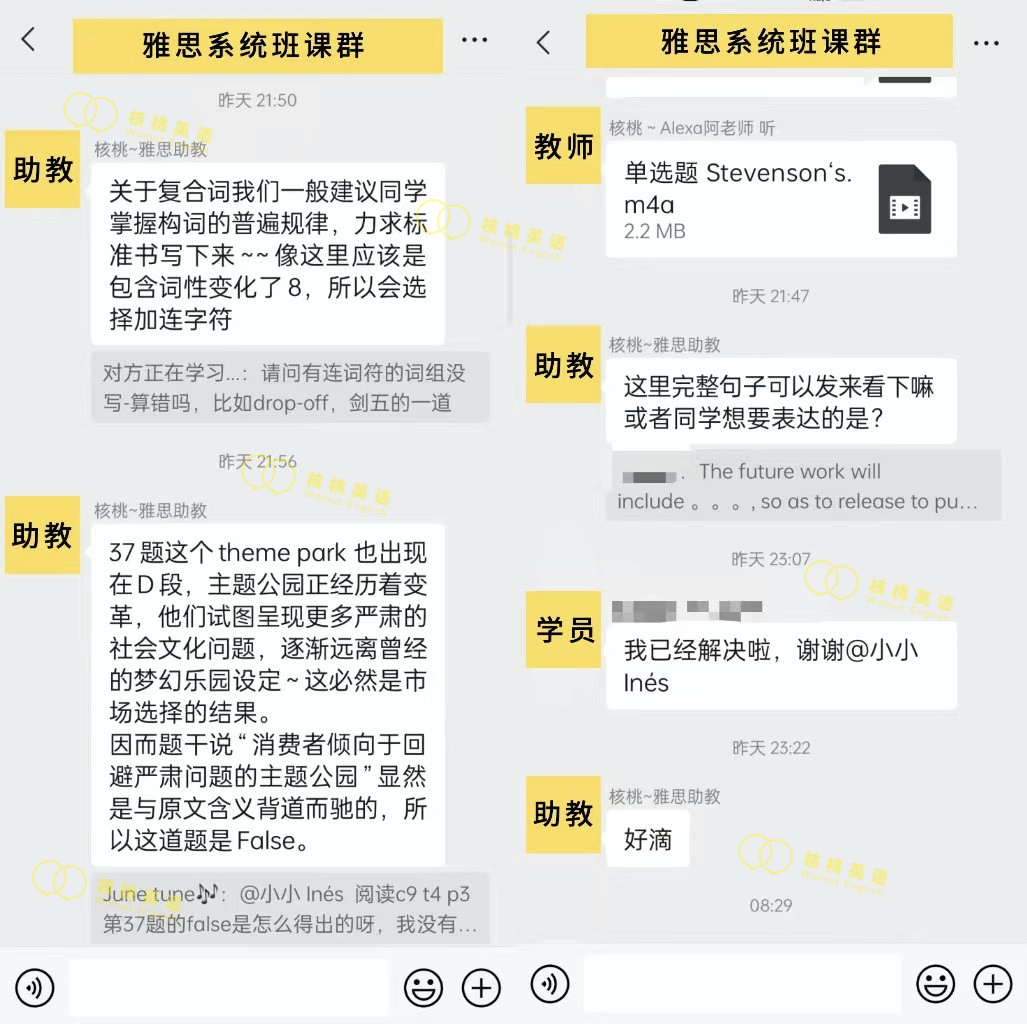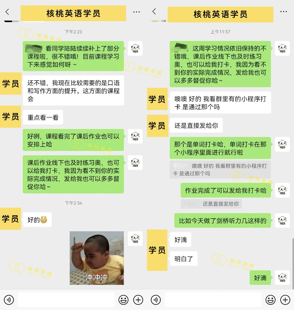 课程系统学习后 1次课后能力水平测试 自开课起(以课表第一节直播课时间为准), 回放6个月内有效,可反复学习考出成绩,领取高分奖学金。 课程还配有每日答疑(答疑时间直至结课后一个月)环节,全程陪伴监督,班主任叮嘱学习打卡与单词打卡,日常push学习。   针对不同基础的同学,我们配有不同的班型~ 除系统班外,还有全程班、冲分班、定制化一对一等等,确保每一位同学都能找到适合自己的课程。 学员近期出分一览 (点开可查看大图)             不要再担心自己的基础弱跟不上  不用害怕动辄上万的课程费用钱包一紧  更不用怕懒癌上线没人督促学习 这些问题,只需添加皮皮小助手👇都可以帮你解决~  ↑添加核桃皮皮,回复【寒假班】  期待大家寒假来核桃一起快乐学习哟!   |