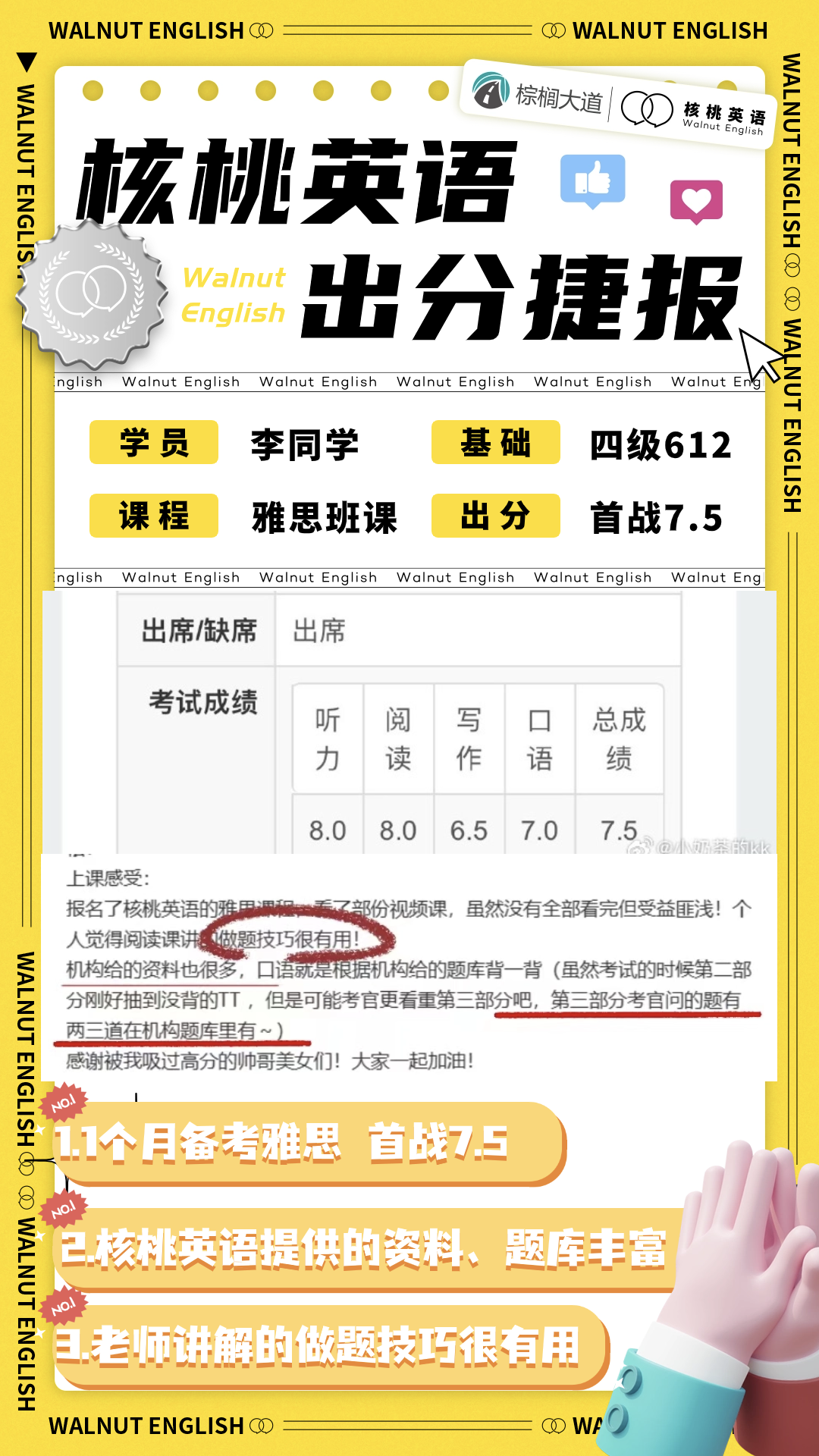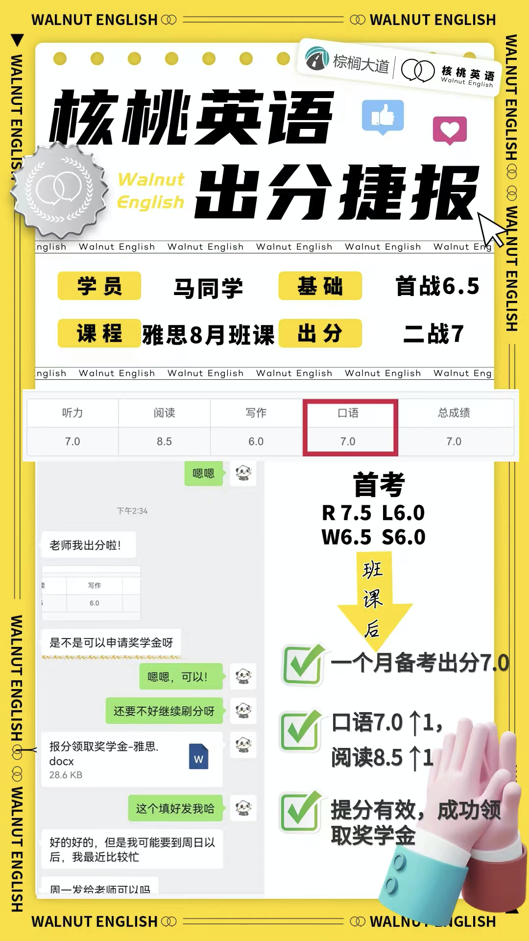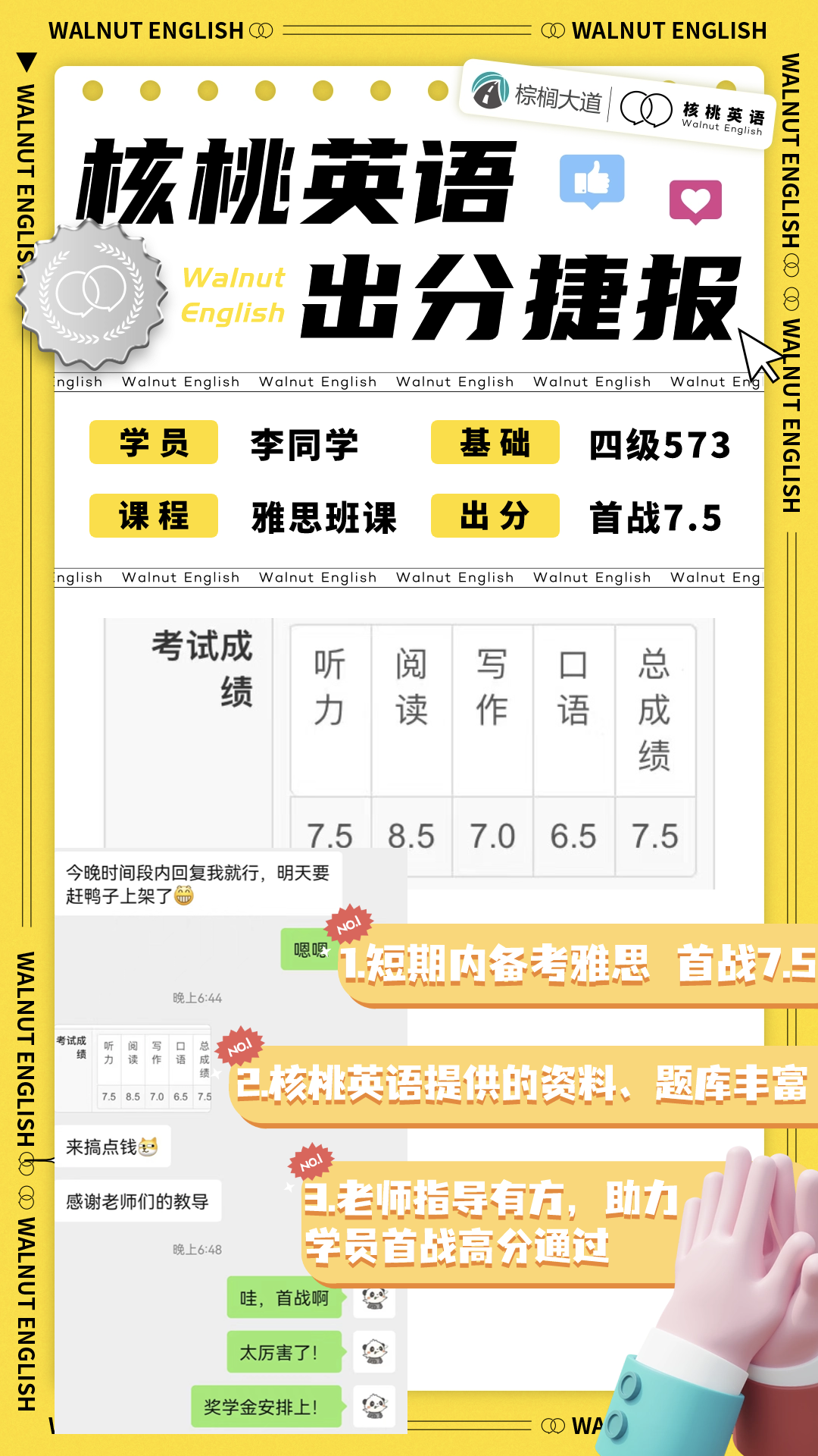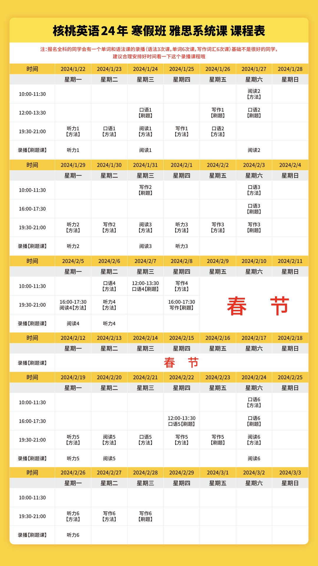 课程系统学习后 1次课后能力水平测试 自开课起(以课表第一节直播课时间为准), 回放6个月内有效,可反复学习考出成绩,领取高分奖学金。 课程还配有每日答疑(答疑时间直至结课后一个月)环节,全程陪伴监督,班主任叮嘱学习打卡与单词打卡,日常push学习。   针对不同基础的同学,我们配有不同的班型~ 除系统班外,还有全程班、冲分班、定制化一对一等等,确保每一位同学都能找到适合自己的课程。 学员近期出分一览 (点开可查看大图)             不要再担心自己的基础弱跟不上  不用害怕动辄上万的课程费用钱包一紧  更不用怕懒癌上线没人督促学习 这些问题,只需添加皮皮小助手👇都可以帮你解决~  ↑添加核桃皮皮,回复【寒假班】  期待大家寒假来核桃一起快乐学习哟!   |