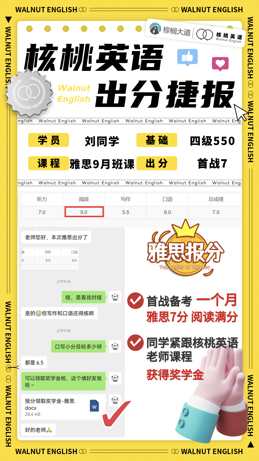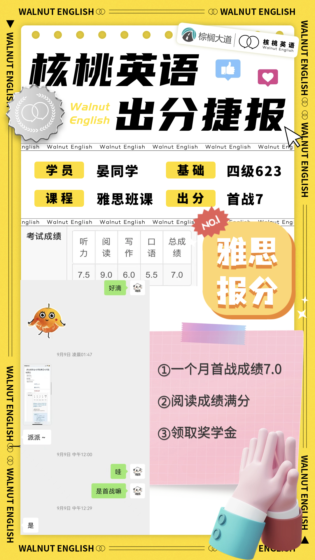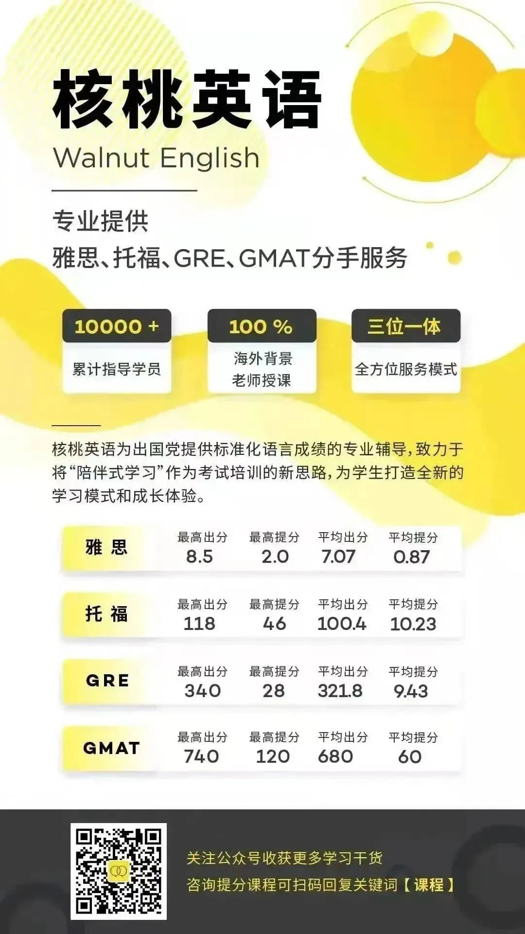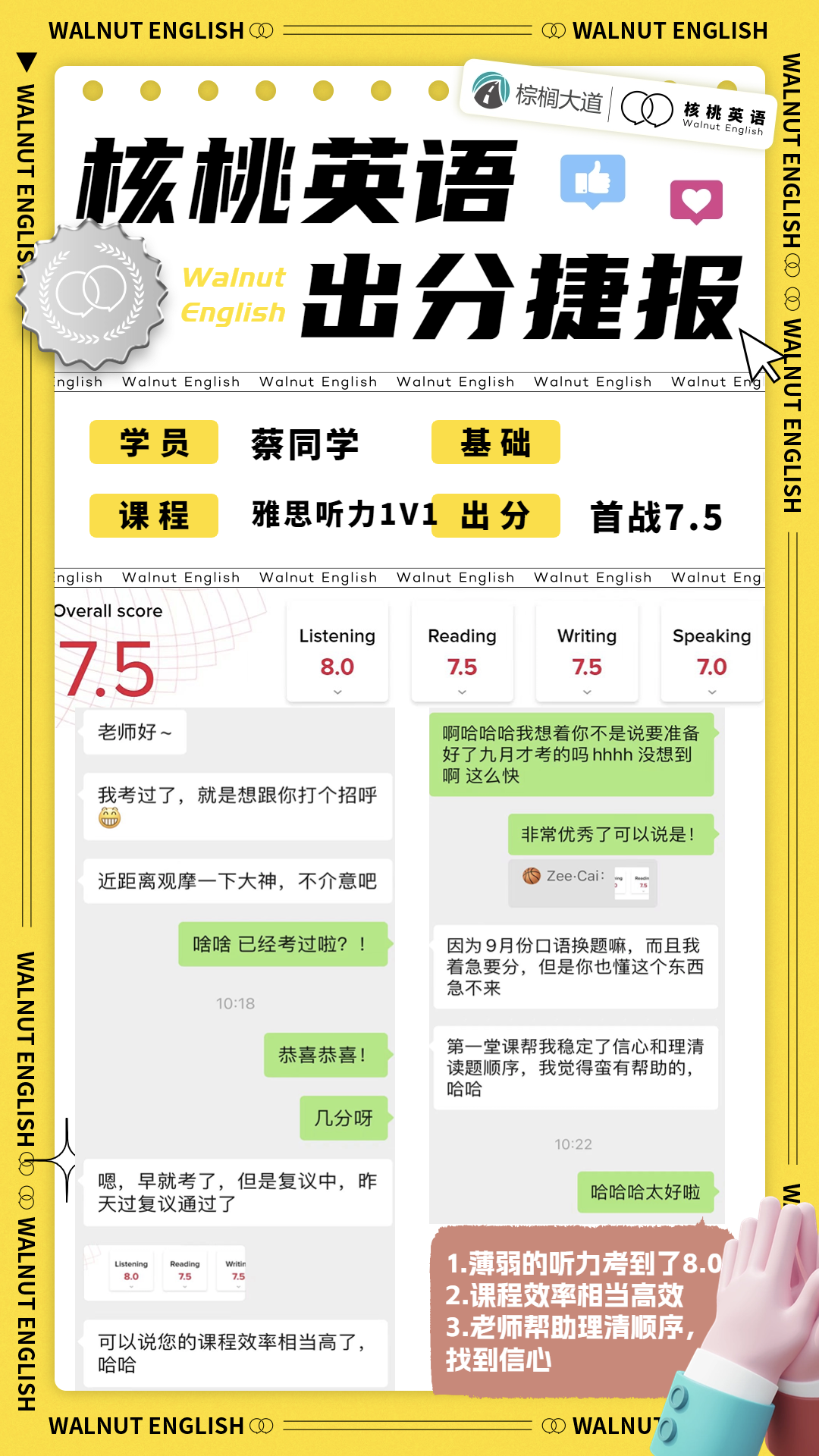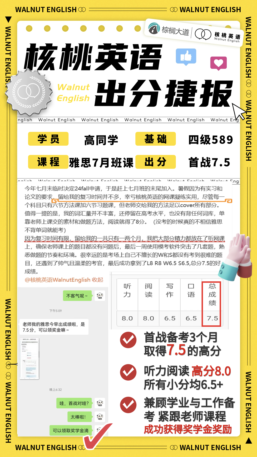 课程系统学习后 1次课后能力水平测试 自开课起(以课表第一节直播课时间为准), 回放6个月内有效,可反复学习考出成绩,领取高分奖学金。 课程还配有每日答疑(答疑时间直至结课后一个月)环节,全程陪伴监督,班主任叮嘱学习打卡与单词打卡,日常push学习。   针对不同基础的同学,我们配有不同的班型~ 除系统班外,还有全程班、冲分班、定制化一对一等等,确保每一位同学都能找到适合自己的课程。 学员近期出分一览 (点开可查看大图)             不要再担心自己的基础弱跟不上  不用害怕动辄上万的课程费用钱包一紧  更不用怕懒癌上线没人督促学习 这些问题,只需添加皮皮小助手👇都可以帮你解决~  ↑添加核桃皮皮,回复【寒假班】  期待大家寒假来核桃一起快乐学习哟!   |