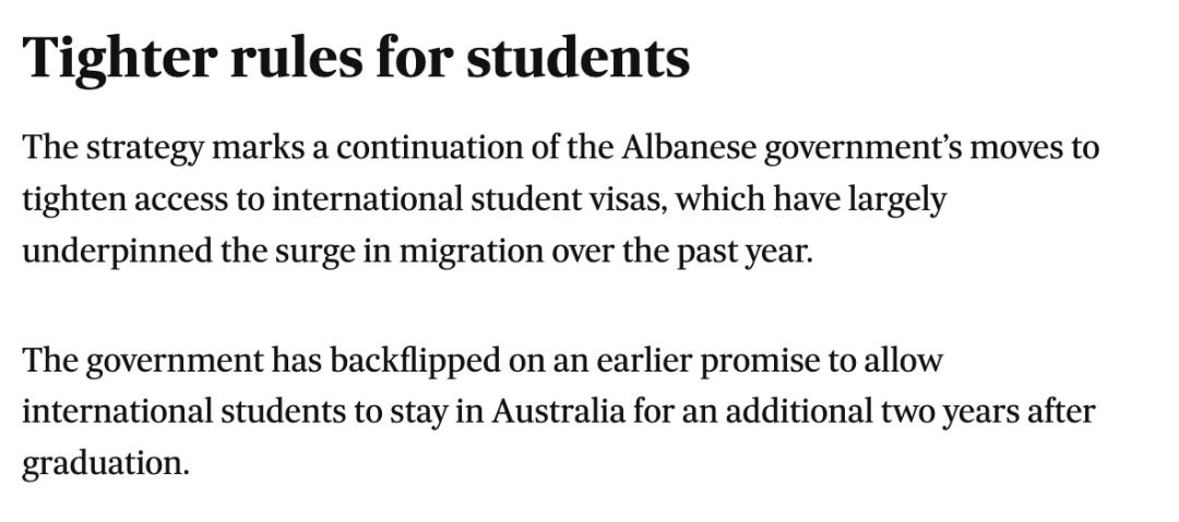![]() 继英国移民政策大变革之后, 新一轮澳洲的移民政策改革也如期而至, 这次改革被认为是近年来最为重大的一次调整! 总目标:净移民从51万减少到25万,直接砍半!当前财年澳洲移民净流入为每年51万,大大超出澳政府预期,目标是2025年至少减少一半移民净流入。 接下来一起来看看此次改革的关键措施以及留学相关政策举动吧~ 01 移民改革中的关键措施 ![]()