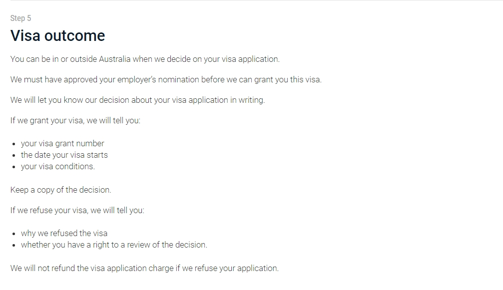 提醒:一次性缴纳,拒签不退 ![]() 04.申请签证 ![]() 当申请人将上述文件准备妥当,就可以递交签证申请; 申请人自己或者让移民代理人进行材料递交,并且支付相关的签证费; 签证费:2023-2024年的签证费主申请人费用在4640澳币,18岁以上副申请人费用2320澳币,18岁以下副申请人1160澳币; 签证费可以通过多种方式支付:信用卡;PAYPAL;银联;BPAY; ![]() 05.申请签证后 ![]() ![]() ![]() 申请签证后,申请人一般可以准备体检,同时看移民局是否要求更改或补交相关证明材料,等待下签; ![]() 06.下签 ![]() 下签时,申请人可以在澳洲境内或澳洲境外; 澳洲移民局必须在批准你的雇主提名后才能给你签证。 如果澳洲移民局批准您的签证,你会收到: