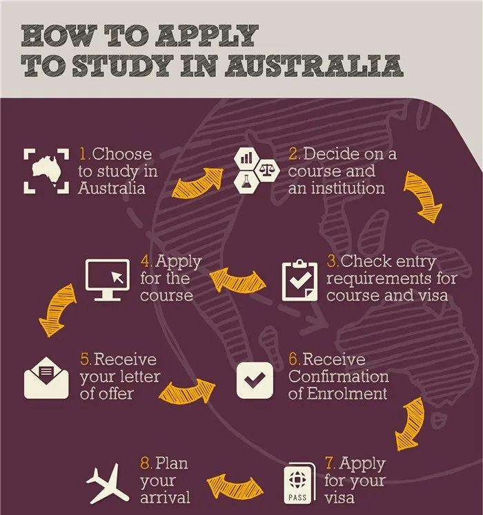 ![]() 澳大利亚大学通常有两个开学季,大多数是在二月和七月,每一个学期大约有13个星期的课程和2个星期的考试准备时间。一般澳洲留学的申请需要提前一年甚至一年半进行,这样可以让你有充足的时间准备好相关资料。下面一起来和小编了解下澳洲留学申请的流程: 留学澳大利亚,基本步骤如下所示: 1、Choose to institution and course 选择院校和课程 2、Check entry requirements for course 检查课程入学要求 3、Apply for the course 申请课程 4、Receive your letter of offer 收到你的录取通知书 5、Payment and sign your offer 支付学费和签署录取通知书 6、Receive Confirmation of Enrolment 收到入学确认书 7、Apply for your Visa 申请签证 8、Plan your arrival 做好到达计划 需要向澳洲大学提交入学申请,并向澳政府申请学生签证: