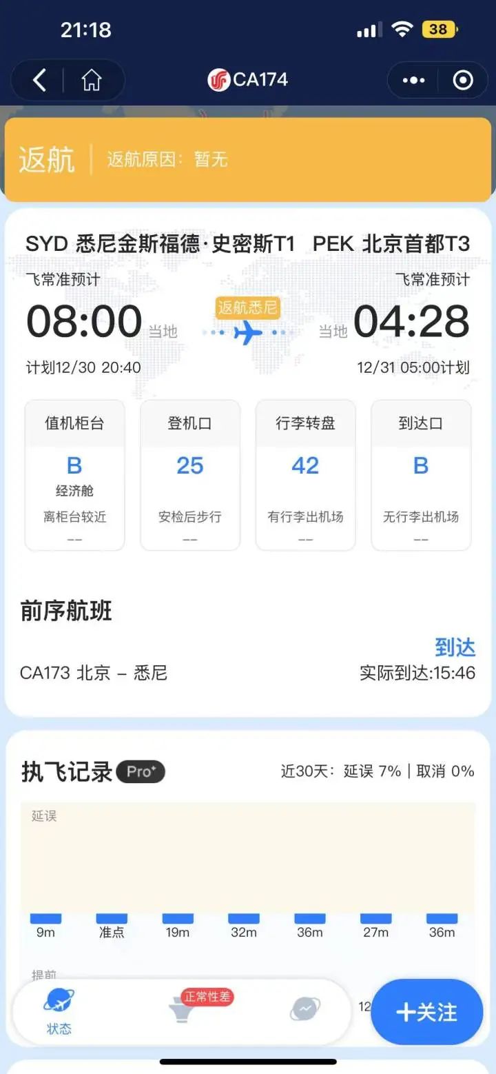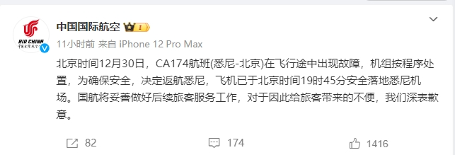 ![]() 12月30日晚,中国国际航空官方微博发布消息:北京时间12月30日,CA174航班(悉尼-北京)在飞行途中出现故障,机组按程序处置,为确保安全,决定返航悉尼,飞机已于北京时间19时45分安全落地悉尼机场。国航将妥善做好后续旅客服务工作,对于因此给旅客带来的不便,我们深表歉意。 ![]() 当晚,有网友发帖称,飞了大概70分钟的时候,机长广播说因为飞机出现故障要马上飞回悉尼。于是,飞机开始全速返航,期间应该是受气流影响,颠簸不断,明显可以感觉到飞机在加速,心里着实有点害怕。大概30分钟就降落回悉尼机场了。 ![]() ![]() ![]() ![]() 红星新闻报道,一位乘坐了该航班的中国乘客告诉记者,工作人员已为她解决了住宿问题,同时安排好新的航班,也是飞往北京的。12月30日21:57,该名乘客表示,CA174航班乘客们正在排队扫描工作人员提供的打车优惠券。 航旅纵横App显示,该趟航班计划于北京时间12月30日17时53分起飞,12月31日6时17分到达。据飞常准App显示,承载该航班的飞机机型为波音777–39L,机龄7年。 ![]() ![]() ![]() 更多新鲜事 关注浙江在线视频号 大家都关注 央视前“名嘴”向体育总局原高官行贿逾950万元 捕食了73号东北豹的东北虎是谁?虎豹专家已查明 被免职13天后,孙东旭重回直播间 缅北战事造成中方人员伤亡,外交部回应 来源:中国国际航空官方微博、红星新闻、每日经济新闻 编辑:庞舒青 责编:黄咏 版权归原作者所有,如有侵权请及时联系。 ![]() |