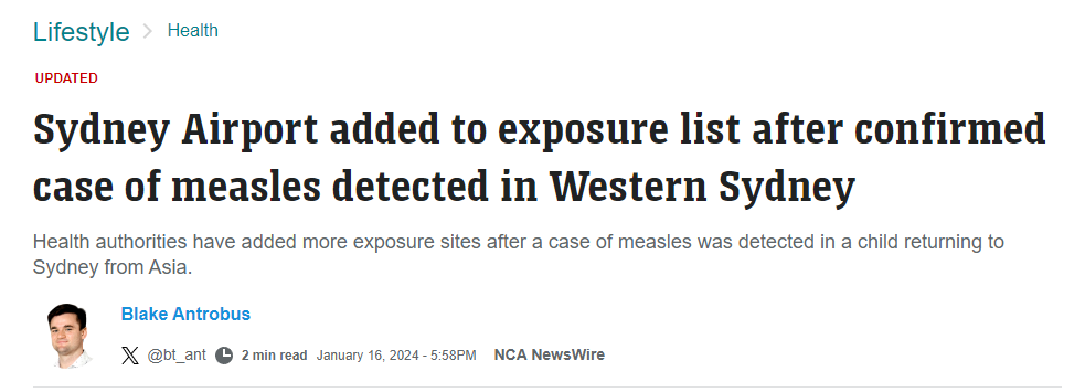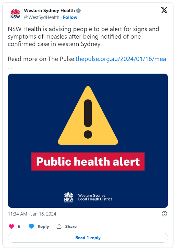 ![]() ![]() 自新冠疫情慢慢消散以后,有一个词语相信大家已经很少听说了,可就在刚刚,这个词语再次刷屏: 悉尼机场被列为危险暴露点! ![]() 新州卫生部紧急发布警告: 出现在悉尼机场的民众,赶紧自查,可能已经感染!严重可致命,儿童最危险! ![]() 婴儿确诊高危传染病 悉尼机场成危险暴露点 新冠疫情之后,很少有病毒让澳洲如此风声鹤唳,多年疫情的洗礼,已经让澳洲政府和民众对病毒有了抵抗力... 但是,这一次情况不同! ![]() 根据报道,迪拜飞悉尼的航班上,一个年仅9个月大的婴儿 确诊了麻疹! 不要以为麻疹只是个过敏性传染病,它的威胁远超想象。 ![]() 以至于新州卫生部立刻发布了紧急警告,将两处地点列为高危暴露点: · 从迪拜飞往悉尼的阿联酋航空EK 416航班,1月10日下午6:36抵达悉尼 ; · 悉尼机场:1号航站楼国际到达处(包括行李提取处和海关),时间为1月10日下午6:36至晚上9点。 ![]() 为了确保病毒不会扩散,新州卫生部已经全面追踪确诊婴儿的具体行踪。 1月12日下午3时至5时,确诊病例曾到访位于Lakemba的Yerrick Rd的Five Star Coffee和坚果杂货店。 卫生部已经确定并联系了与婴儿有过密切接触的所有人,以便在必要时安排预防性治疗。 ![]() 卫生部发言人表示:虽然这些地点不会对公众构成持续风险,但是官方仍呼吁去过Lakemba商店的人注意自己的症状。 ![]() 麻疹具有一定时间的潜伏期,一旦爆发,症状包括发烧、眼睛痛和咳嗽,通常三四天后会出现红色斑点状皮疹,从头部蔓延到身体其他部位。 但是, 潜伏期可能长达18天之久... ![]() 麻疹病毒可以通过空气传播,一旦流入社区,可能会导致大量感染病例出现,再加上超长的潜伏期,很多人不知不觉间就可能传染他人。 ![]() 为什么新州卫生部对于麻疹如此警惕,麻疹只是名字看起来普通,但威胁极大的病毒,尤其针对儿童。 严重了可以致命,每年都有很多人因麻疹丧命! ![]() 小悉帅每天第一时间跟大家分享悉尼最新的大事小事,记得关注悉尼生活资讯,接下来那些吃喝玩乐奇闻趣事跑不了的! ▼长按这个二维码▼ 悉尼新闻抢先知道! ![]() 诱发严重并发症 可危及生命 麻疹是一种传染性极强的病毒性传染病,任何年龄的人都可能感染。它会使人体的免疫功能发生紊乱,导致皮肤瘙痒、腹痛恶心,再严重一些, 可引发致命并发症,急性肺炎和严重脑炎! ![]() 还有一个数据统计: 在2015年,平均每天都有367人死于麻疹… 麻疹是造成儿童死亡的主要传染病…没有之一! ![]() 很难相信这个数据吧,这些看似不起眼的红疹子,竟然是致命的信号... 很多人因为缺乏对麻疹的了解,并不知道这些这些小红疹意味着麻疹病毒已经入侵皮肤、淋巴,甚至血液… ![]() 也正是因为不少人轻视了麻疹病毒,导致错过了最佳治疗时间,让麻疹引发了严重并发症, 最终因肺炎或脑炎,危及生命! ![]() 还有一些人认为,自己接种过麻疹疫苗,是不是就没有感染风险了?虽 大家需要明确一点, 麻疹疫苗并不能完全预防感染! ![]() 预防麻疹使用的疫苗全称为麻疹腮腺炎德国麻疹混合疫苗(Measles-Mumps-Rubella vaccine, MMR疫苗)。 打完后对麻疹和德国麻疹的预防率理论上达到96%,对腮腺炎的预防率也有88%。 ![]() 可问题是,澳洲有不少人根本没打这个疫苗...特别是在1966年到1994年之间出生的澳洲人, 麻疹疫苗接种率更低! ![]() 不过麻疹疫苗还是非常重要的,这也是最有效、最安全预防麻疹的保护措施。 目前,麻疹疫苗已列入国家免疫计划(NIP),接种对象为12个月和18个月的儿童。 ![]() 据联邦卫生保健部的数据,澳洲所有5岁儿童的免疫接种覆盖率为94.04%。 但依然不是百分之百...代表着,仍然有儿童存在感染风险! ![]() 总之,赶紧检查一下自己有没有打过麻疹疫苗吧! 没有的话可以找GP尽快安排一下! 即使打过疫苗, 最近也少去人多的地方浪啦! 不怕一万,就怕万一啊! 希望这次麻疹病毒不要扩散, 尽快消散! Perfect Lover 澳洲最大华人婚恋交友平台 如果单身的你在澳洲苦苦找不到幸福,那你一定错过了Perfect Lover,因为这是你找到爱情的最“完美”捷径。 这里有最庞大的澳洲华人单身男女数据库 这里有最专业的红娘一对一服务 这里有最高效的配对机制 这里有最丰富的交友活动 最最重要的是: 这里有最高的脱单率! ![]() 如果你真心想要寻找心中的“Perfect Lover”,如果你正好在澳洲,那就先从Perfect Lover开始! Perfect Lover公众号 每周都会推荐心动男生/女生 关注Perfect Lover公众号 给自己一次心动的机会! ![]() 扫码添加小红娘微信 ![]() 说出你的要求和条件 为你匹配Perfect Lover! (本文图片来自网络) ![]() ![]() ![]() ![]() ![]() ![]() ![]() 告诉大家一个了解悉尼生活资讯的小诀窍。现在只要点亮一个小星星🌟,每天就能在第一时间看到各种最新鲜的资讯!悉尼哪里打折💰,哪里有好玩的活动🎉,哪里的餐厅最实惠🍰,哪里有同乡聚会👬,还有悉尼各种政策福利、隐藏技能,全都知道啦! ![]() 悉尼人都爱看的 悉尼生活资讯 ![]() 惋惜!澳洲最长寿110岁老人突然离世!如果不是这个可恶的凶手,他本可以活得更久…![]() 澳洲躺平以来最大好消息!变异毒株开始稳定,确诊大幅下降!疫情宣告尾声!多国彻底放开国境!![]() 国际巨头预测:2023年中国开放国门!3个月,7条重磅利好消息!距离国境解封,可能真的不远了 ![]() 澳洲街头惊现大量恶霸!可能就藏在你家拐角!上千人被突然袭击,有人头破血流,险些毁容… ![]() 高